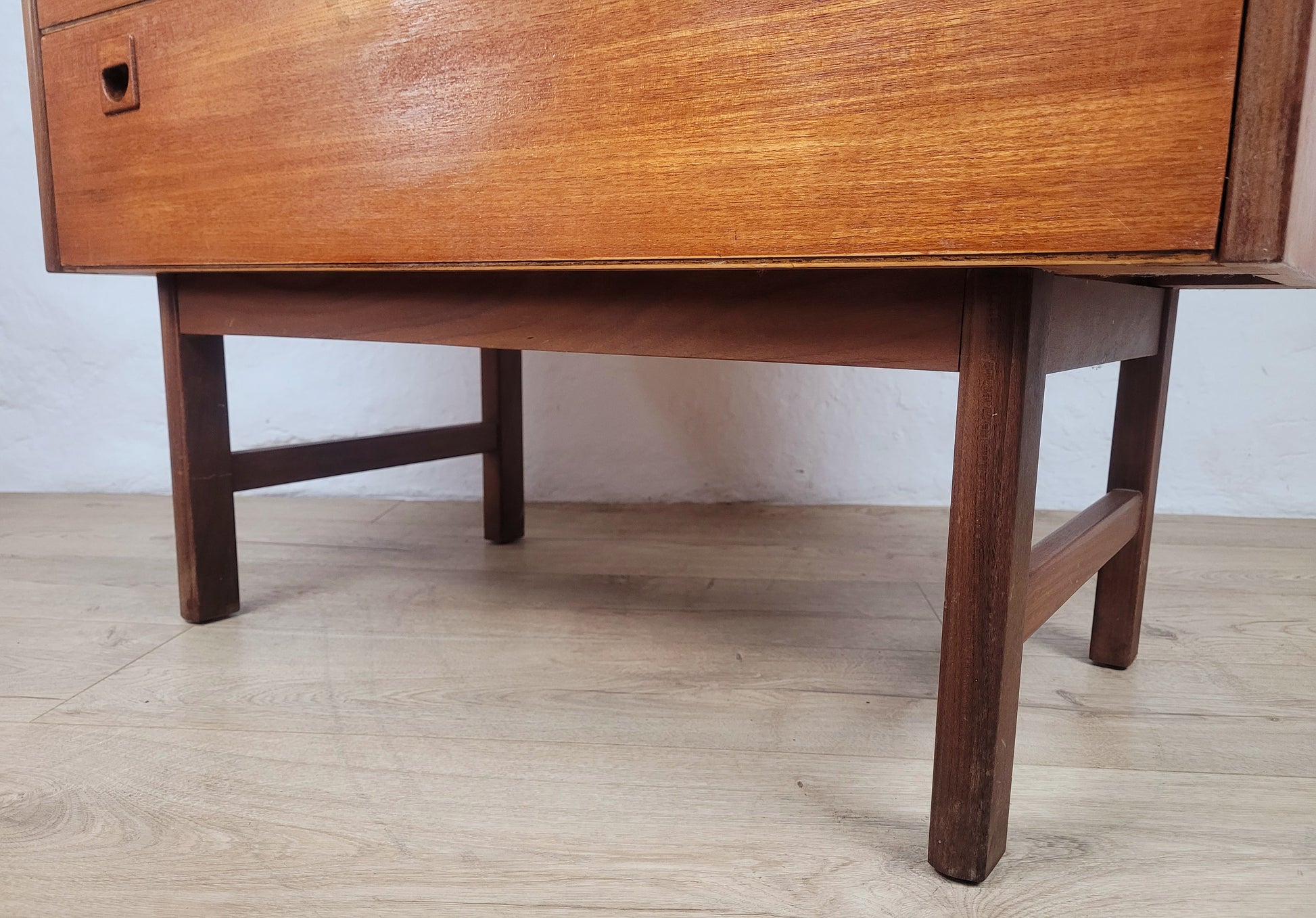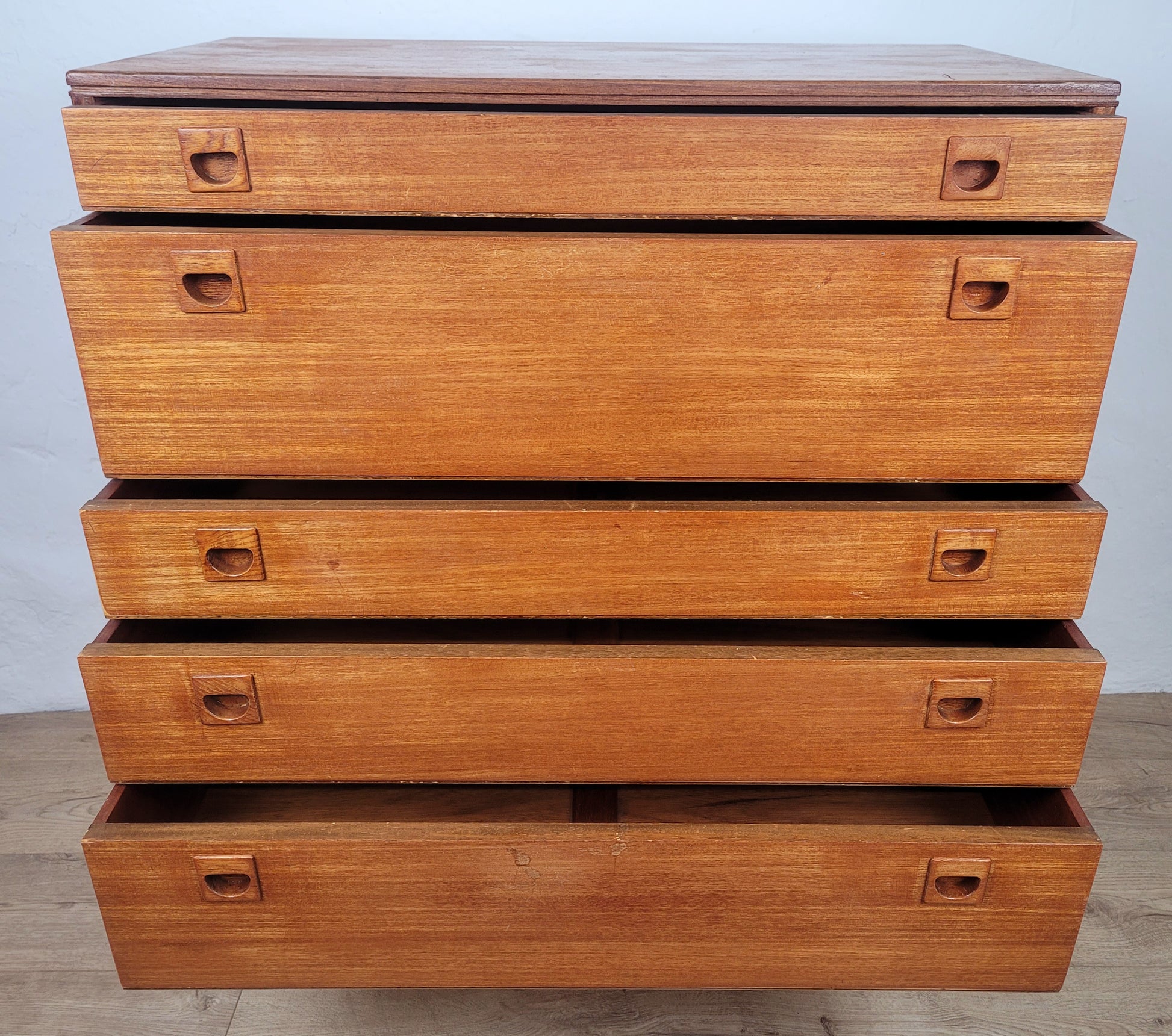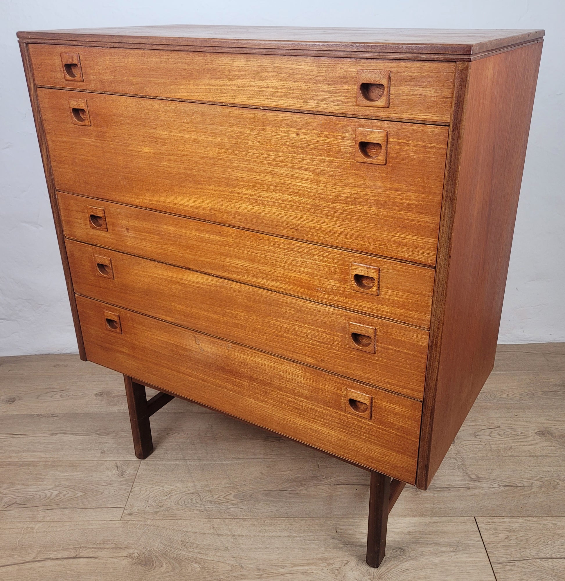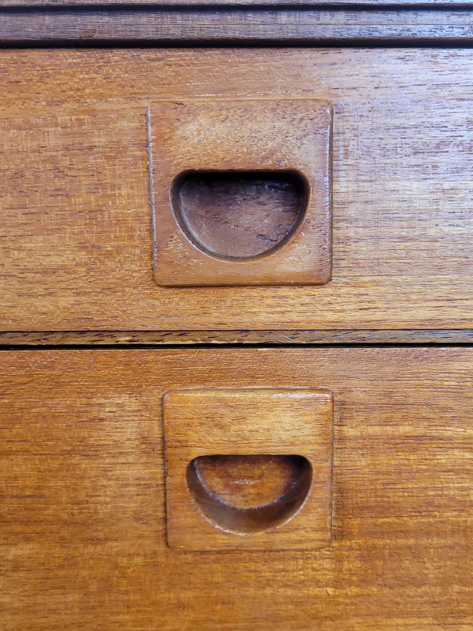 The 5 drawers all have gorgeous carved teak pocket handles, a wonderful feature of this chest of drawers. All of the drawers vary in height. The front of the chest displays a beautiful rich teak patination.