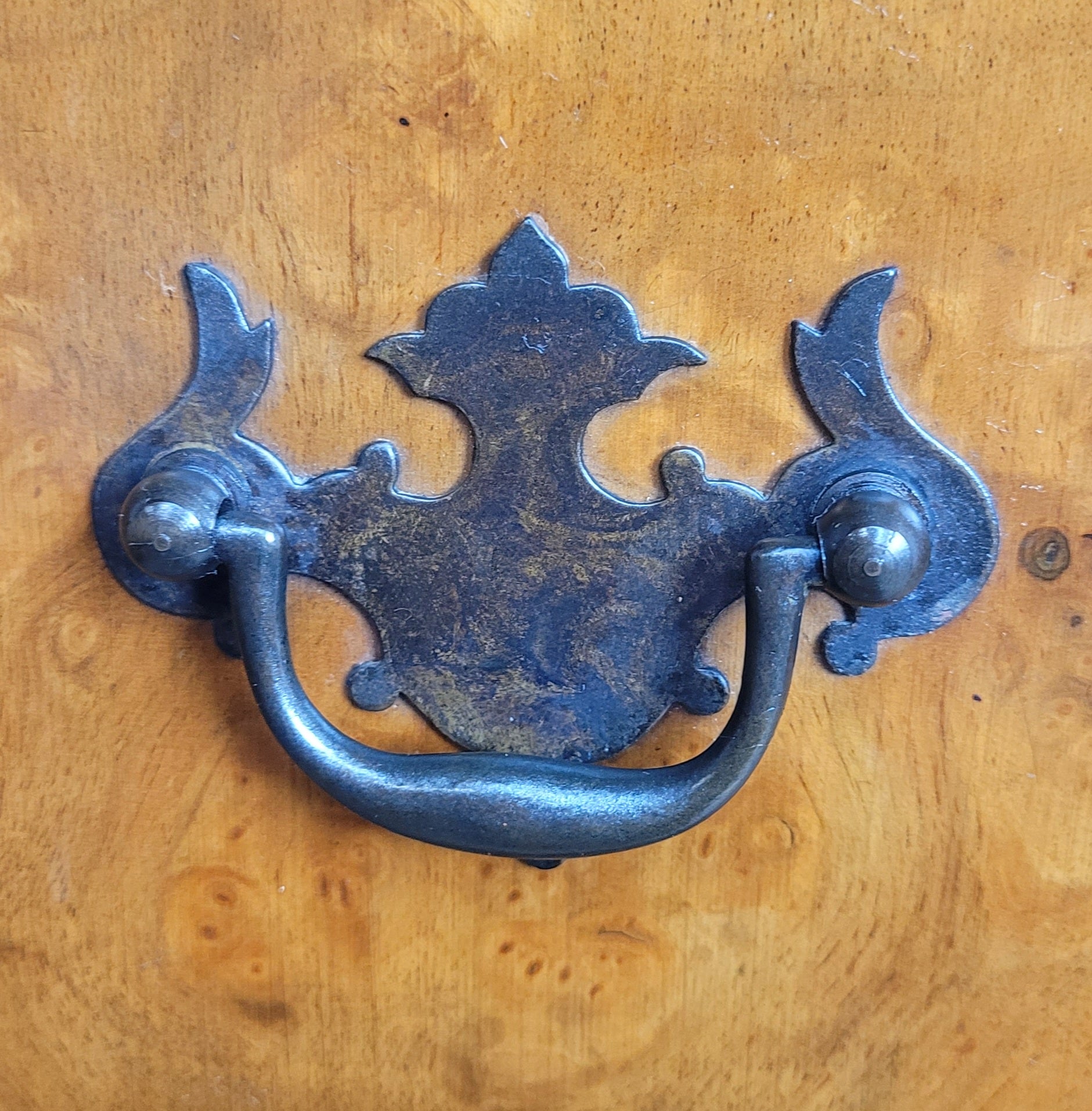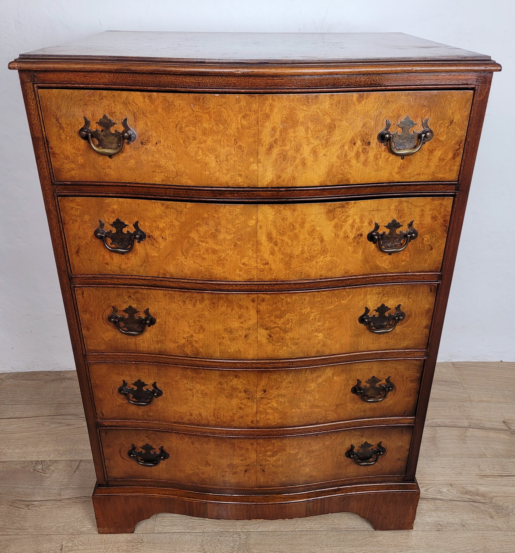 The front of the chest has fix serpentine shaped drawers, all the drawers have stunning batwinged shaped drop handles.