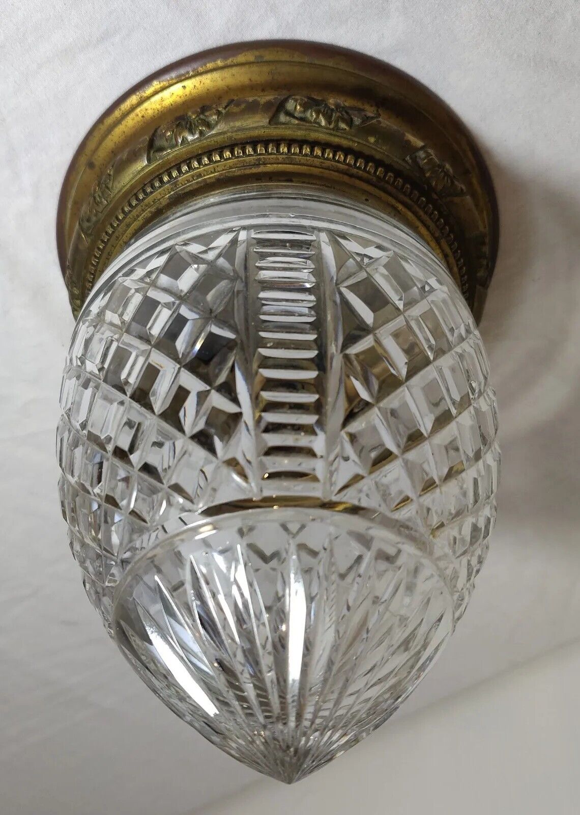 This is a Charming circa 1890 Victorian Repoussé flush mounted light brass fixture, circled by repoussé floral decoration and finished with unusually deep cut-glass dome.