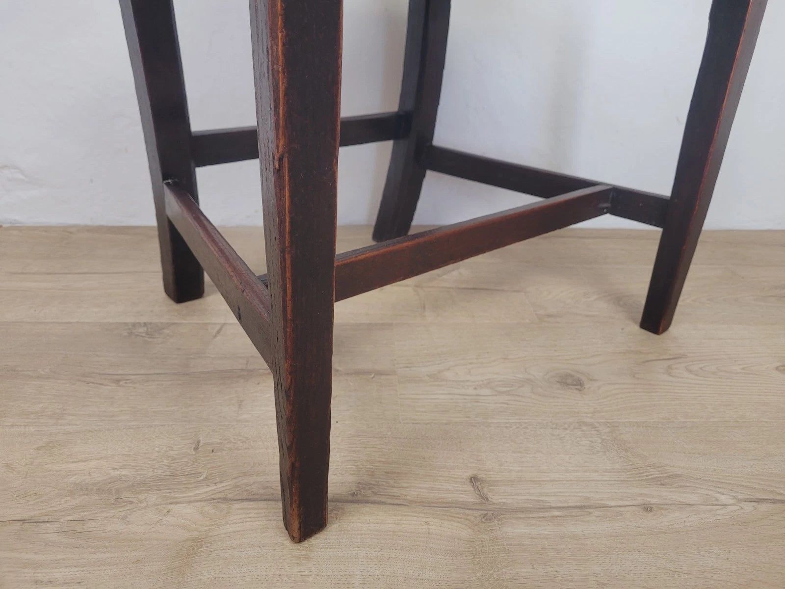 The solid square front legs are connected to the back legs with a lower solid H-frame stretcher, and a solid square back stretcher.