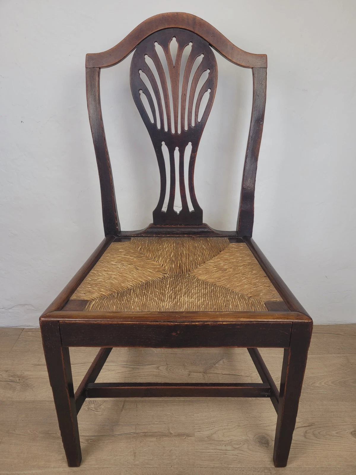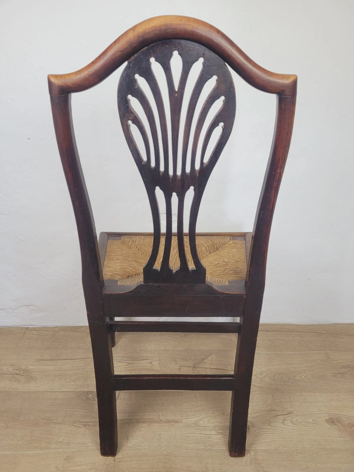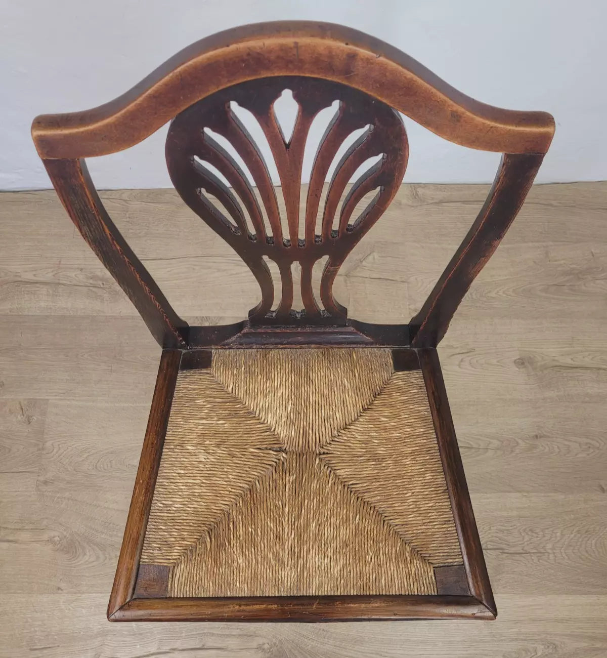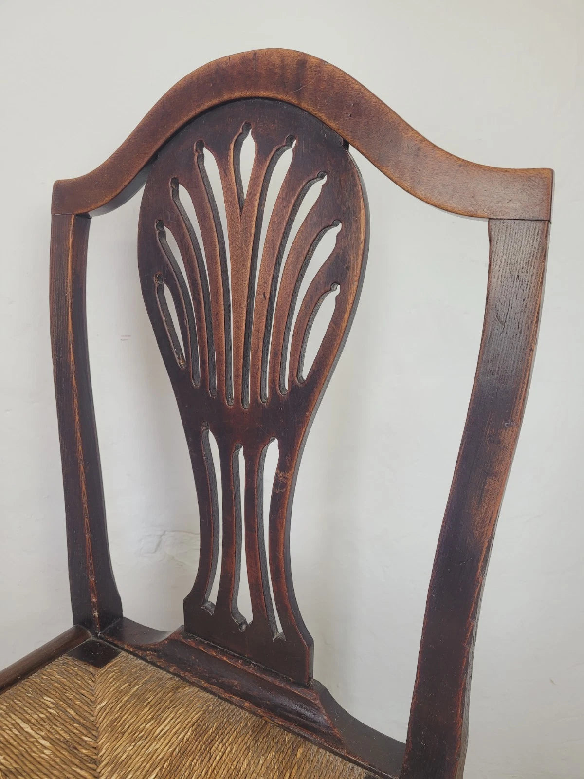 With a excellent carved pierced splat back with a wheat like design, that has a fantastic curved upper rail and two side rails. The side rails leads down to form the 2 solid square back legs.