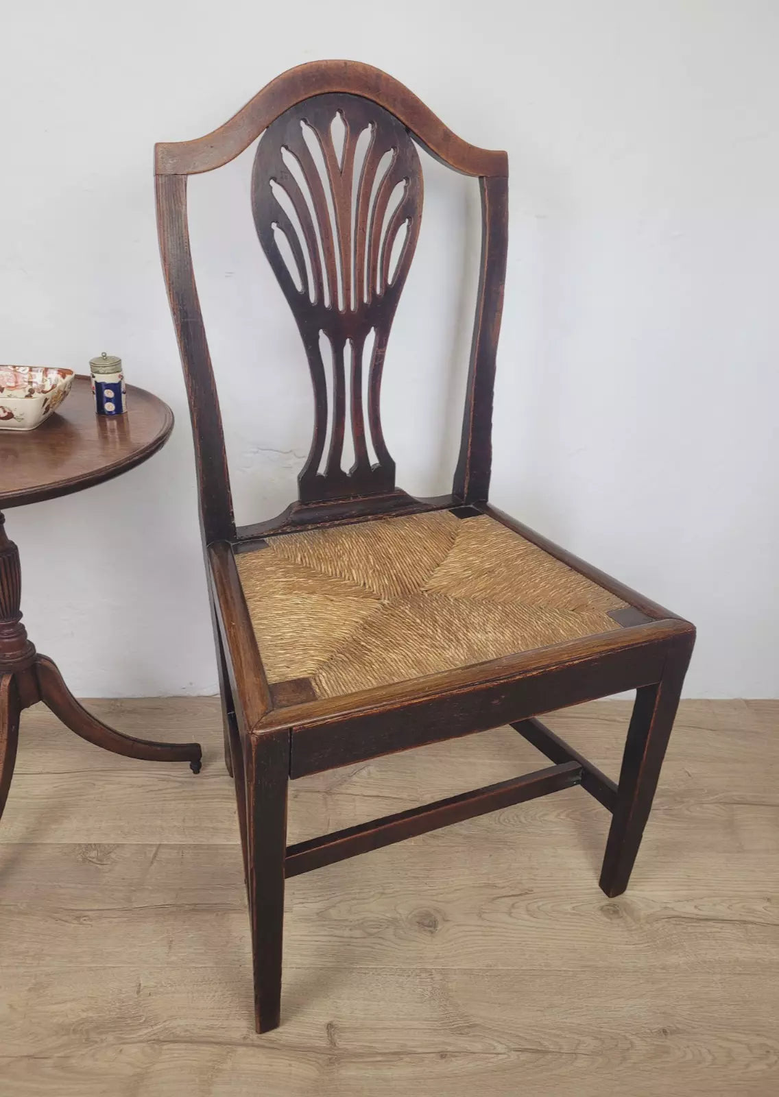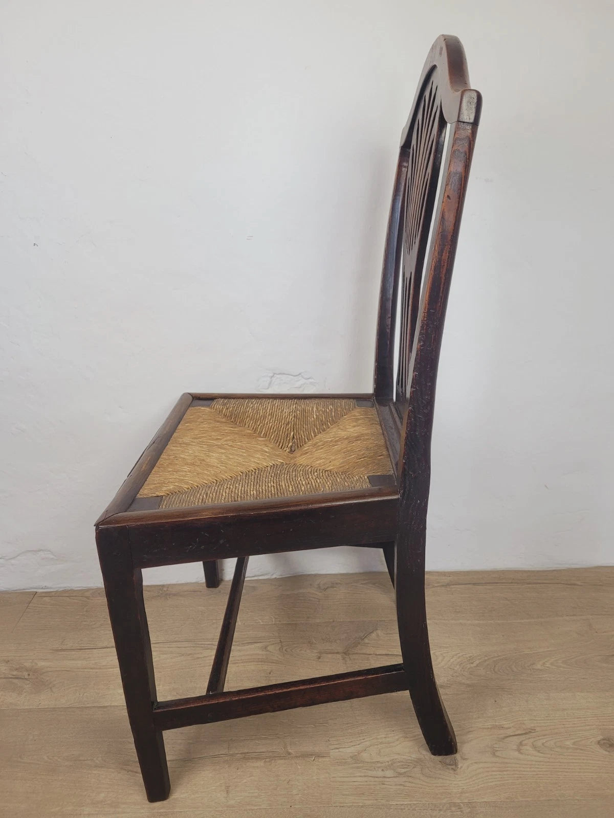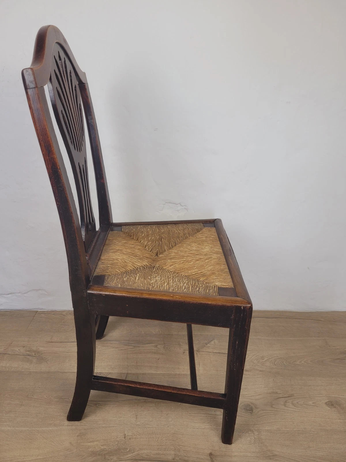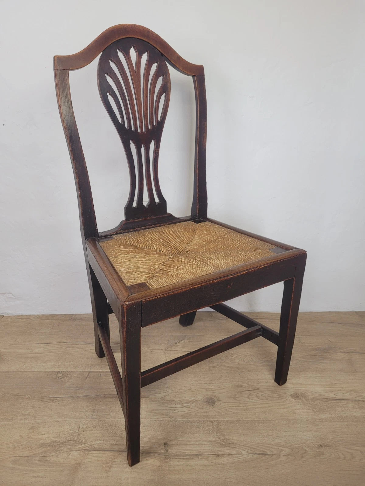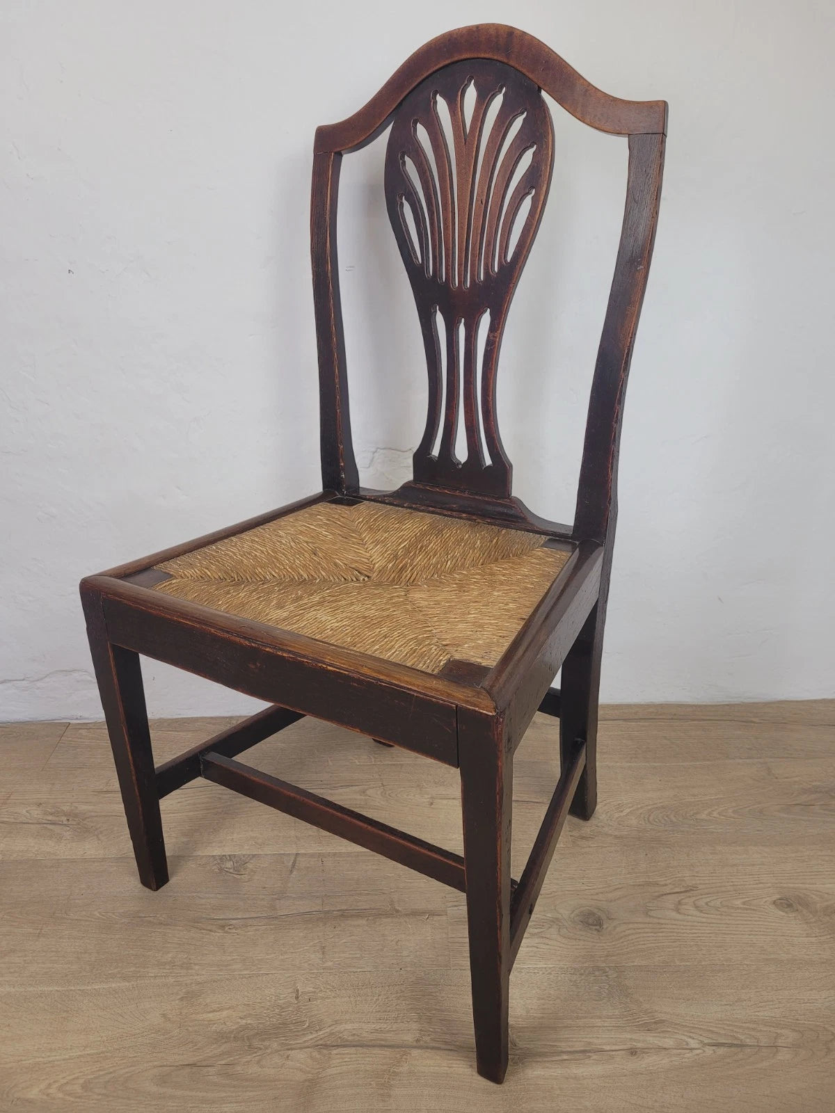 With a excellent carved pierced splat back with a wheat like design, that has a fantastic curved upper rail and two side rails. The side rails leads down to form the 2 solid square back legs.