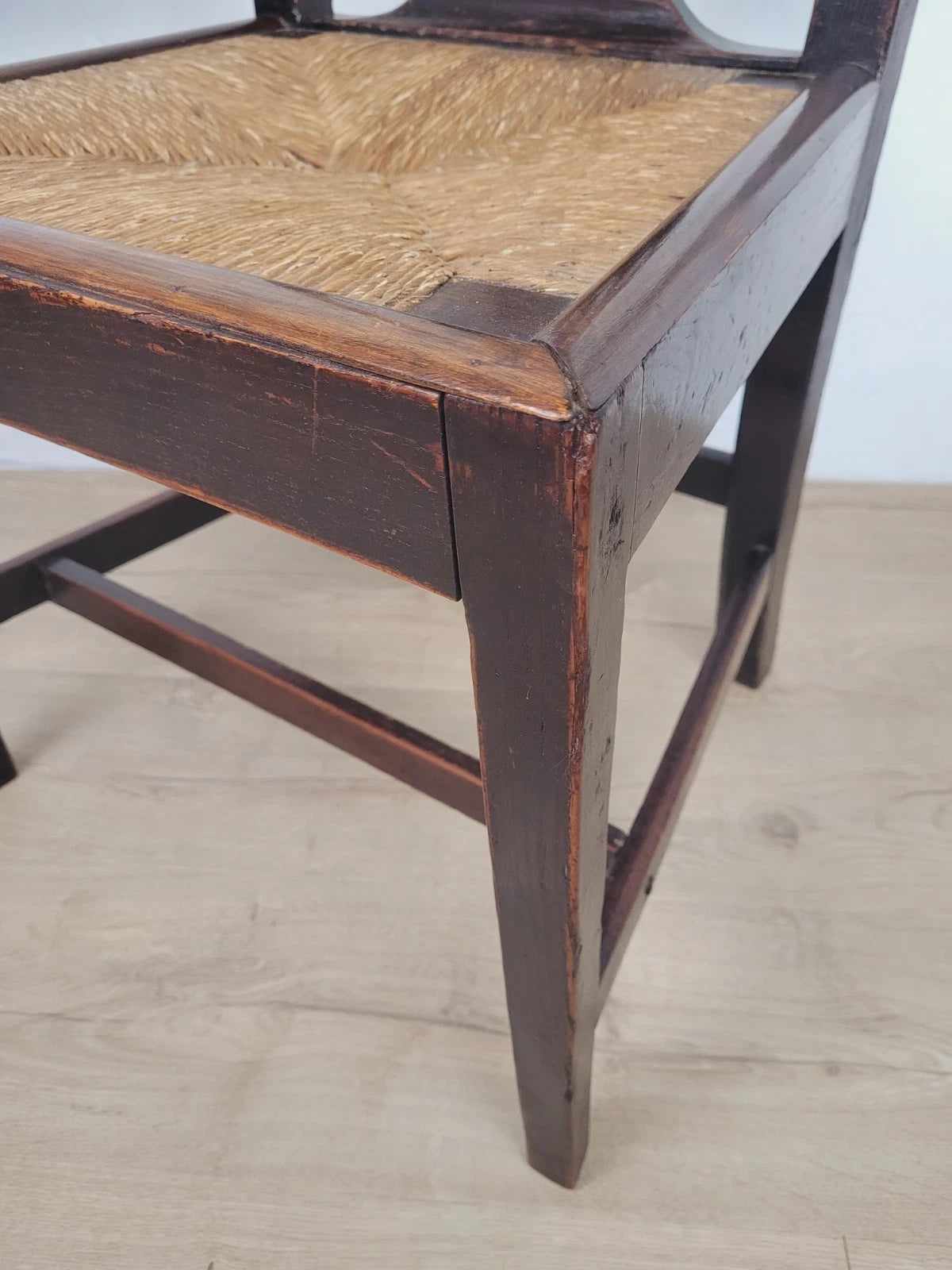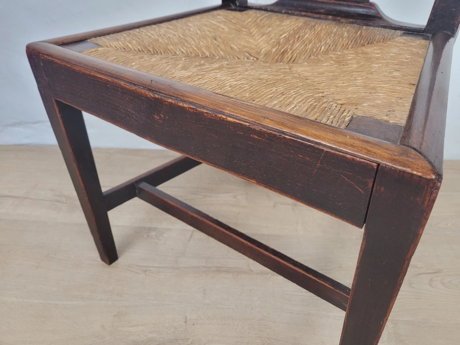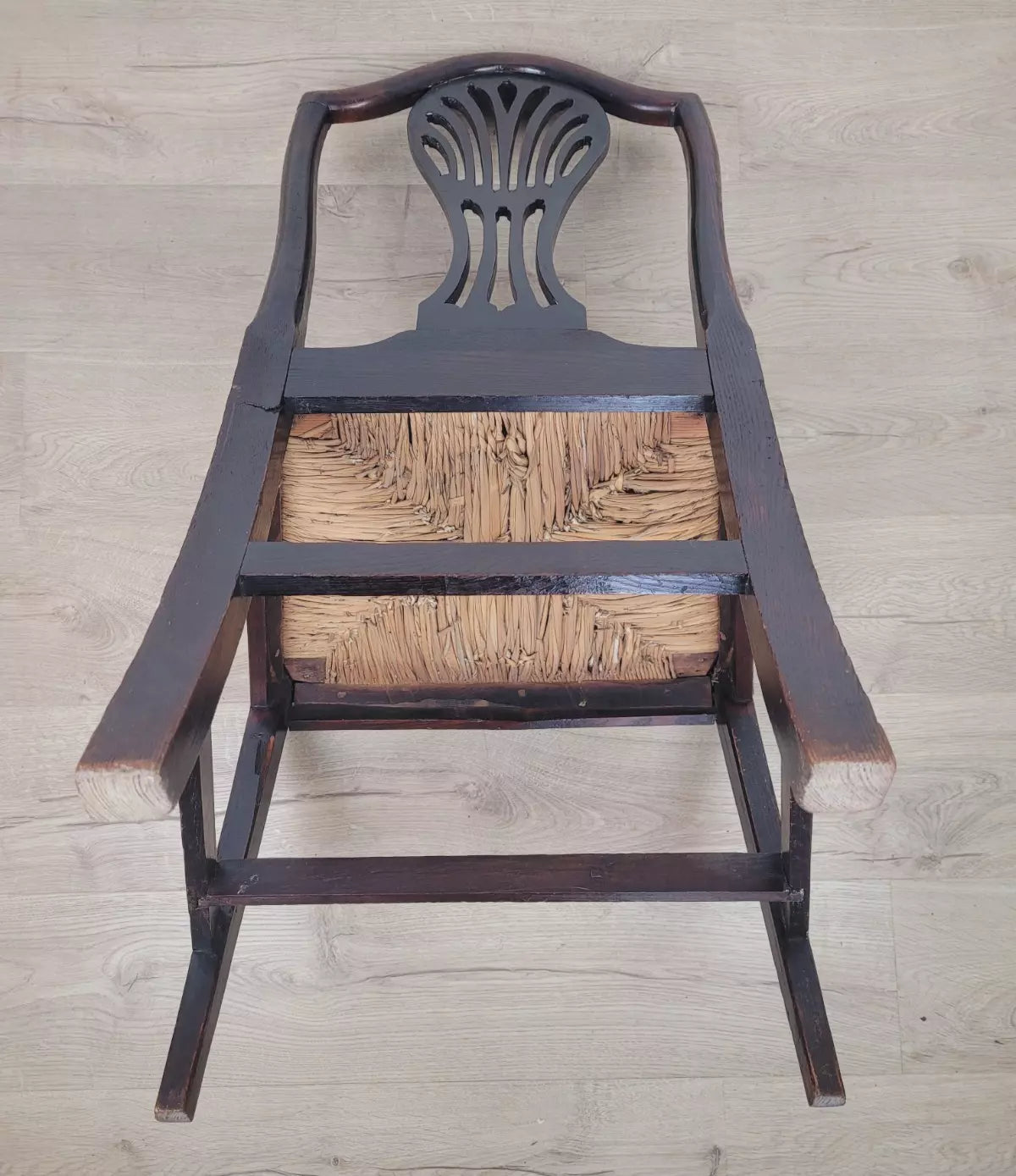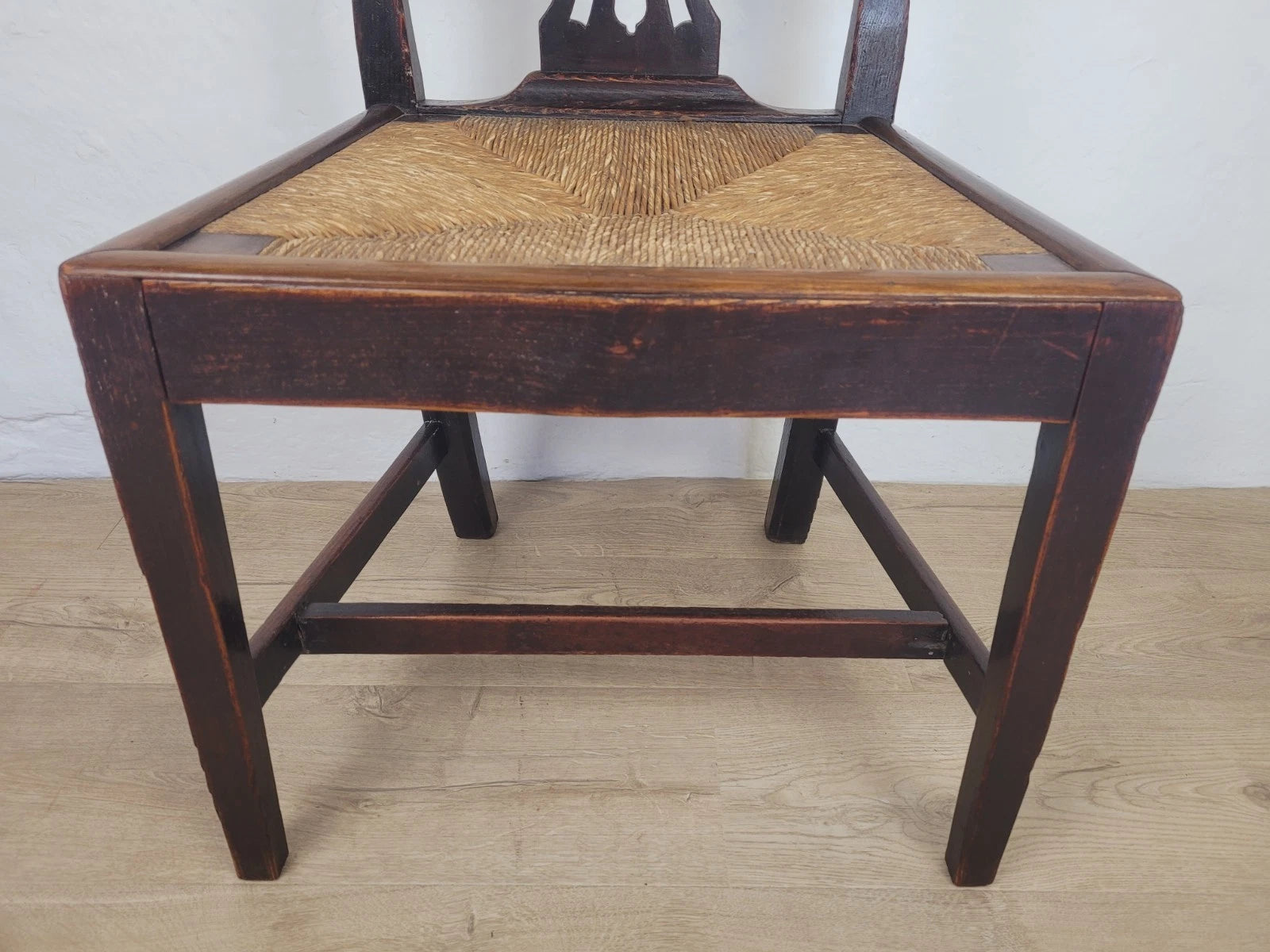 With a excellent carved pierced splat back with a wheat like design, that has a fantastic curved upper rail and two side rails. The side rails leads down to form the 2 solid square back legs.