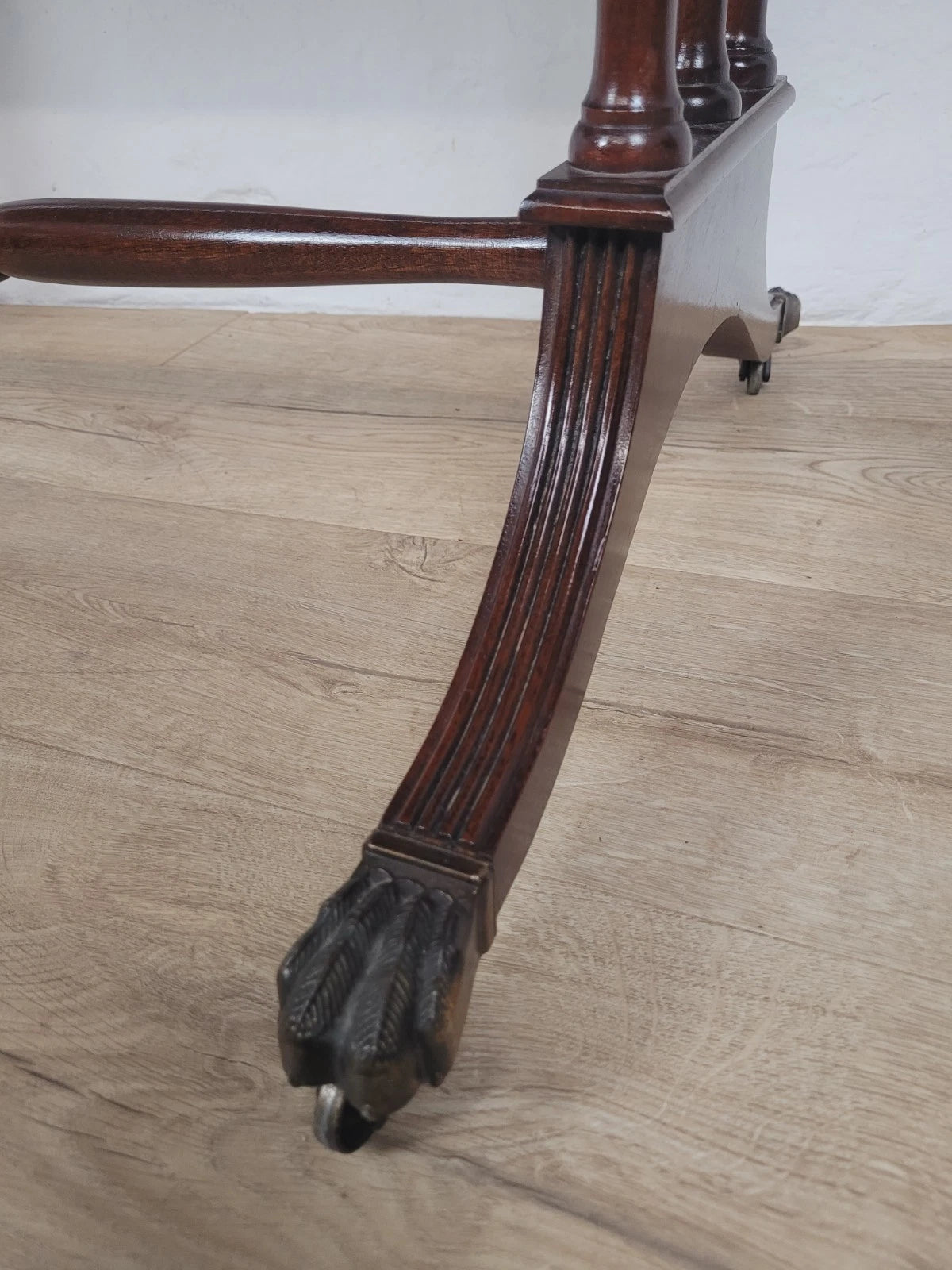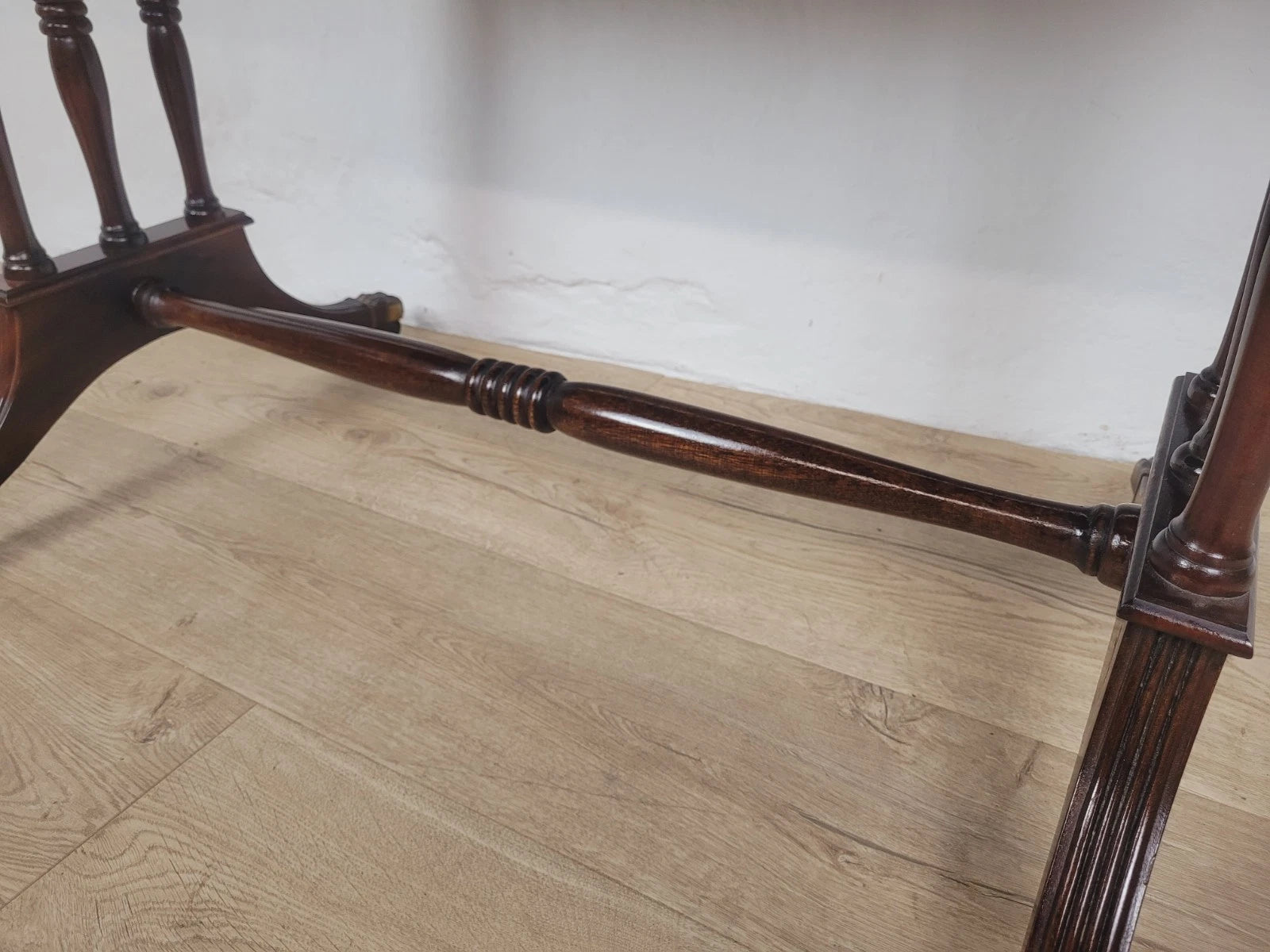 This side table stands proudly on two curved sides, with three wonderful turned spindle connectors (lyre like). The sides are joined with a turned central lower stretcher.