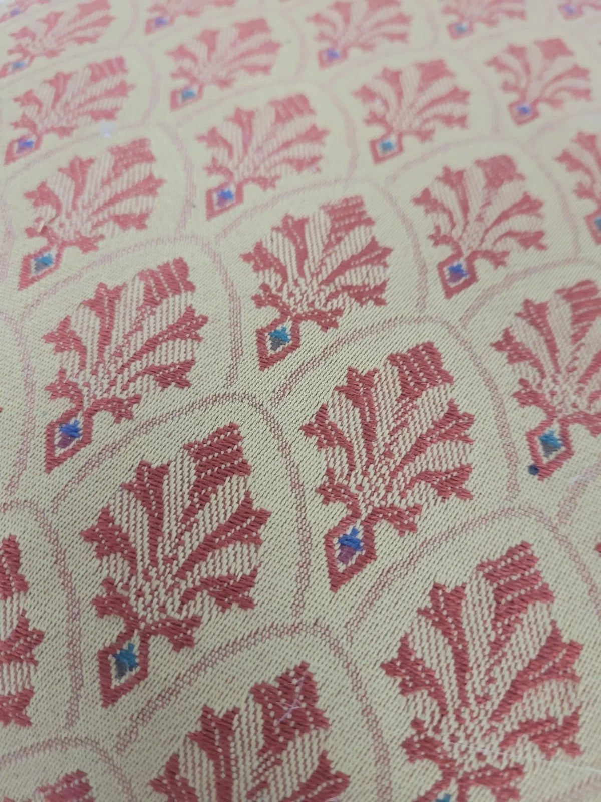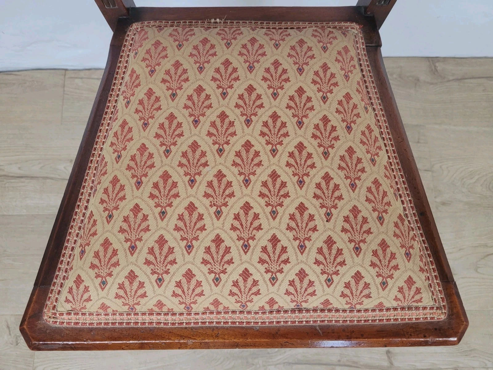 The seat has been padded with horse hair and then upholstered in a wonderful bright floral red fabric with a matching brocade boarder.