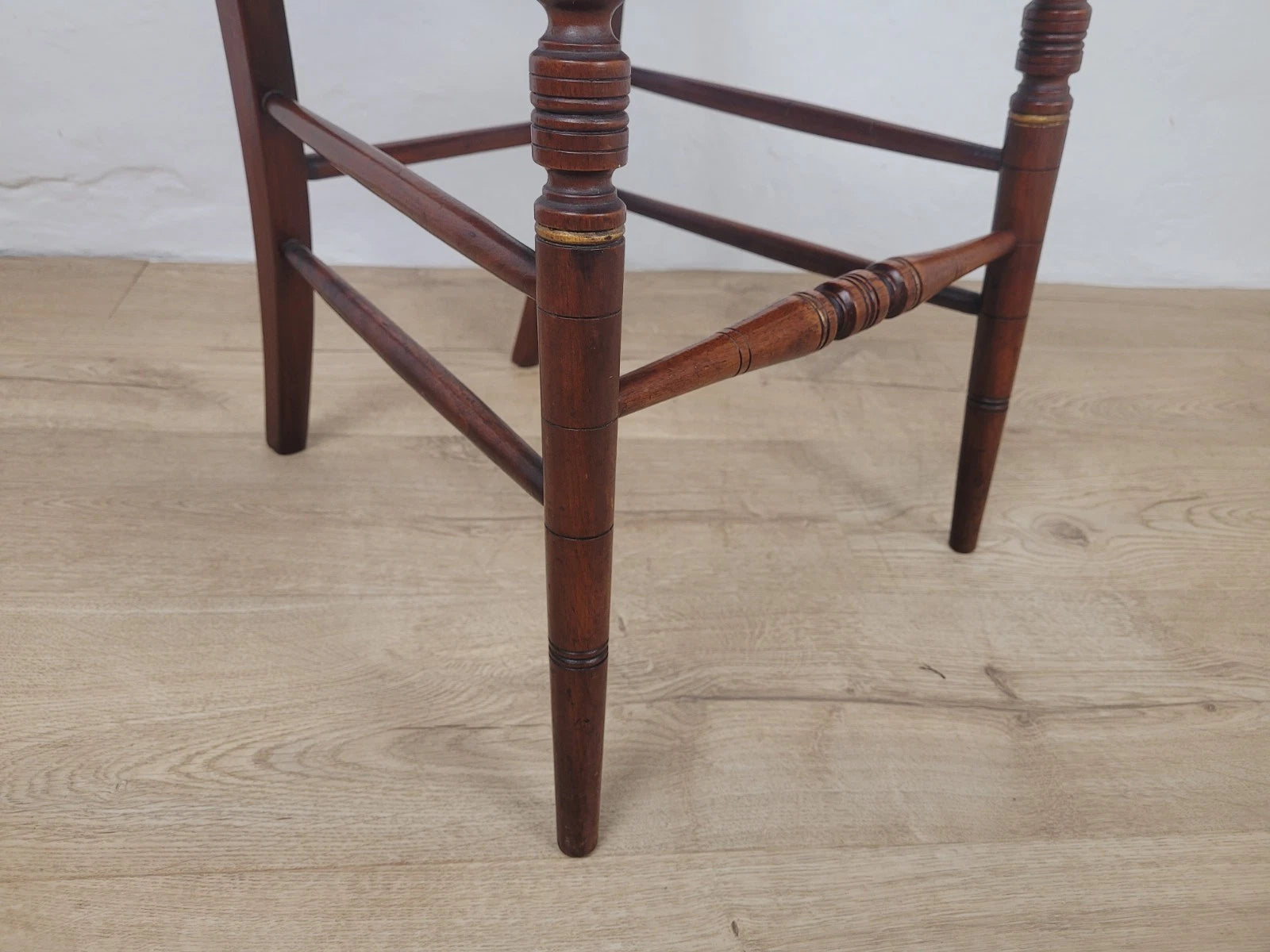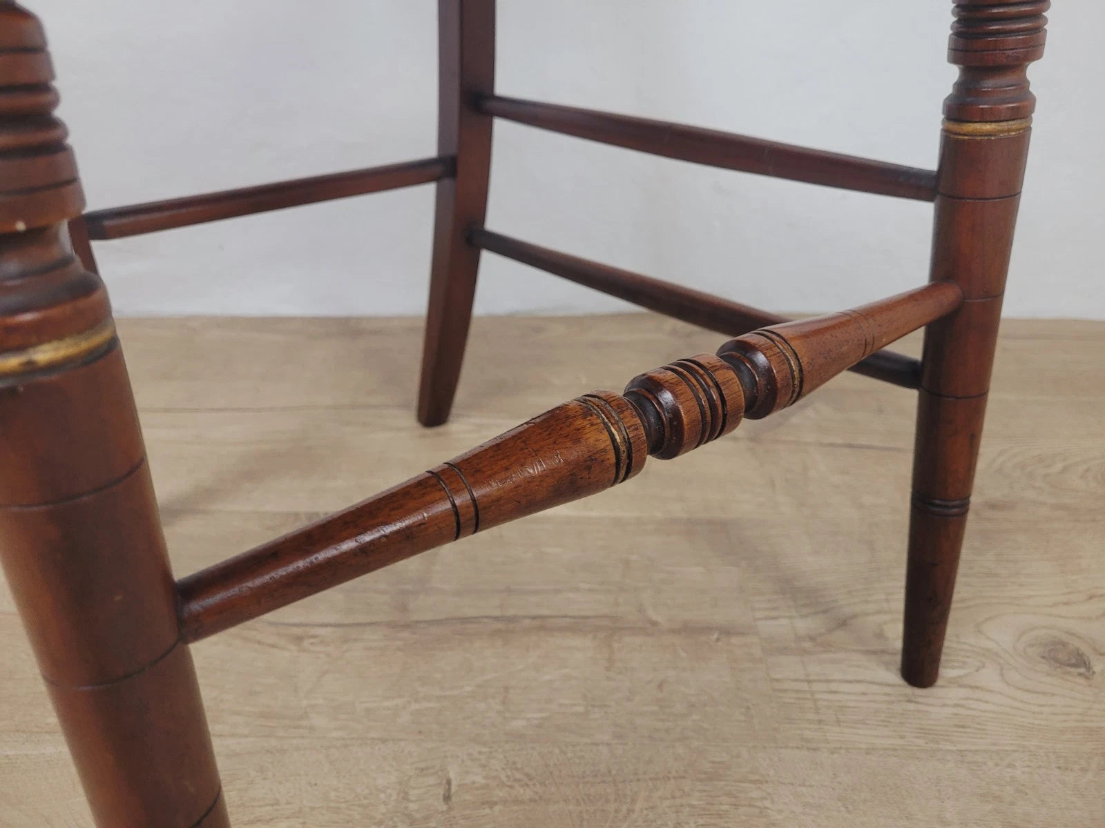 The front legs connect to the two solid square back legs by two double turned stretchers to either side, and a back turned stretcher.