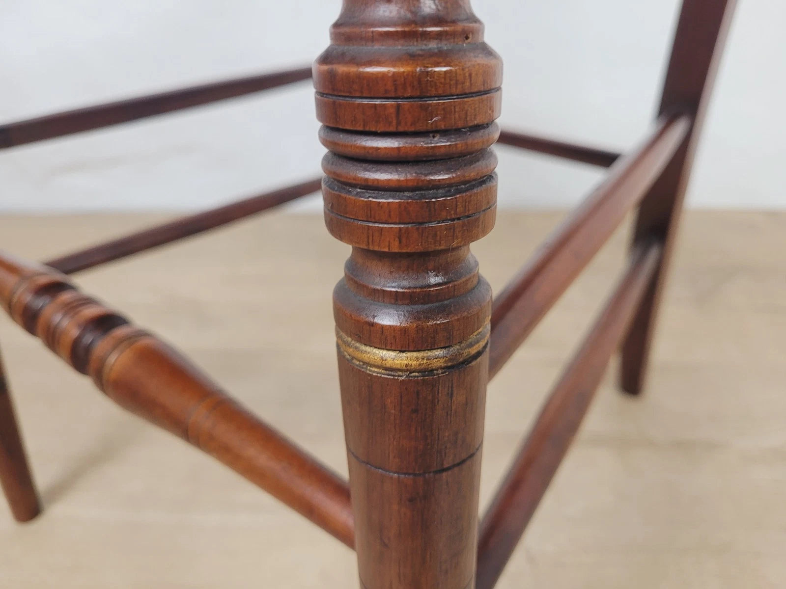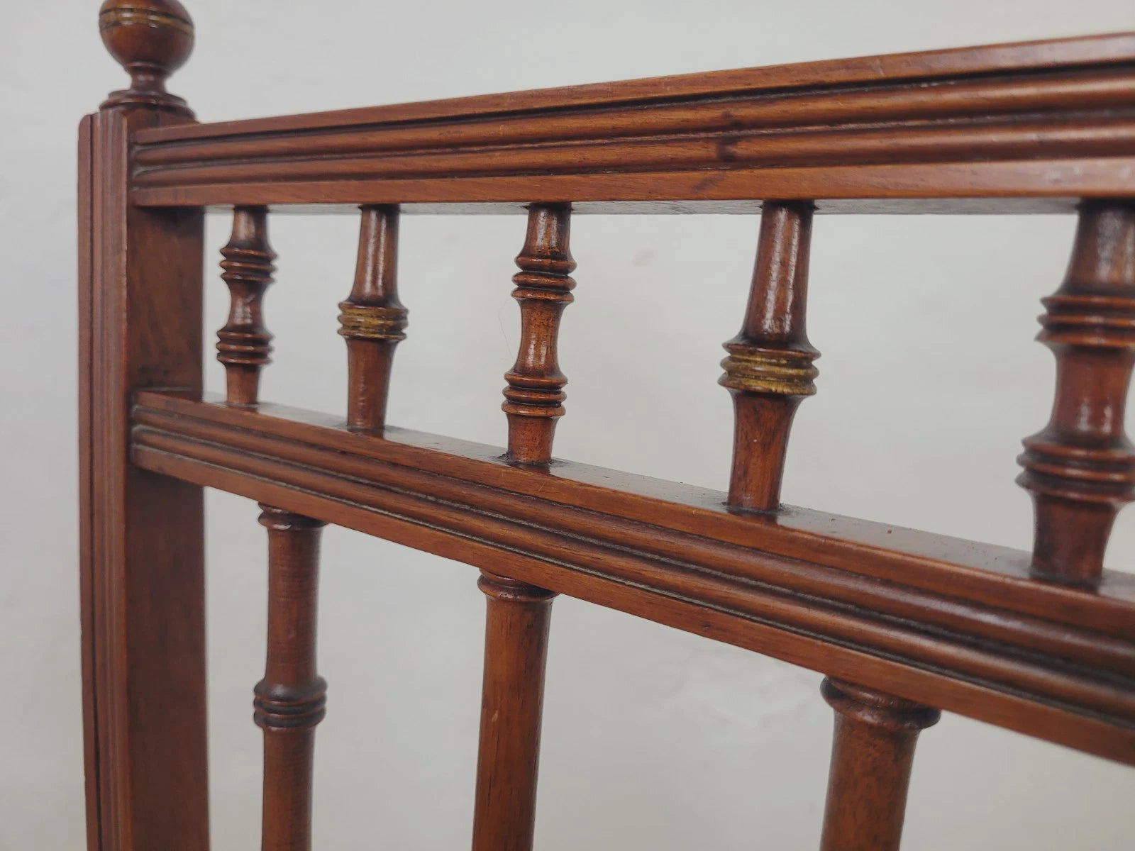 The backrest is constructed with two separate tiers of larger and smaller spindles, that are held between an upper and lower carved frame. A couple of the spindles have been finished with a classic gold paint.