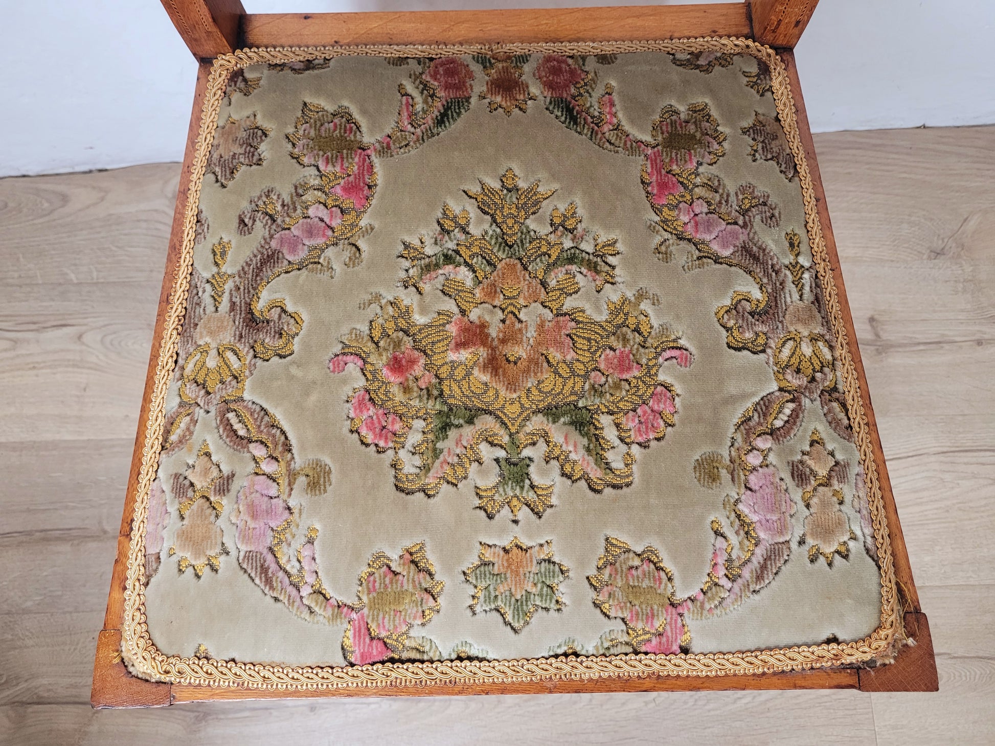 The chairs have a bright, multicoloured square floral upholstered seat that has a matching brocade boarder to finish.