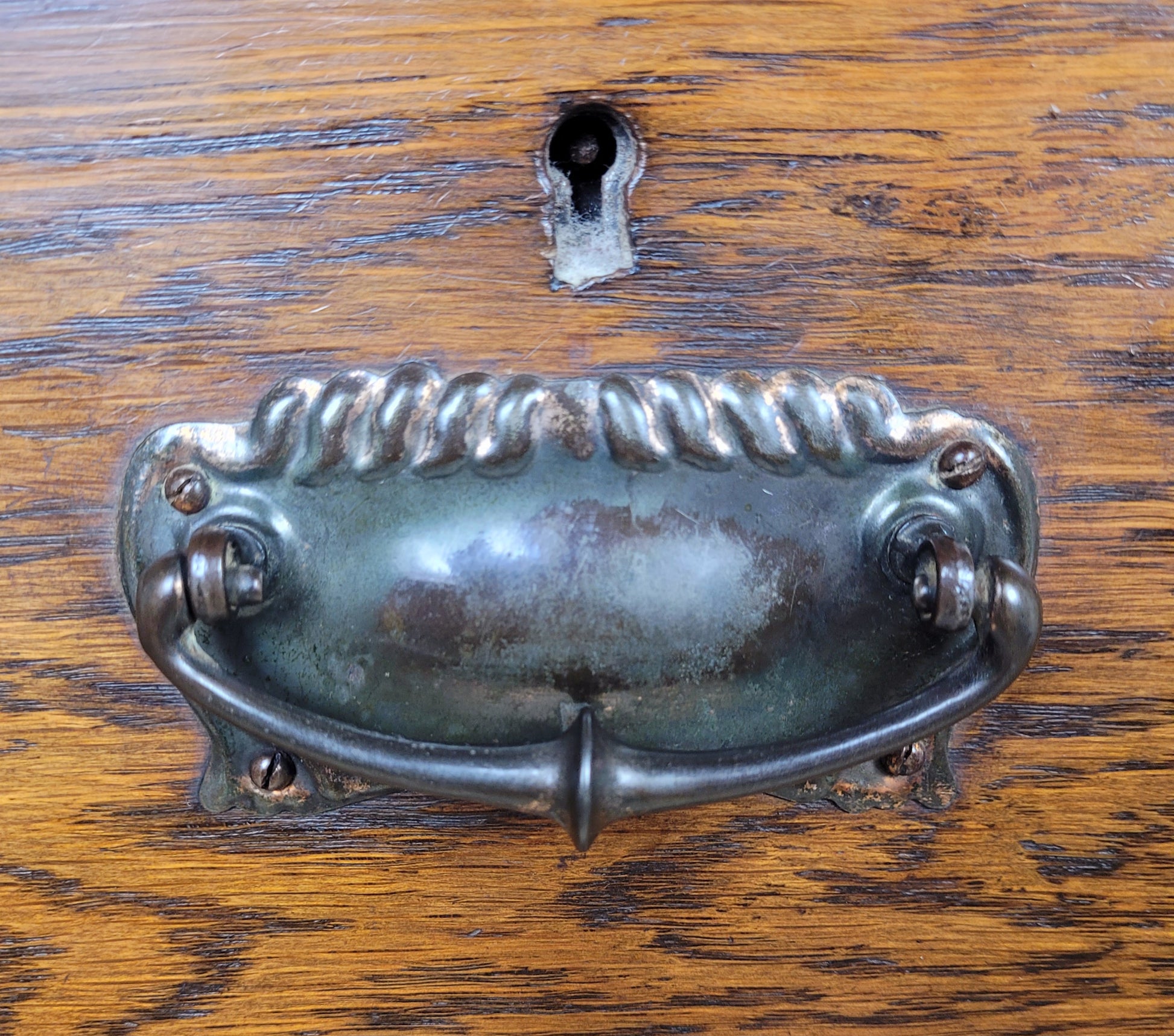 The chest front has a beautiful arrangement of two short over three large graduating drawers. Each drawer has the original striking matching metal drop handles to finish, a fantastic Edwardian quality.