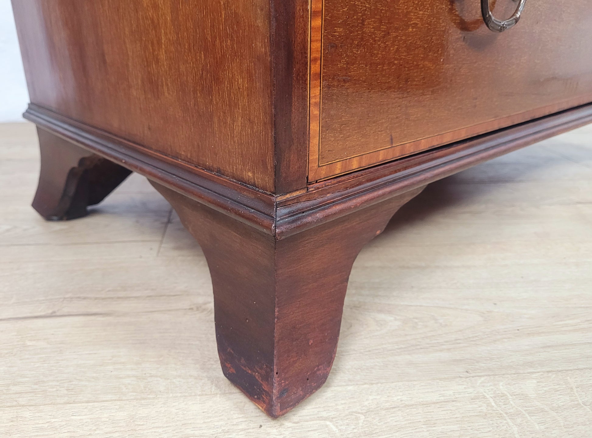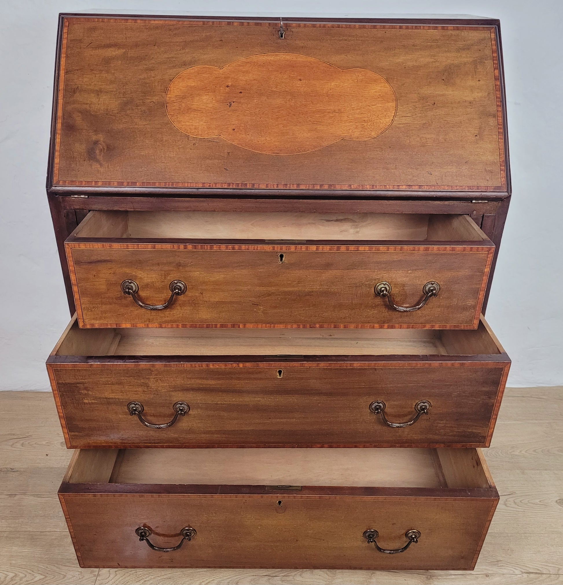 The front of the bureau has a wonderful smaller upper drawer, and two larger spacious lower graduating drawers. All of the drawers are finished with a crossbanded design and with the original gorgeous antique metal drop handles.