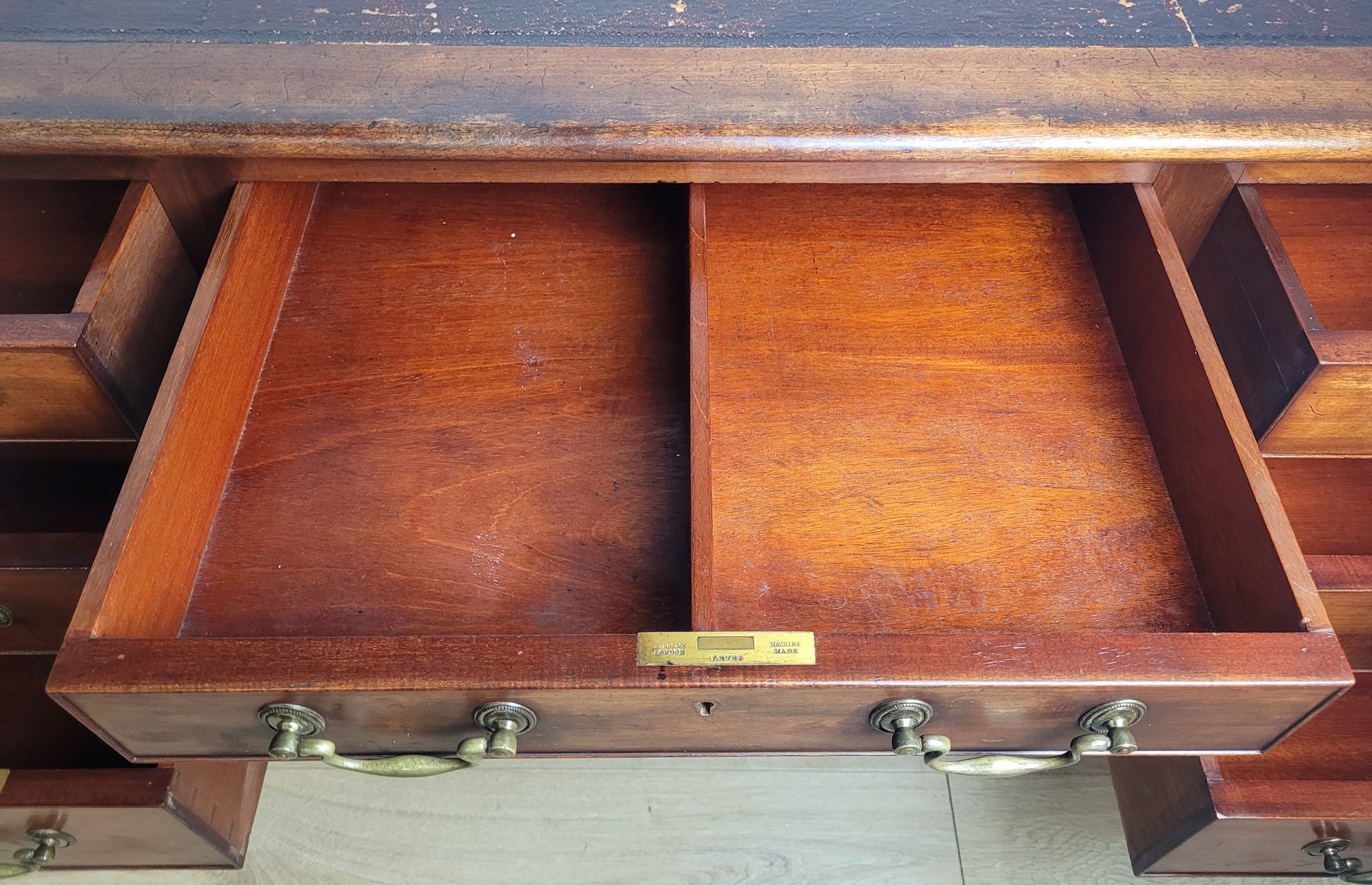 The desk front has a large central drawer which has been divided into two sections. With three graduating drawers to either side of the desk, with the two upper drawers to either side having also been split into a large section and a smaller section (see photographs).
