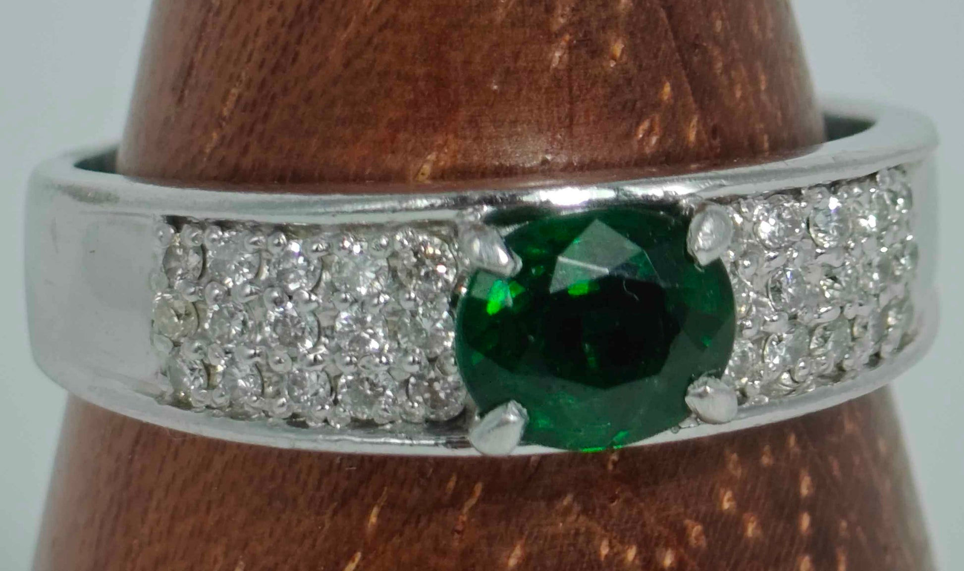 This is a beautiful platinum band ring, that features an excentric oval-shaped Tourmanile emerald as the main stone.
