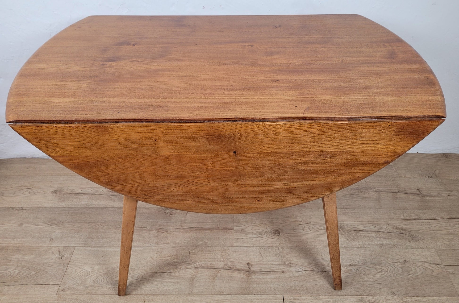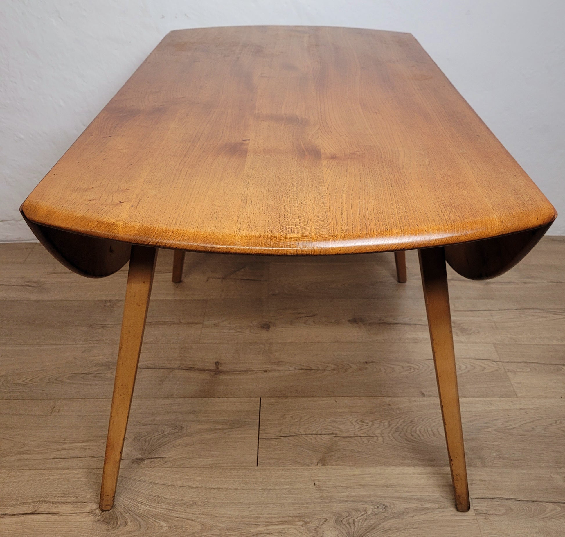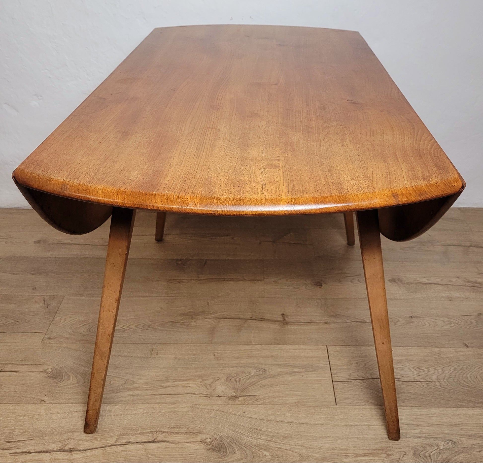 The tabletop drop leaves are held open by two handles underneath on rails, a classic Ercol feature.