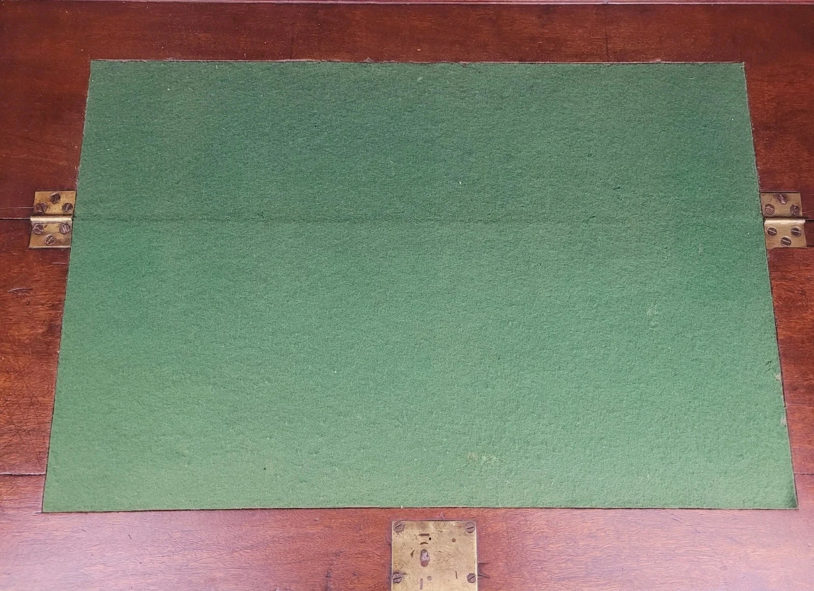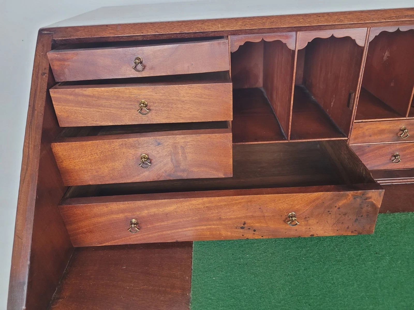 The fall front can be dropped to expose the quality green fabric desk work top, and interior.