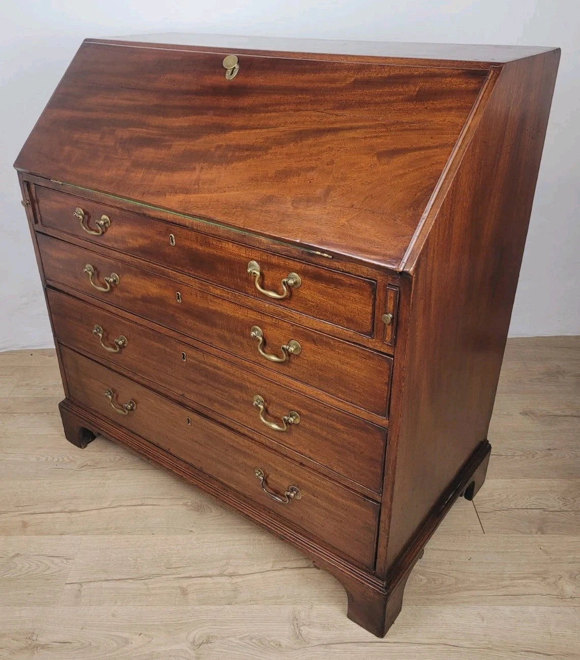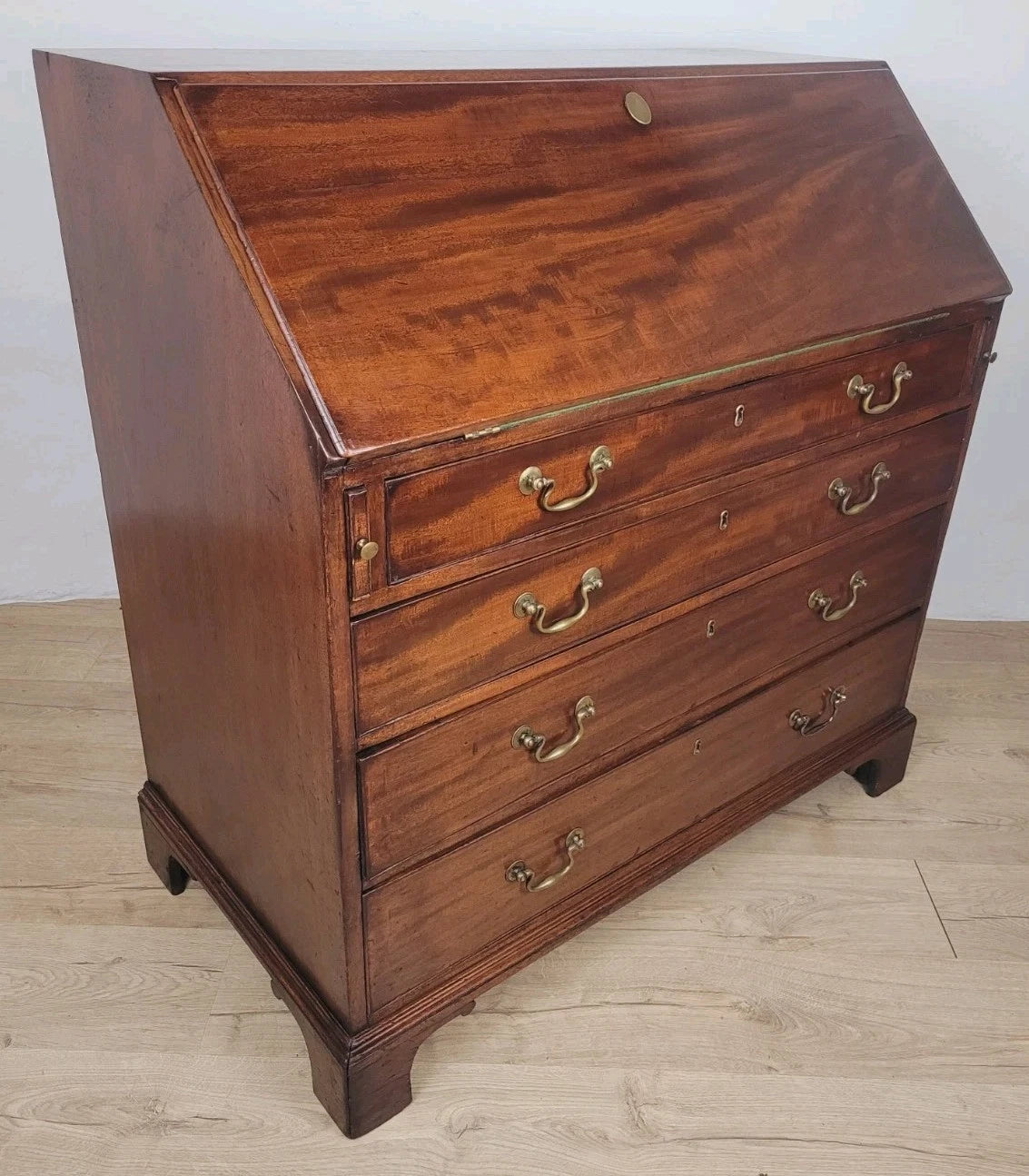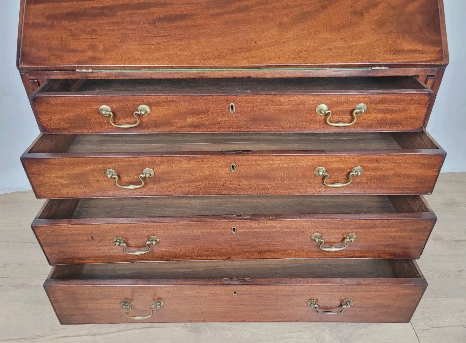 The front of the bureau has a smaller upper drawers, and three wonderful large spacious graduating drawers.
