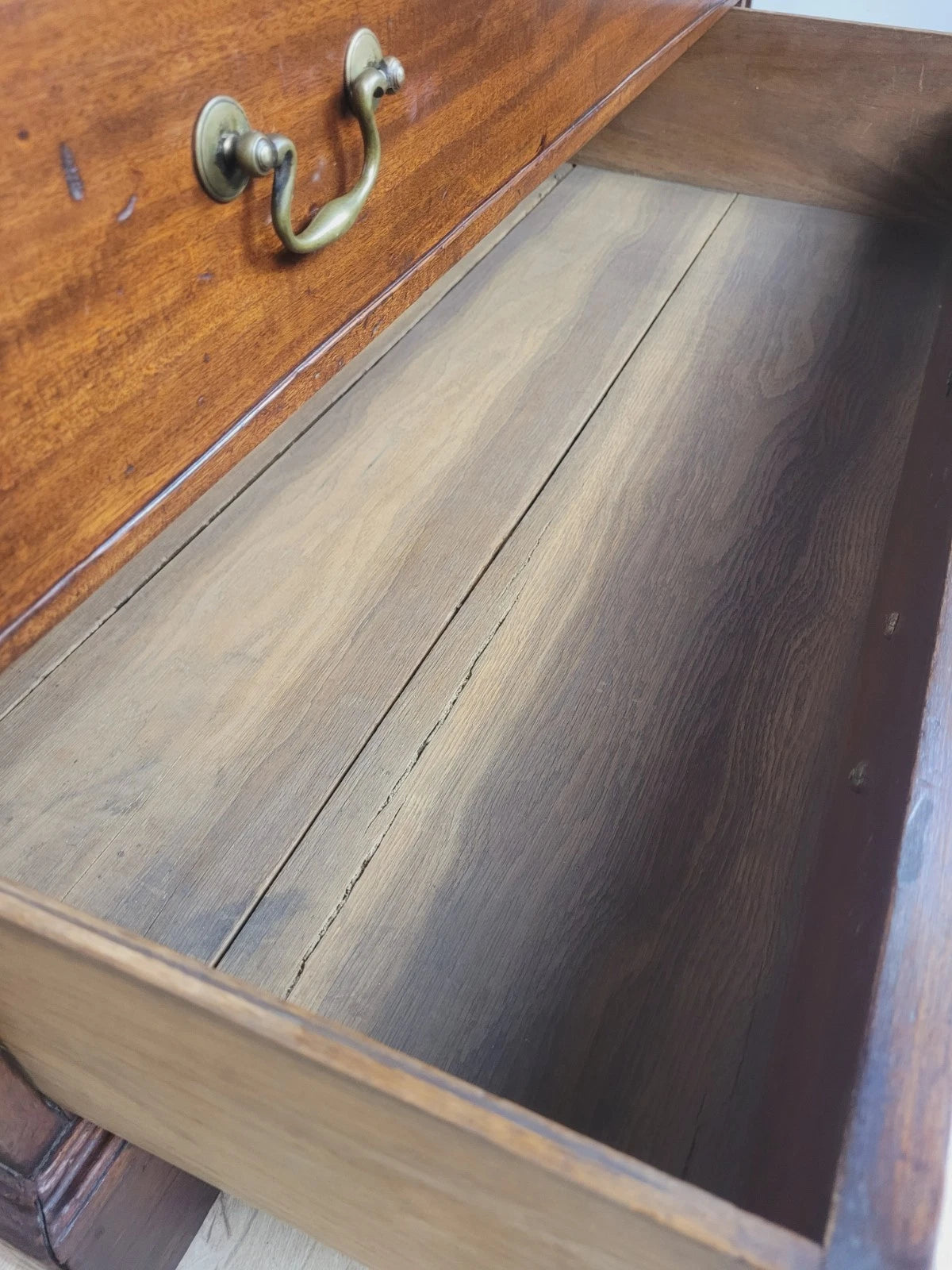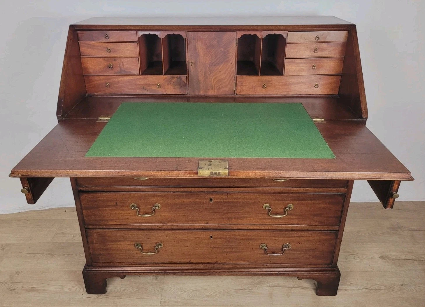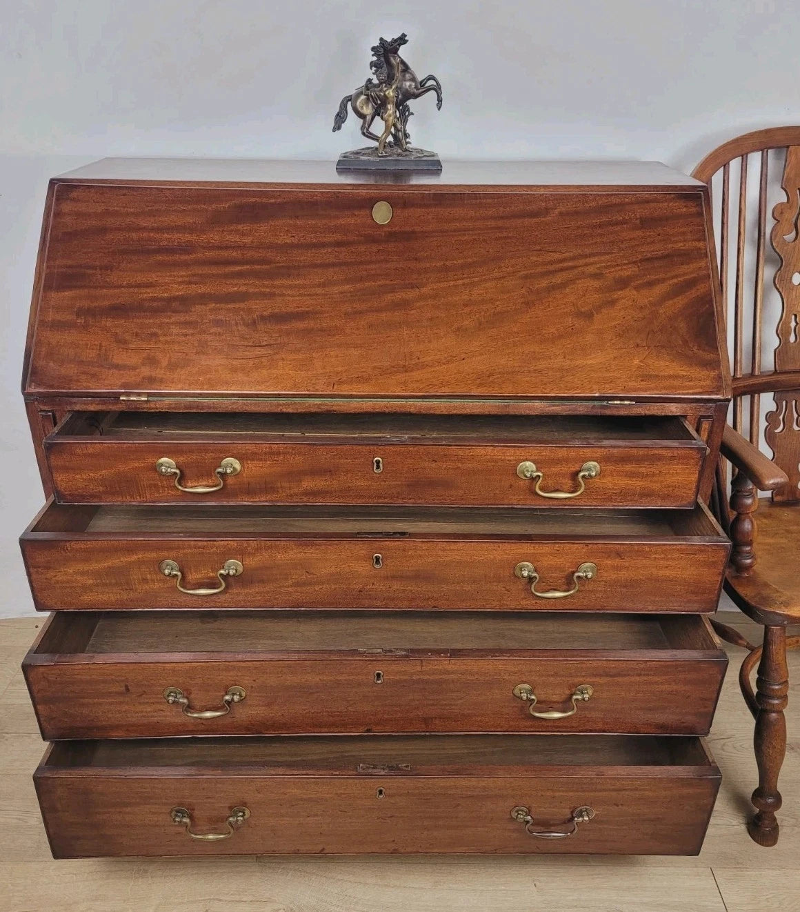 The front of the bureau has a smaller upper drawers, and three wonderful large spacious graduating drawers.