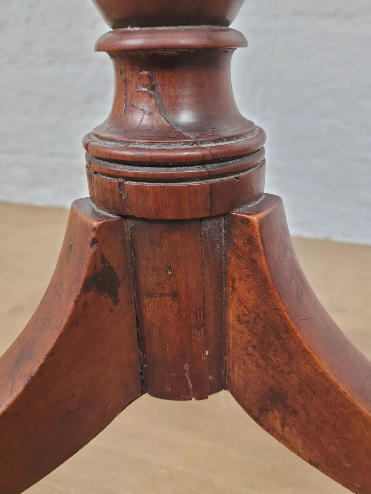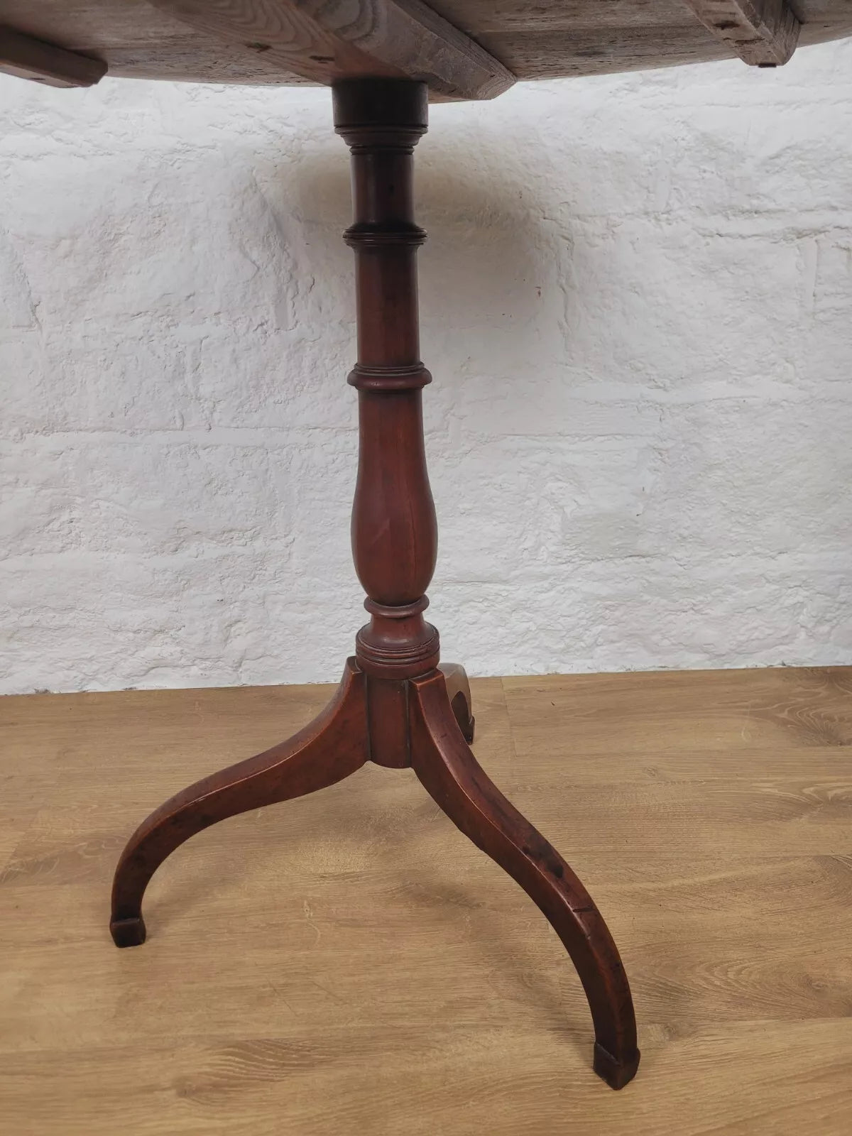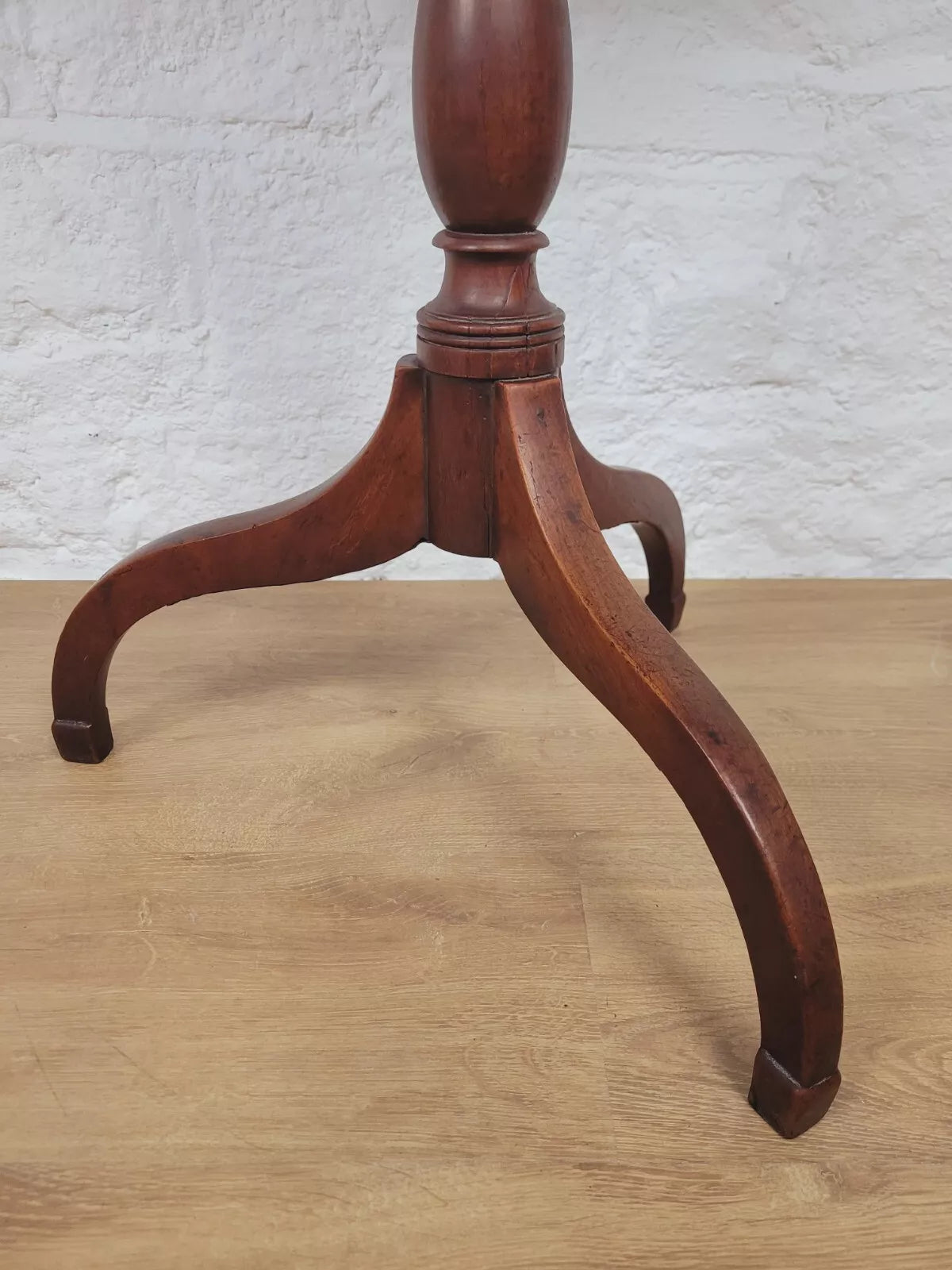 Leading down to a gorgeous turned vase shaped leg that proudly stands on the three excellently curved tripod feet, carved to form a stable square finish to each foot.