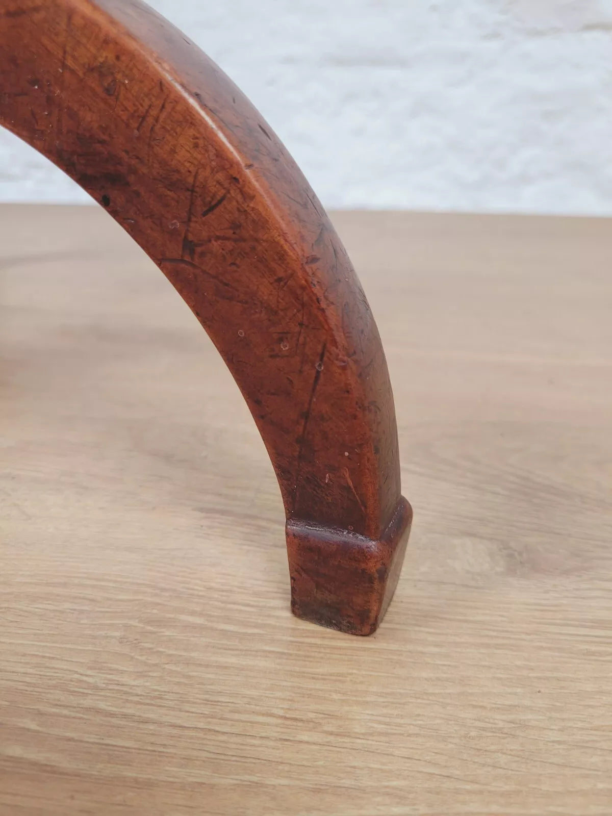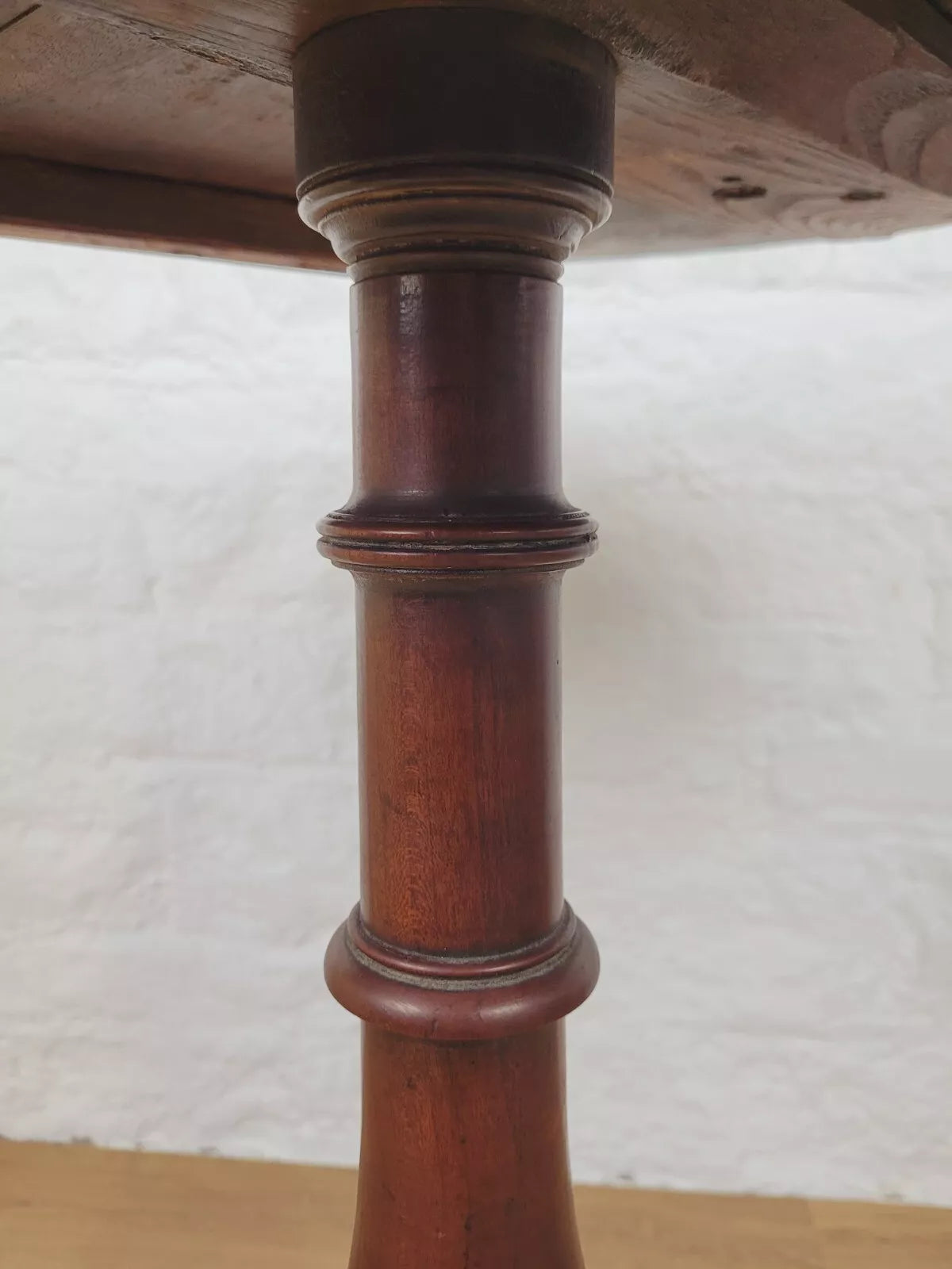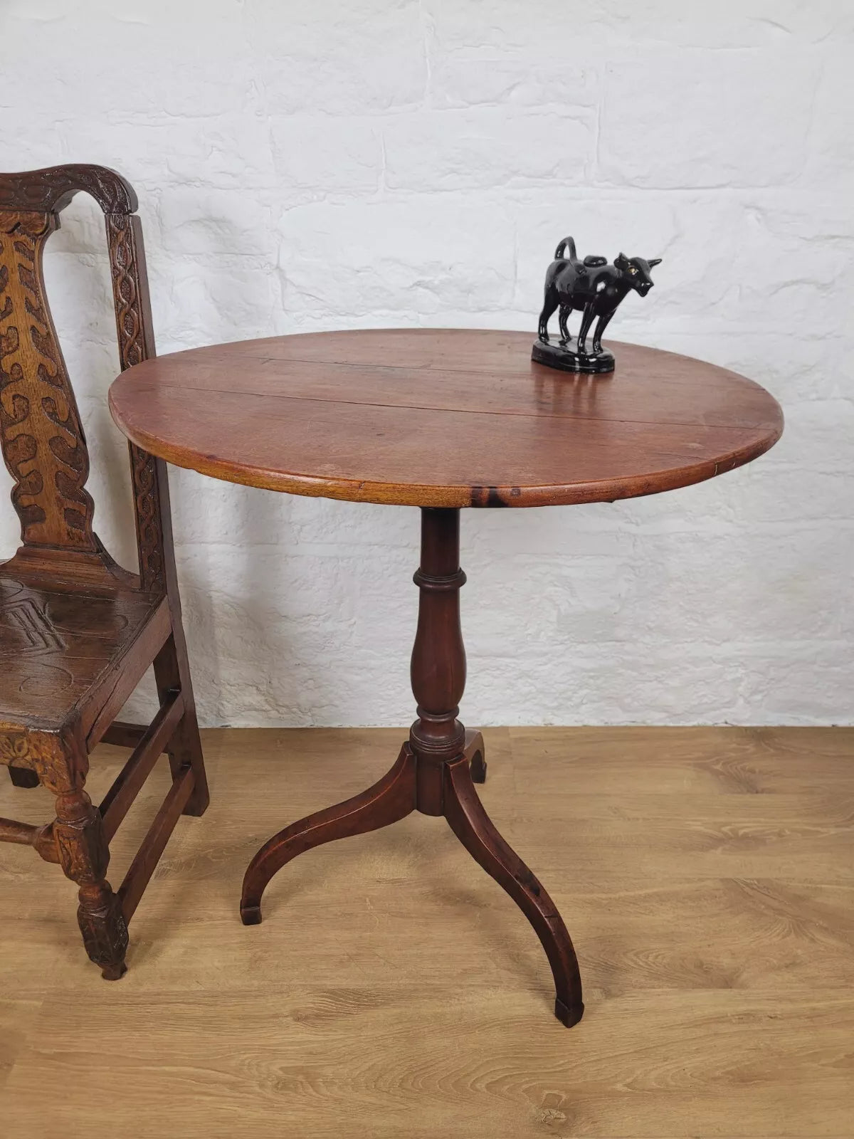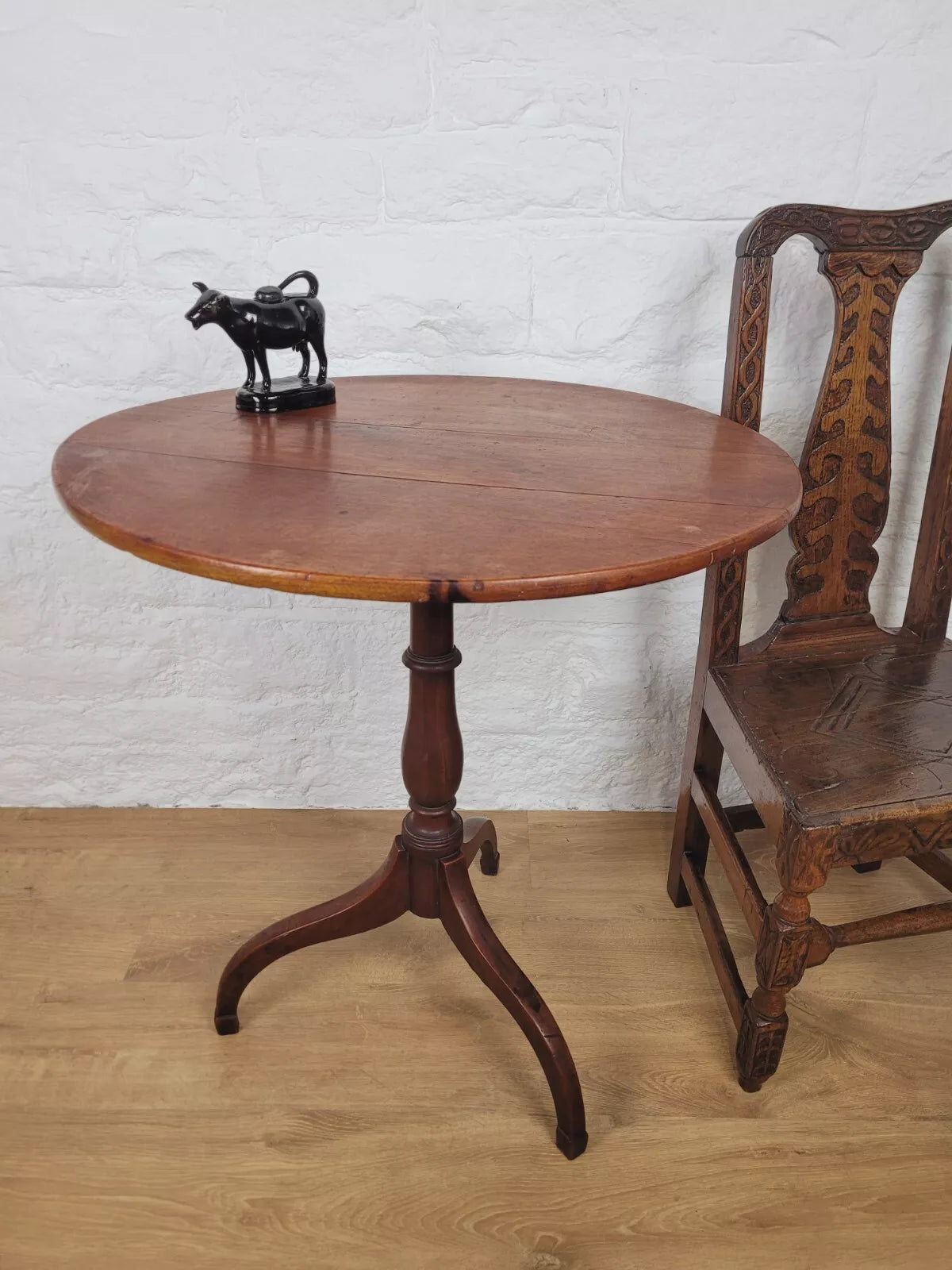 Leading down to a gorgeous turned vase shaped leg that proudly stands on the three excellently curved tripod feet, carved to form a stable square finish to each foot.