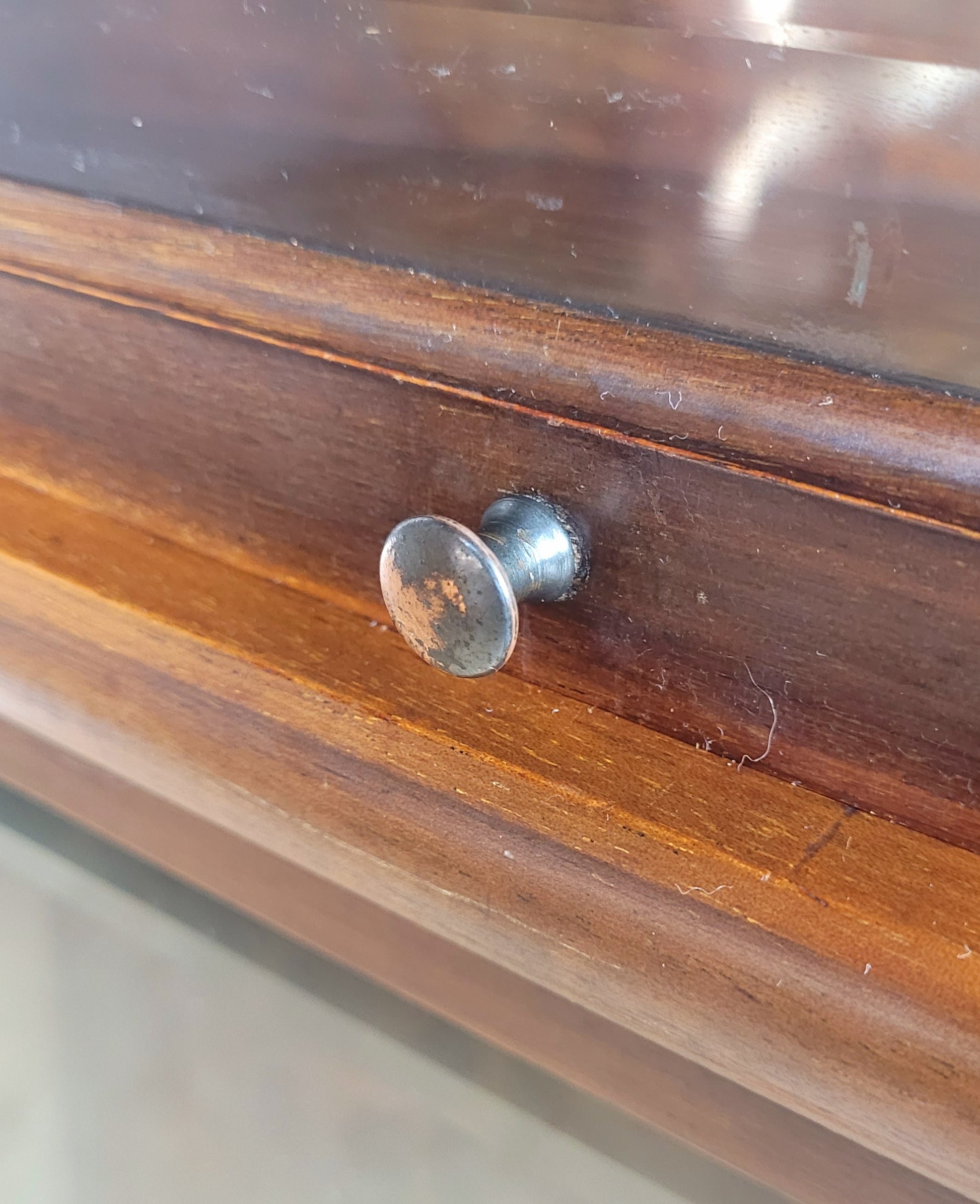 All the bookcase doors have a beautiful metal button handles to help slide them.