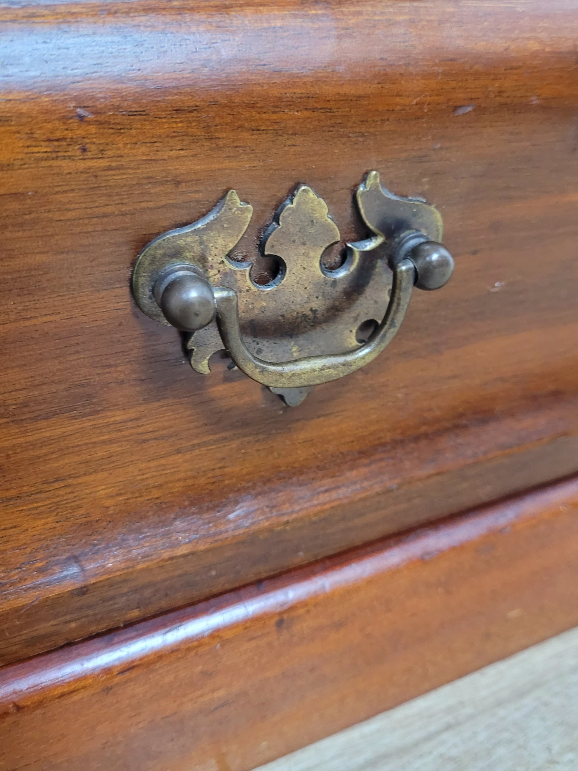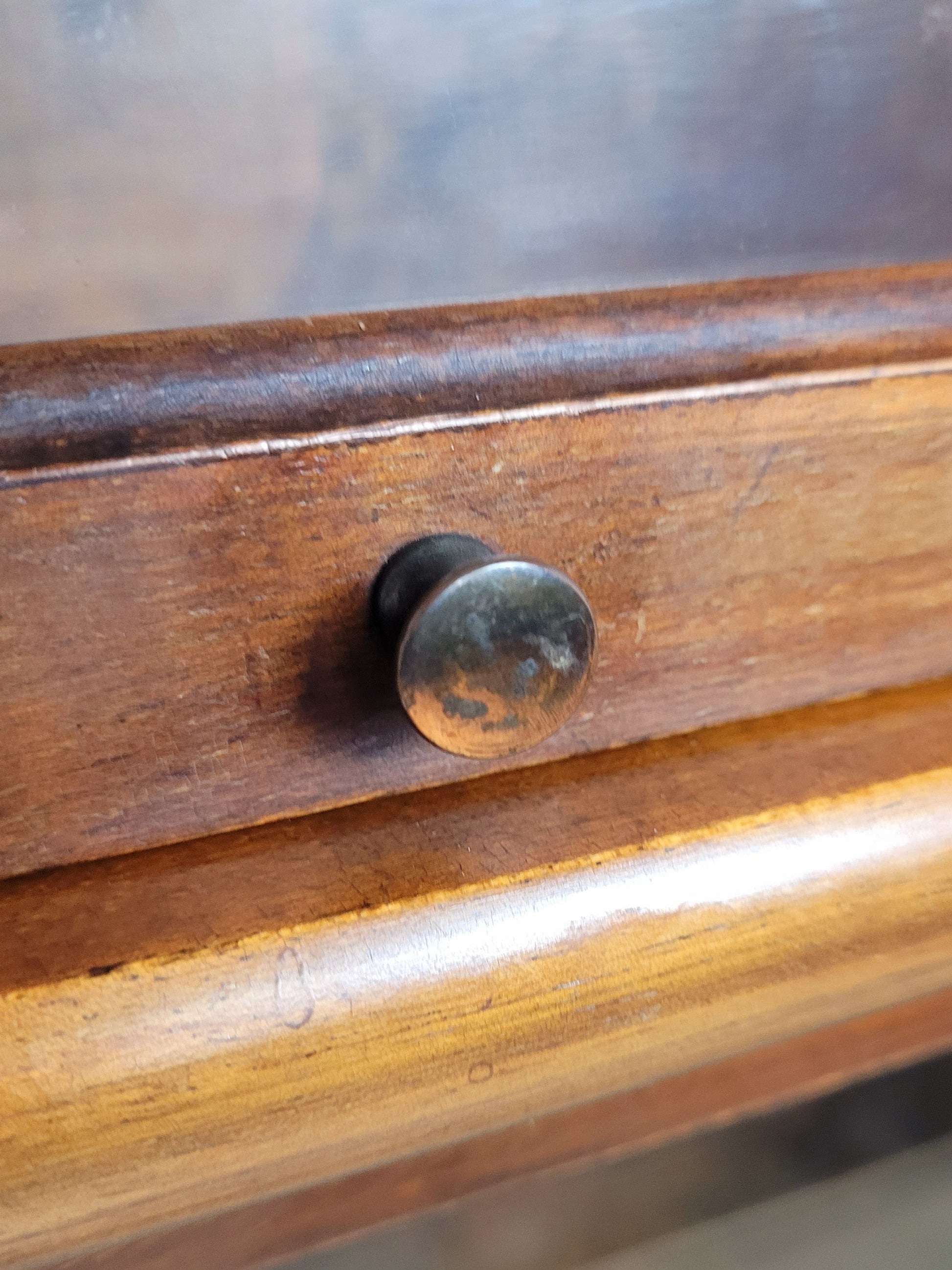This bookcase displays a wonderful mahogany patination that is complimented by the metal bound side additions, a gorgeous addition to a rustic or country home style.