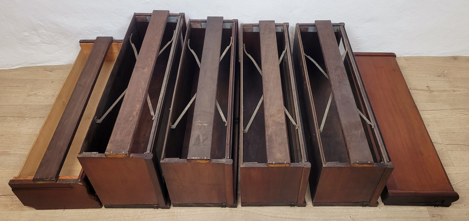 All of the book case shelves have the classic globe wernicke metal scissor mechanism, that helps the glass doors slide easily.