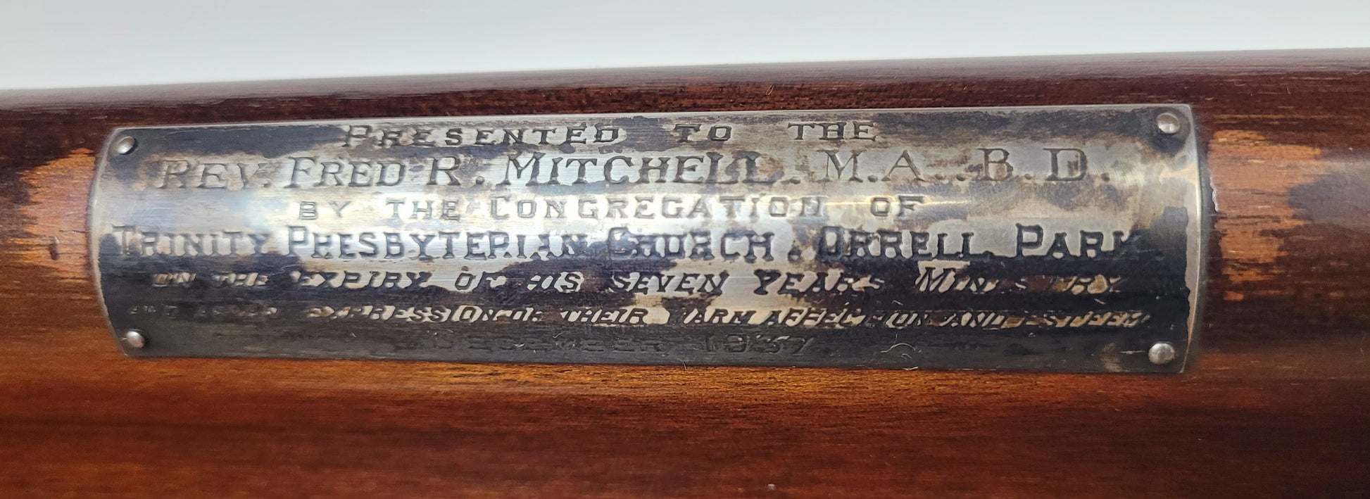 There is a metal plaque to the top of the bookcase, reading 'Presented to the Rev. Fred R. Mitchell. By the congregation of Trinity Phesbytepian Church Orrell Park on the expiry of this seven years minitryand expression of their warm affection and esteem. December 1937'.