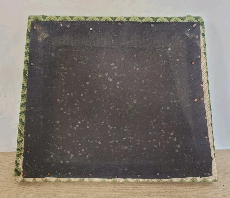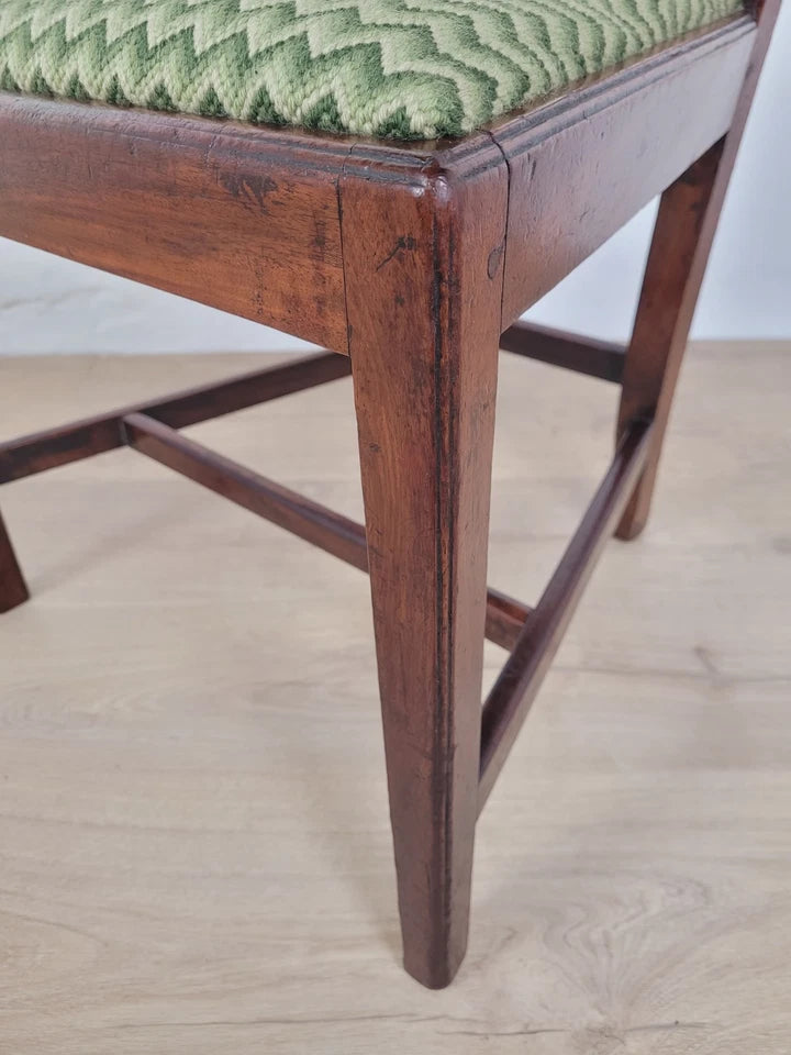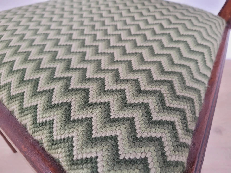 The chair has a comfortable square patterned green seat that has been upholstered in a wool fabric.