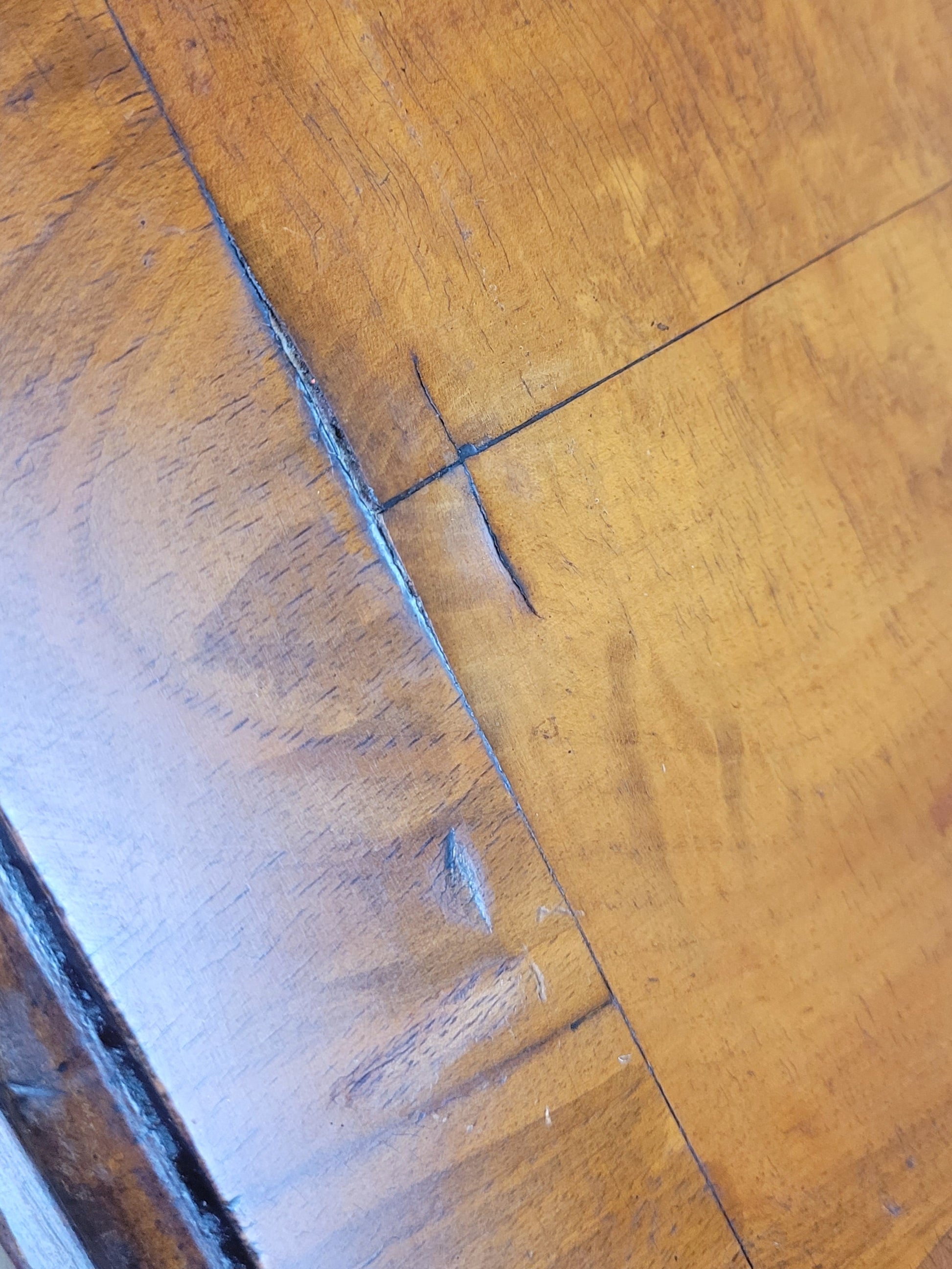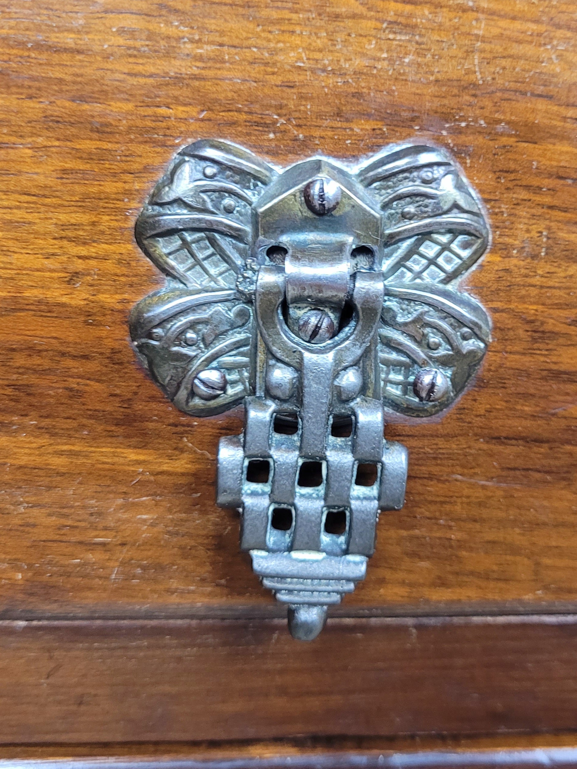 The desk drop front can be held open with the hinged front wooden supports, making writing on the desk very easy.
