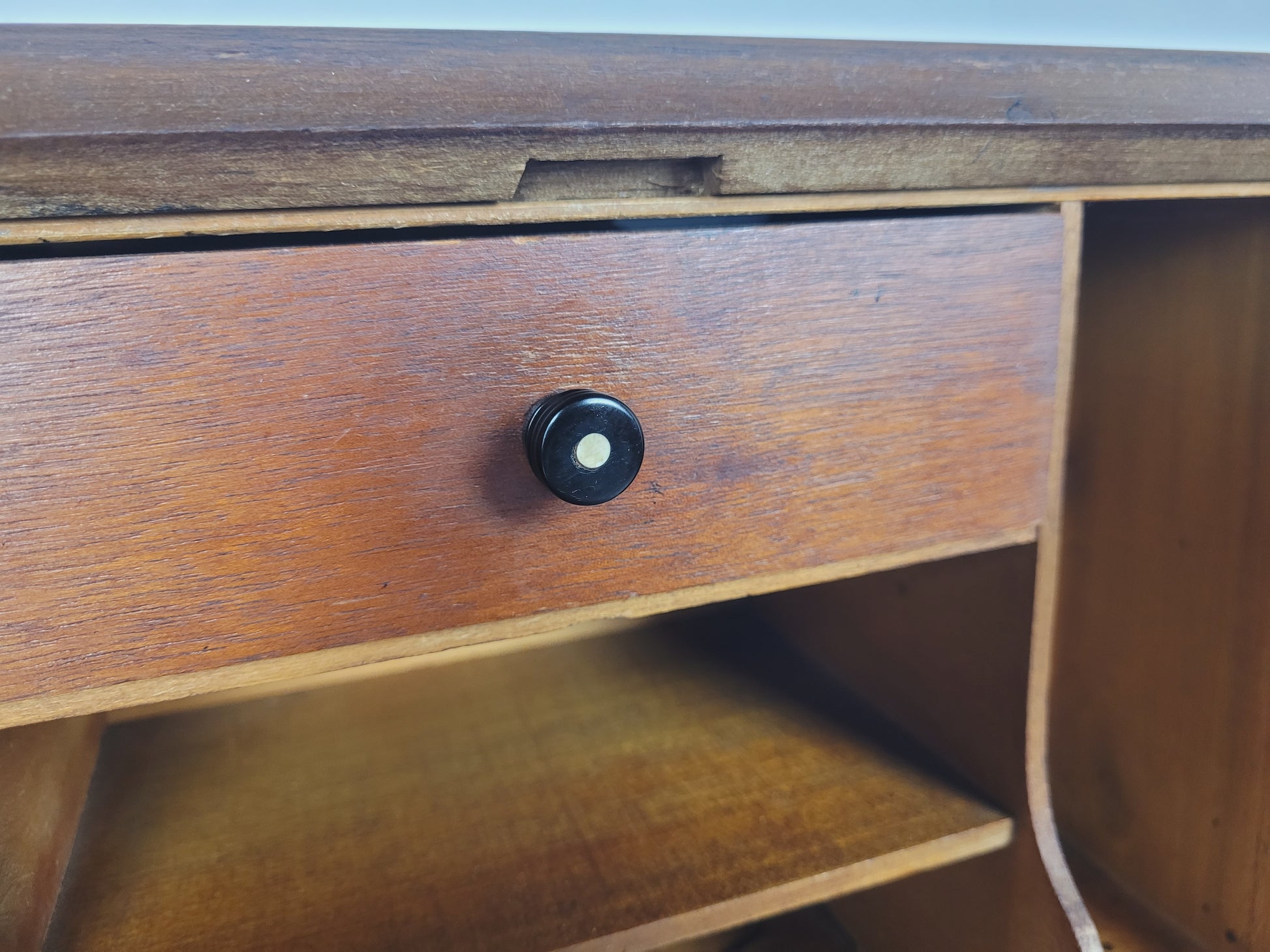 Overall, this vintage writing desk is in great vintage condition, with general signs of use, scatches and veneer wear as to be expected from years of historical use (see photographs)