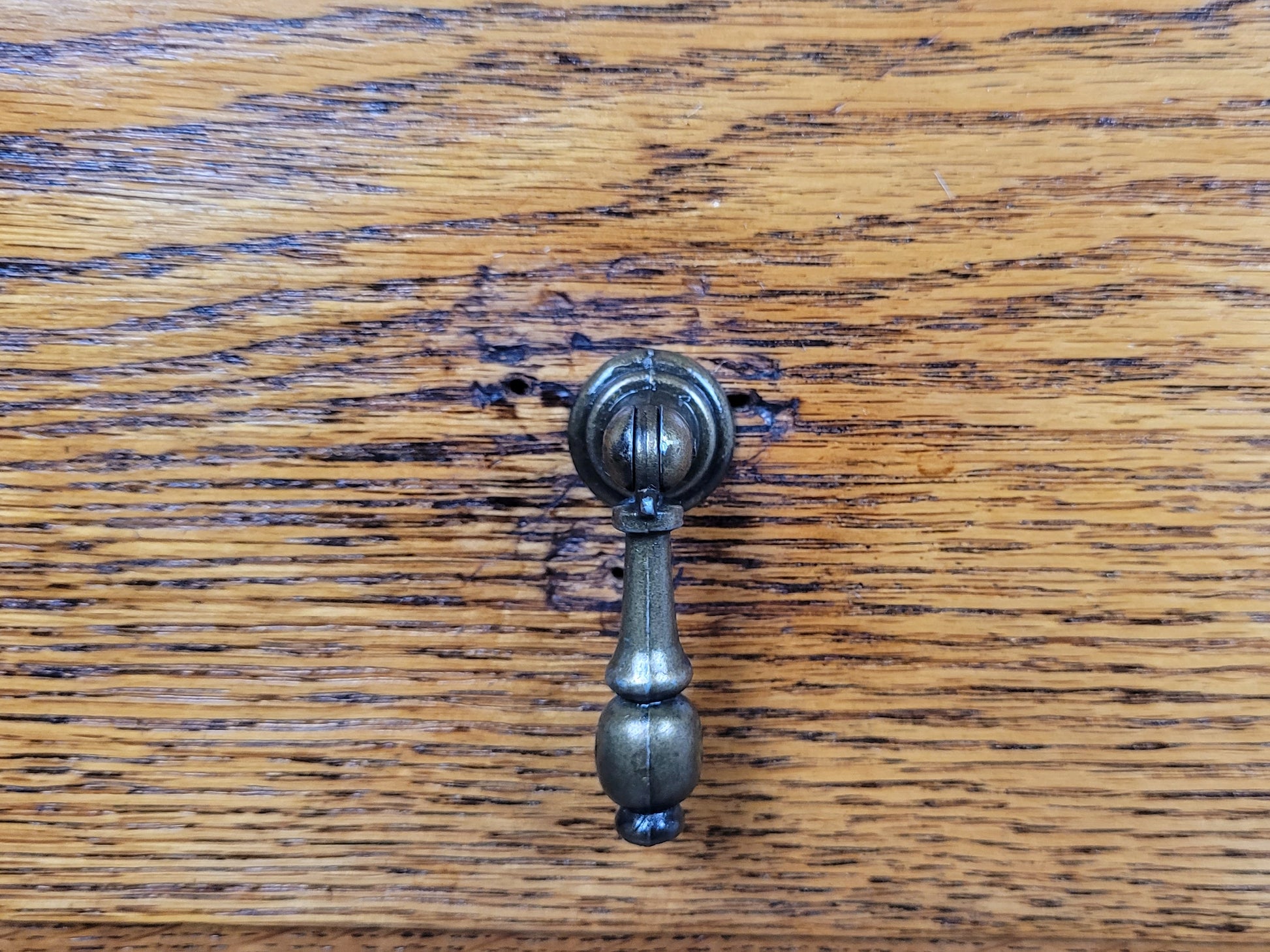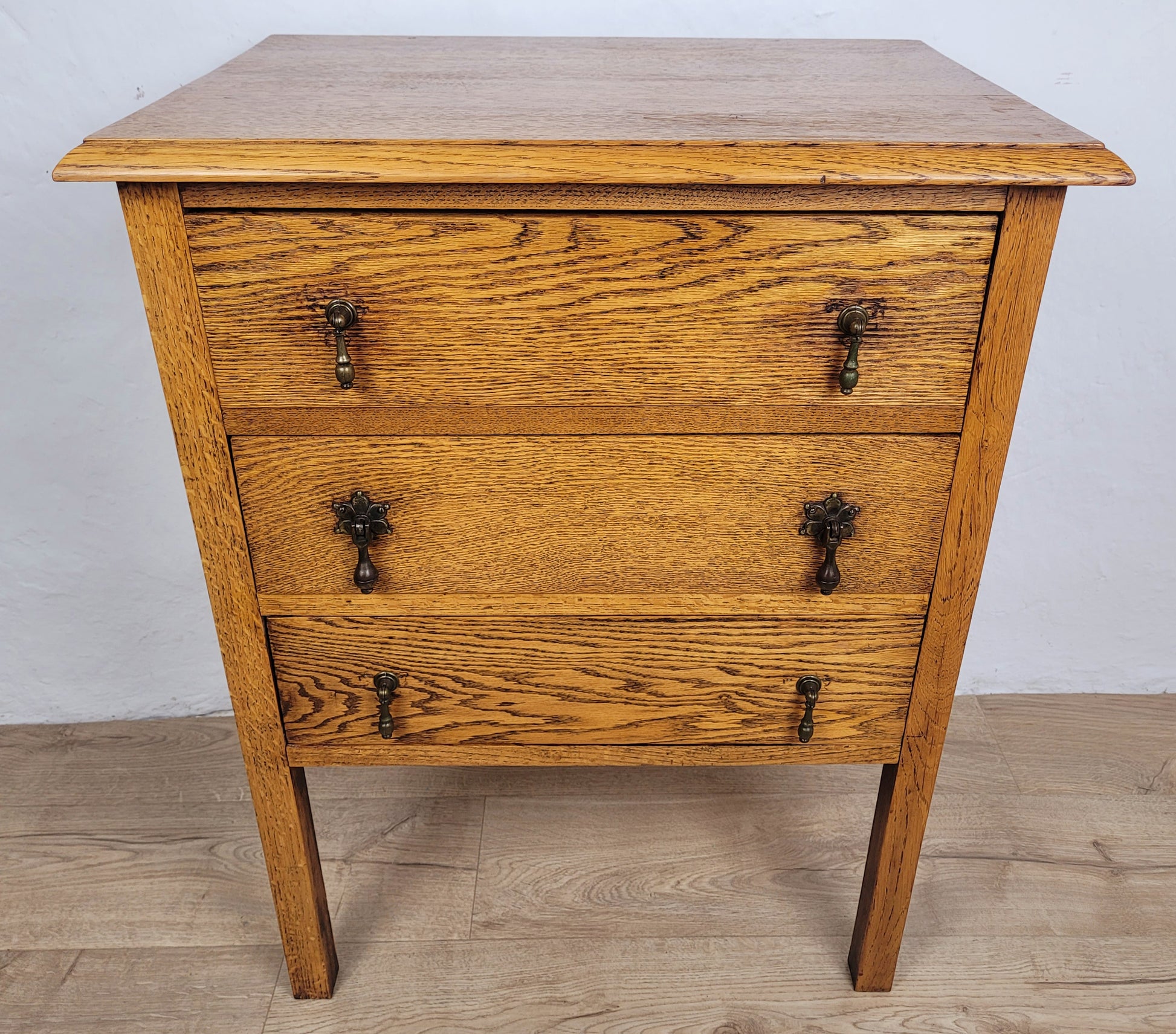 All the drawers have metal drop handles. The upper and lower drawer drop handles are of a circular type, the middle drawer has larger floral drop handles (see photographs).