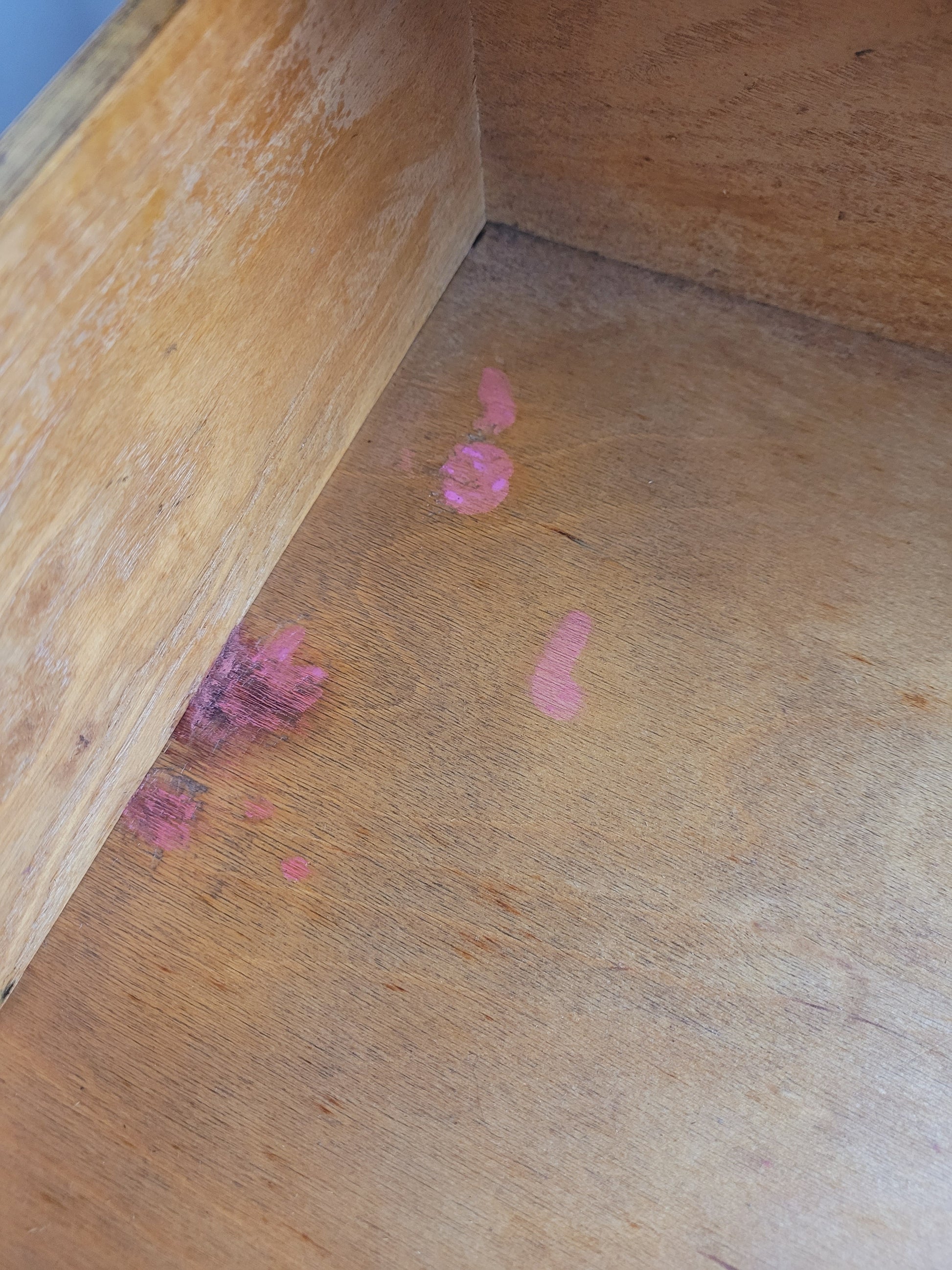 The top drawer interior has historical pink marks inside (See photograph).