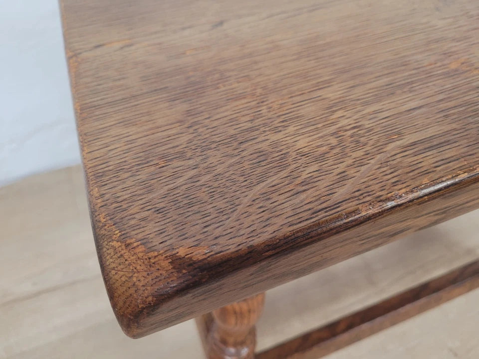 This side table stands proudly on four solid turned legs, finished with square feet. All connected with solid square stretchers.