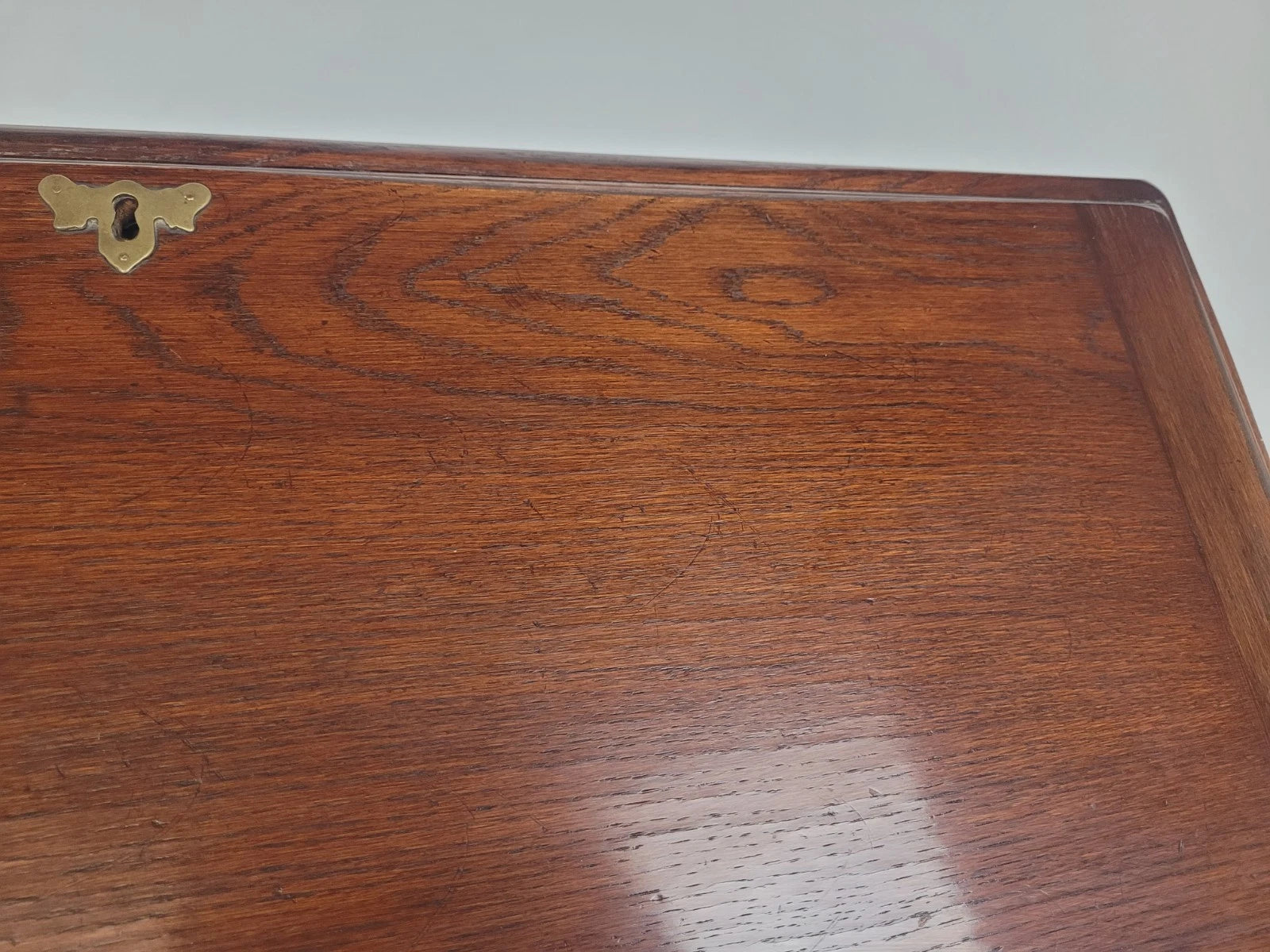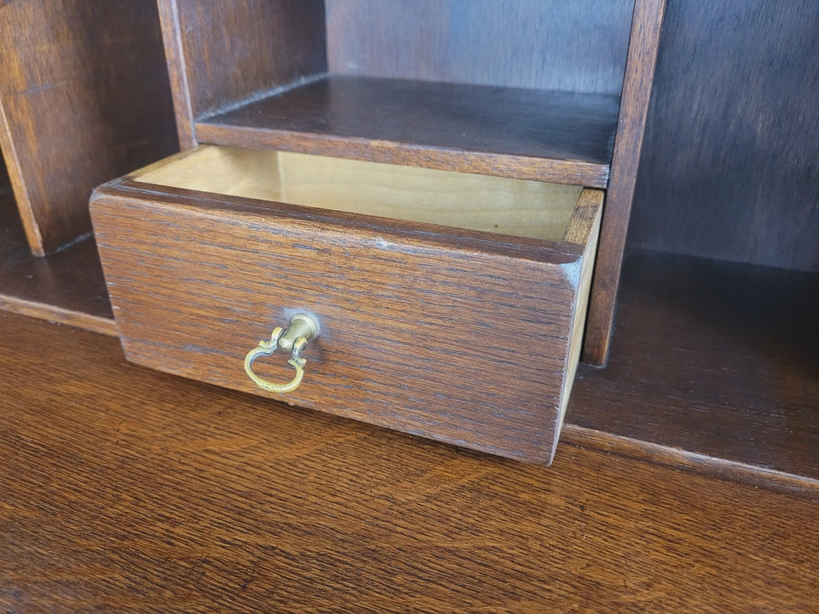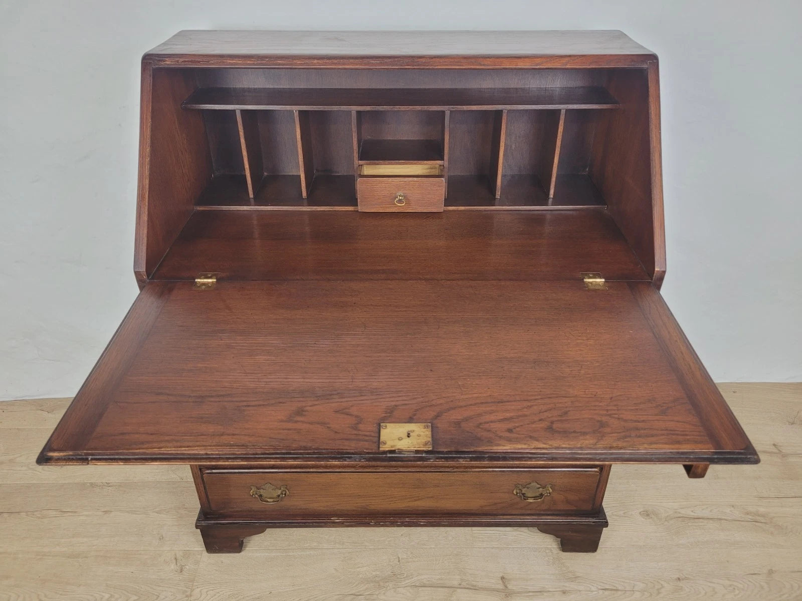 The fall front can be dropped, exposing a warm and rich oak desk, which can be held by the two smooth pull out supports.