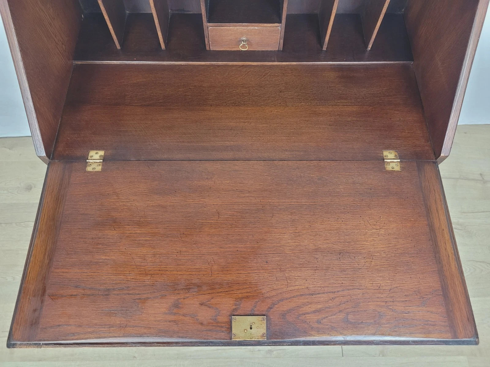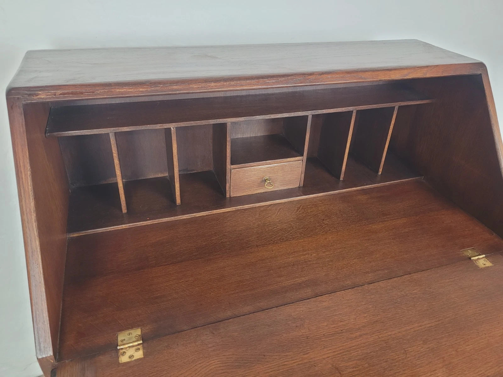 The interior has a large open pigeon hole to the top, with 7 smaller pigeon holes and a central small drawer that is finished with a metal handle. Perfect for storing documents, papers, books, or memorabilia.