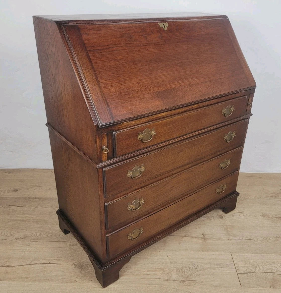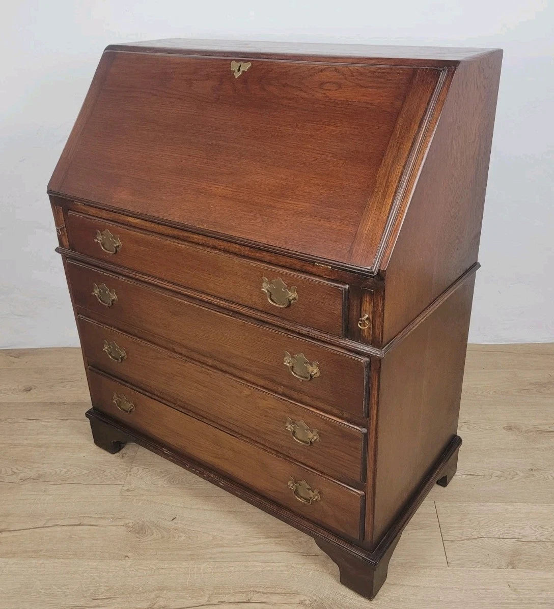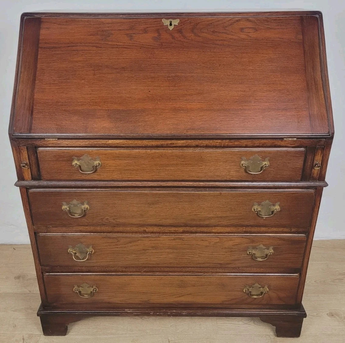 The bureau is standing proudly on 4 solid bracket feet, with a raised lower boarder surrounding the bureau.