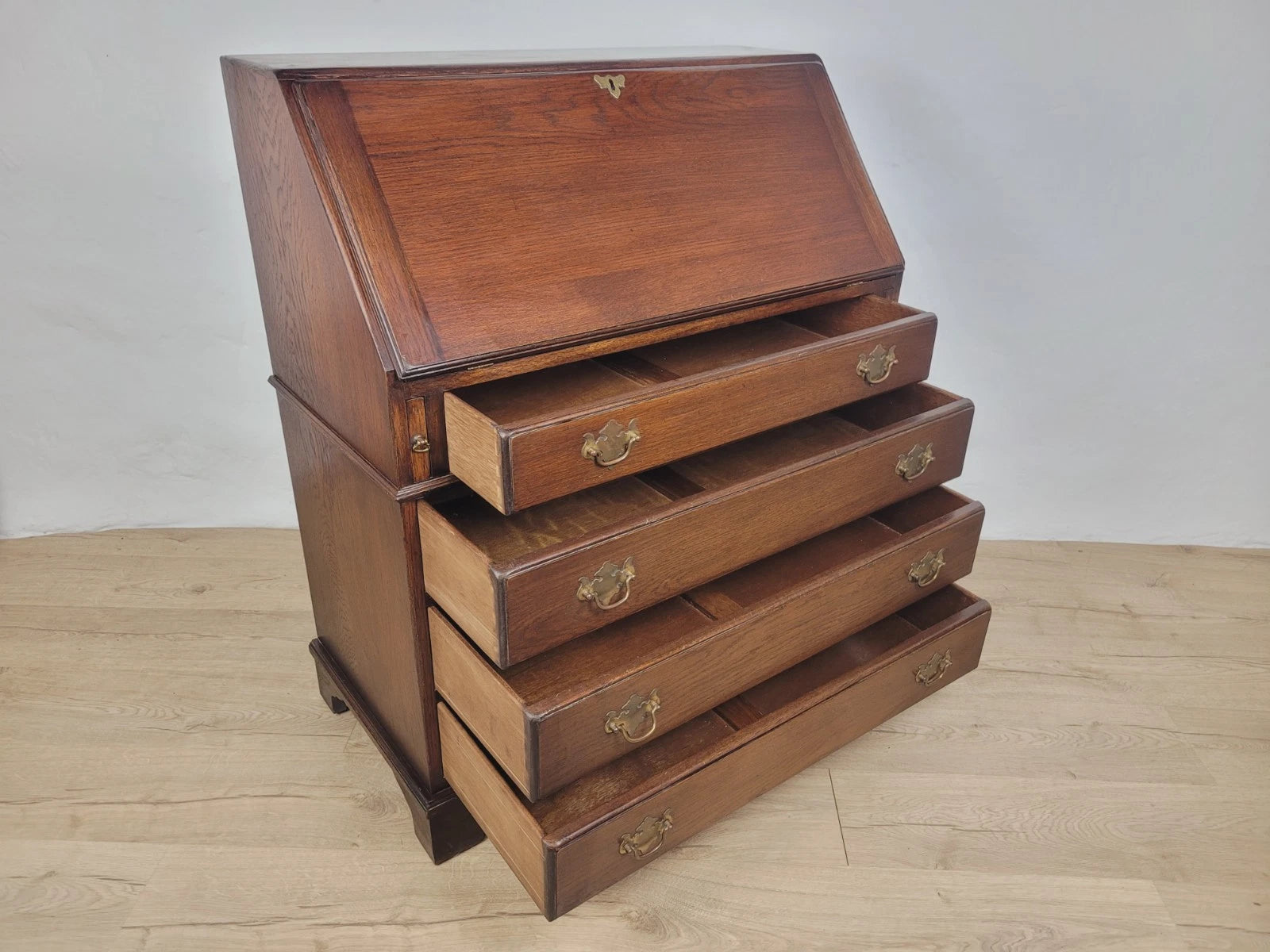 The front of the bureau has a small upper drawer, with three larger, more spacious drawers. There is a raised lip surrounding the drawers of the bureau.