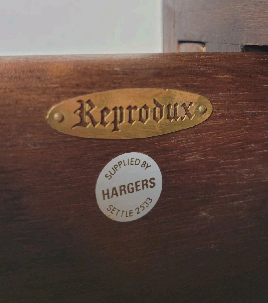 With the original 'reprodux' metal badge to the interior of the top drawer. Reprodux is a trade name for a line of furniture made by Bevan Funnell, a well-known British furniture maker. They are known for producing high-quality reproductions of antique furniture.