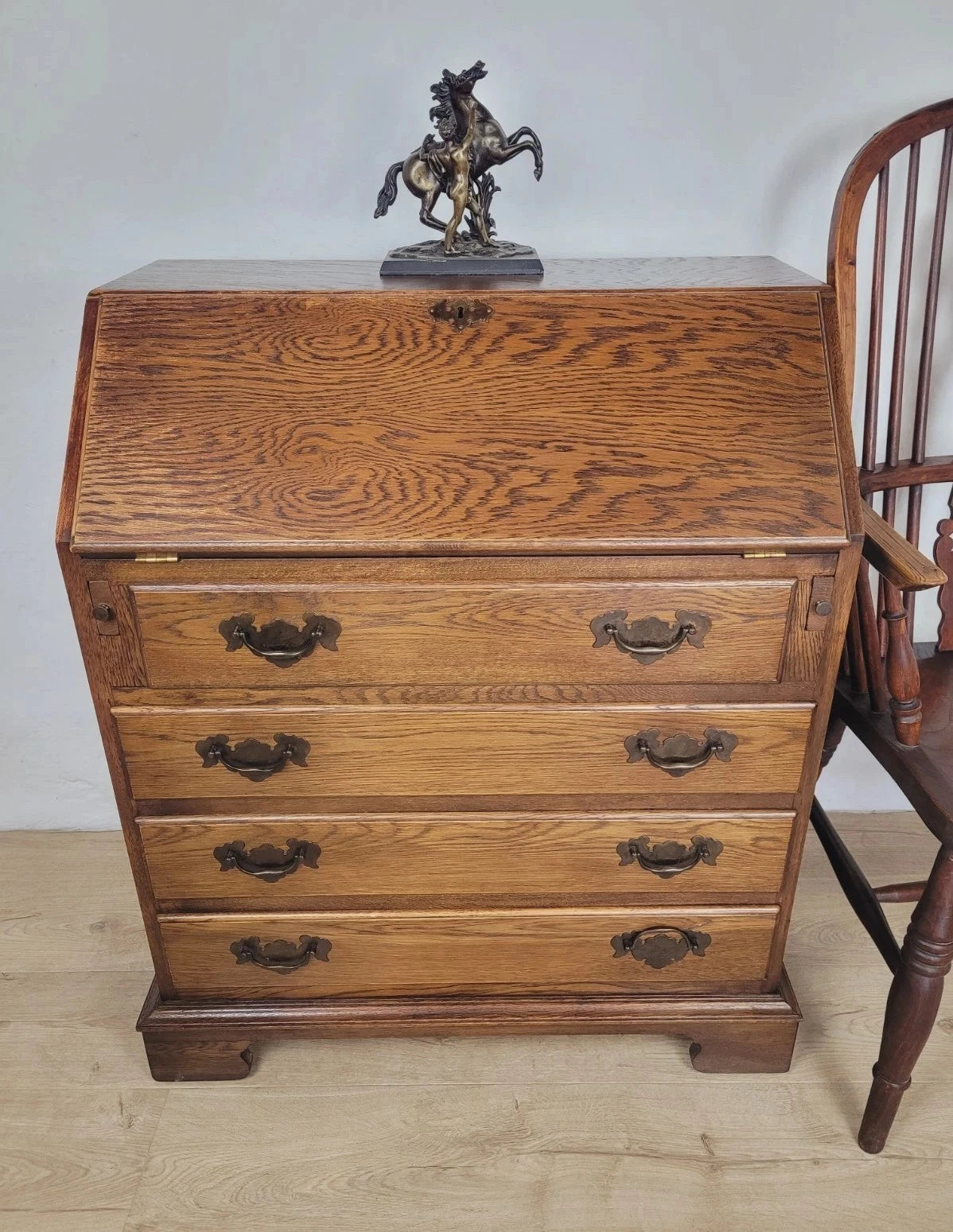 The drop front and drawers highlight the gorgeous oak patination to this excellent Vintage 1950's writing bureau.