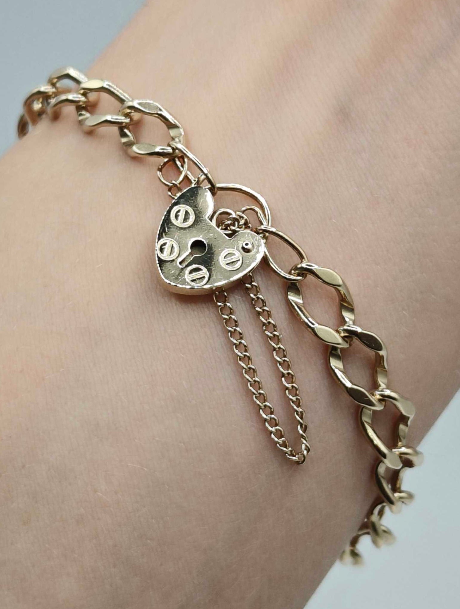This bracelet has been crafted in a beautiful curb link design that truly highlights the gorgeous golden yellow colour in the light, it comes with a heart-shaped padlock, plus a safety chain to ensure it all stays together.