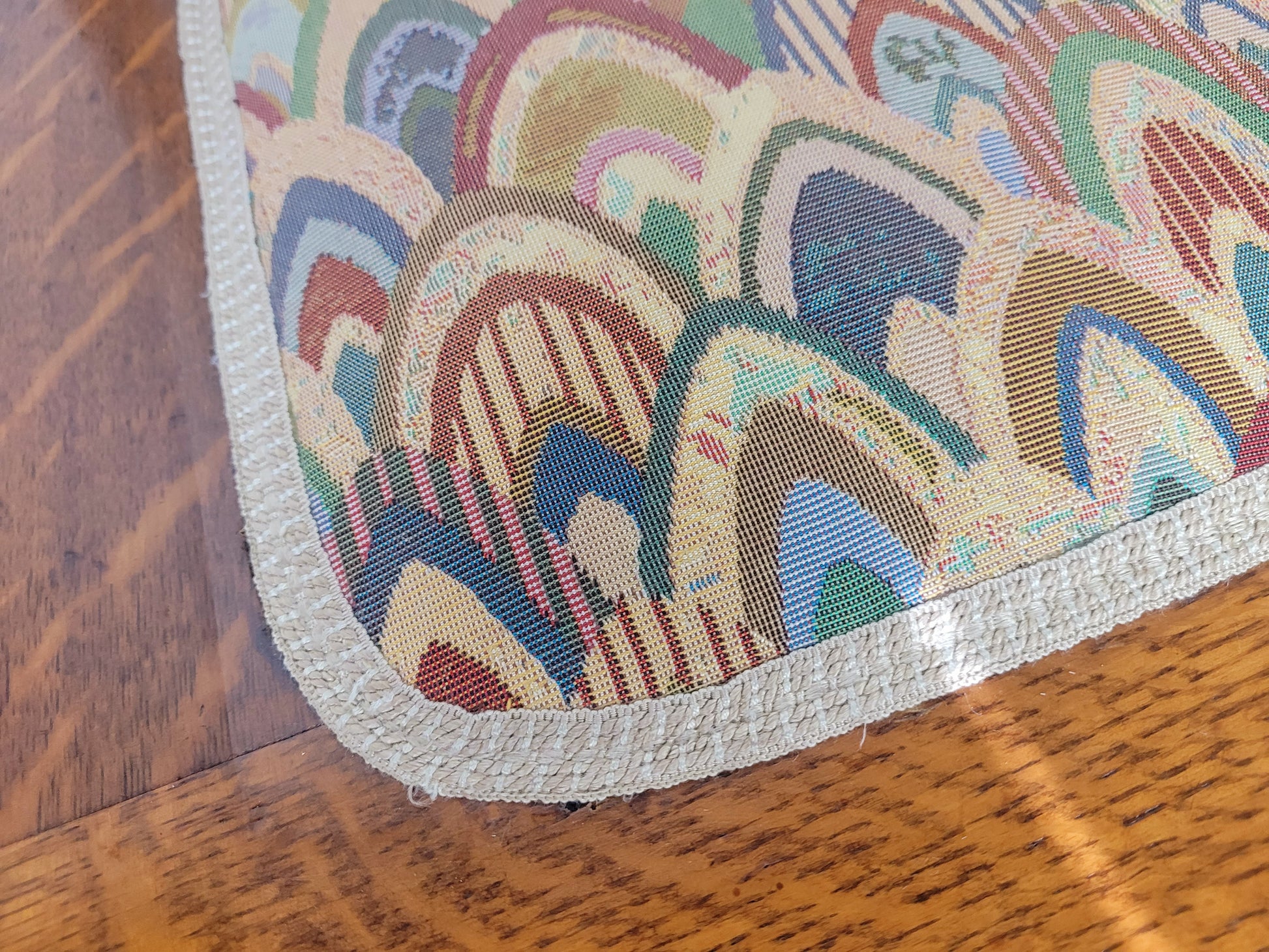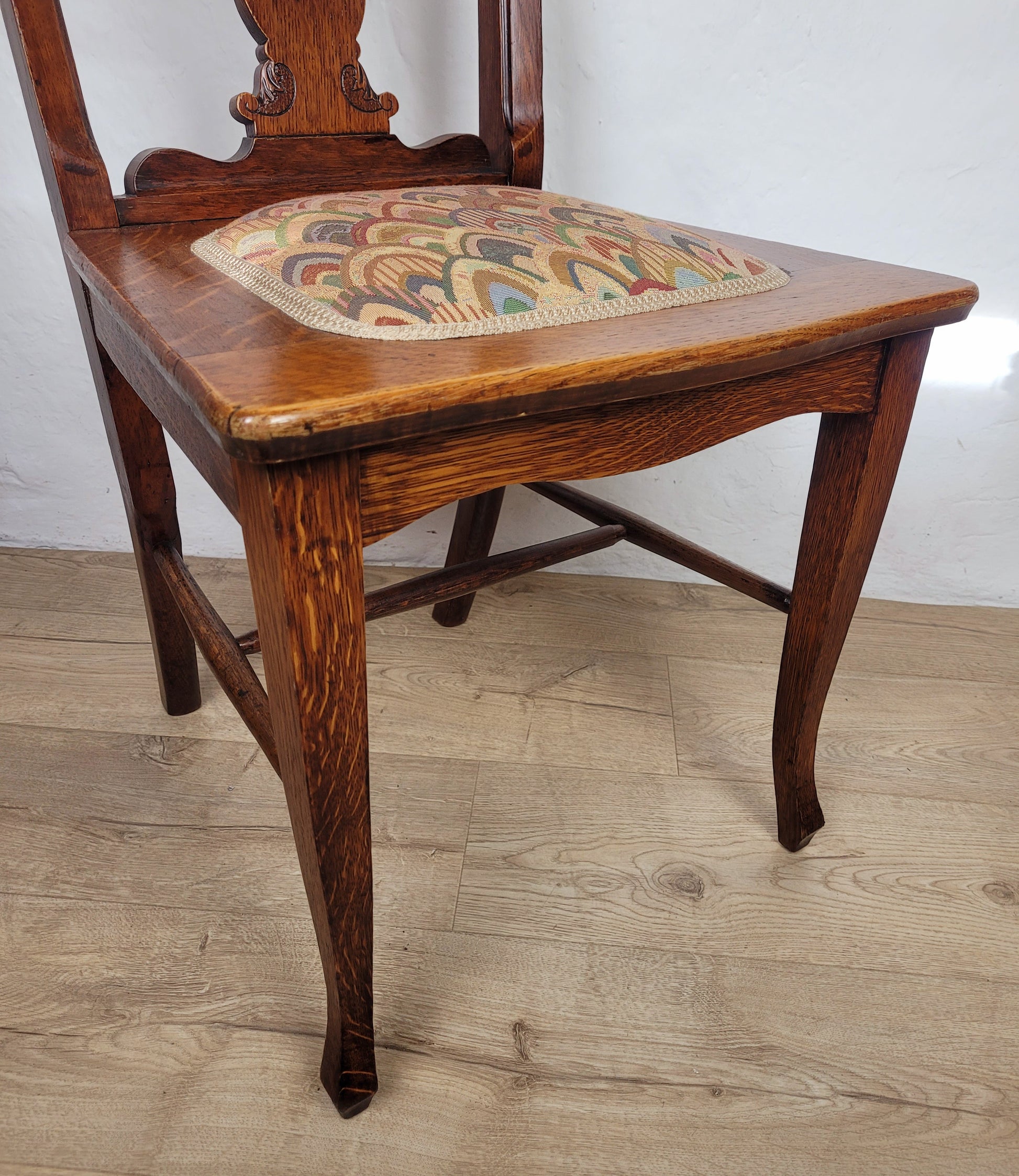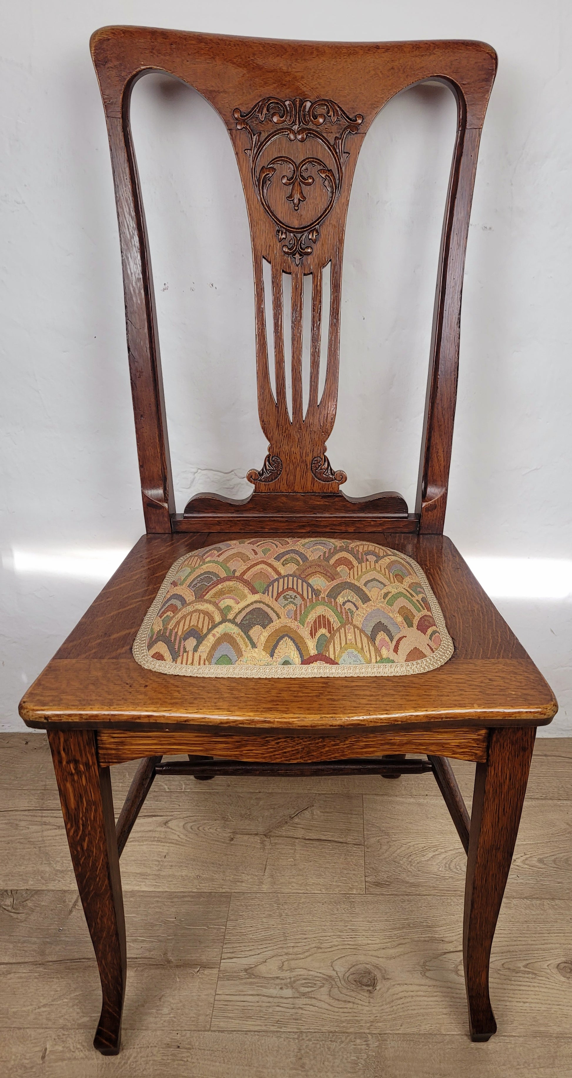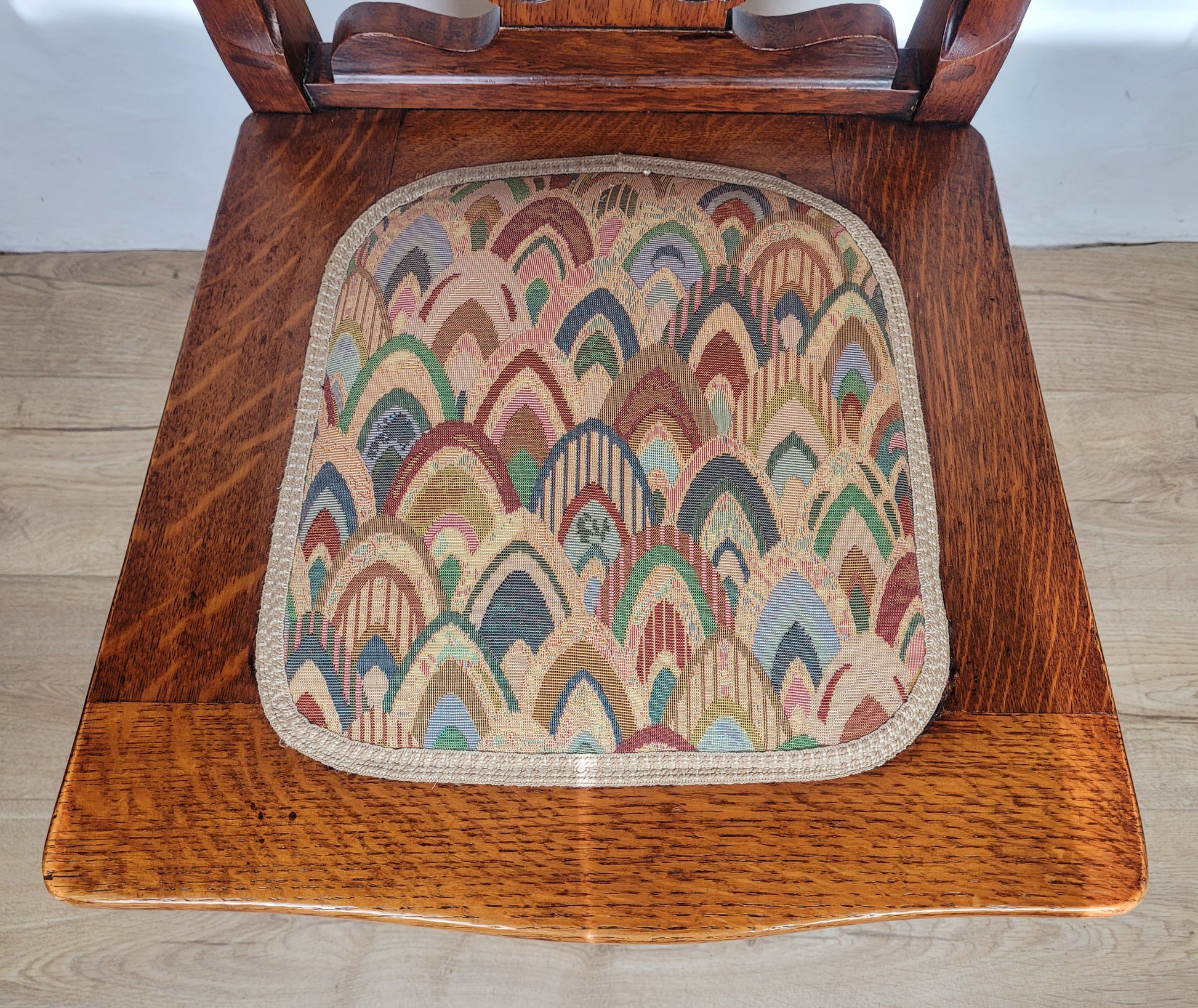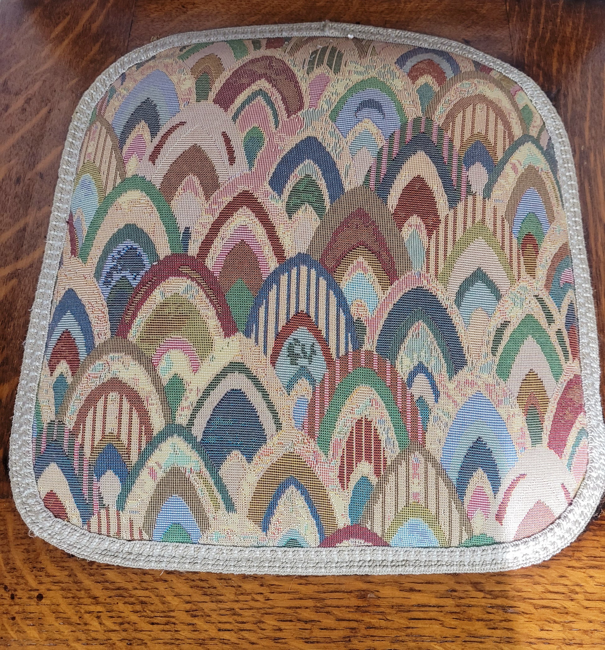 The chairs have square seats, with a mulitcoloured vintage pattern, finished with a matching brocade boarder.