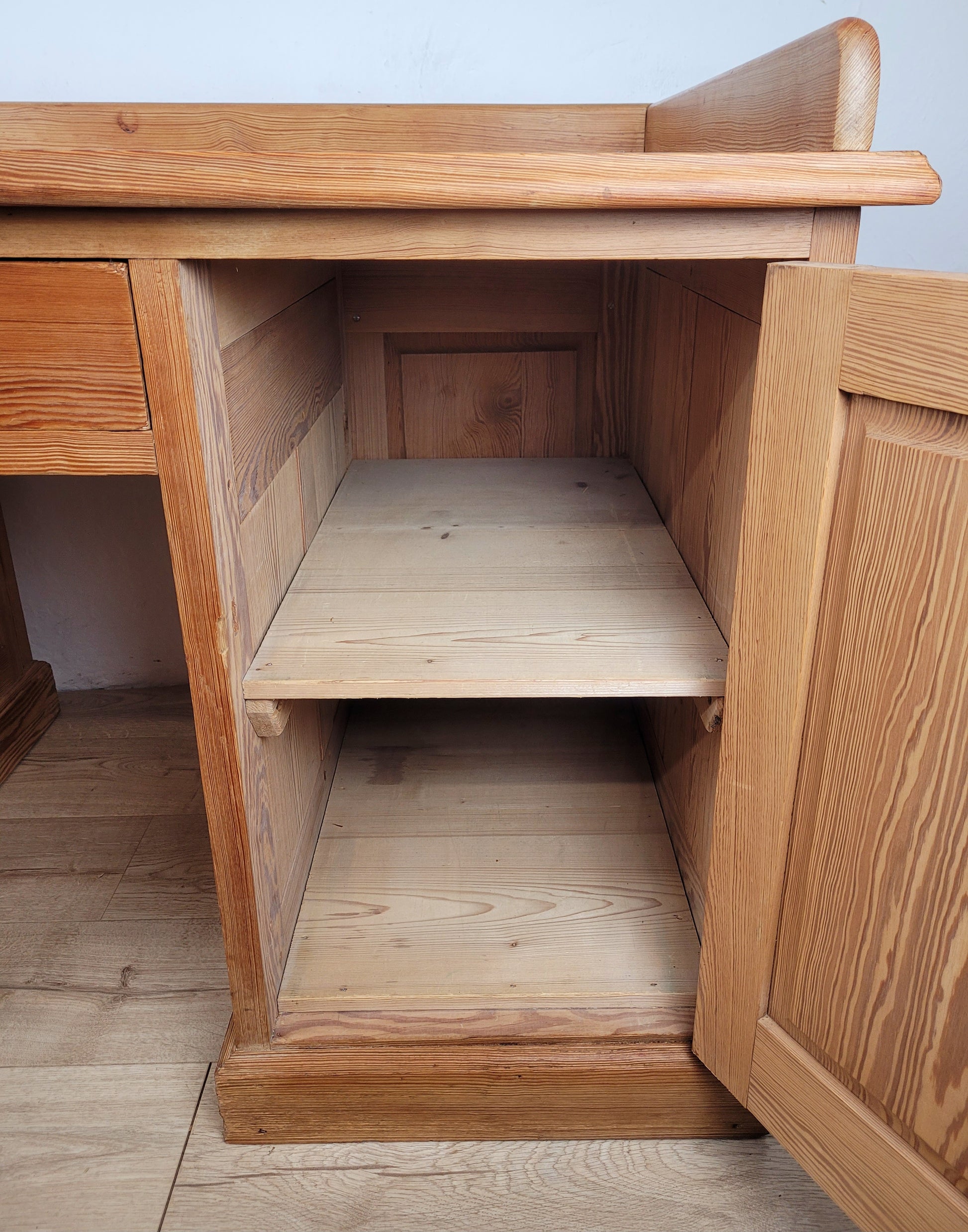 The right pedestal has door with a single useful shelf to the interior. (There is a lock but it doesn't work with the keys).