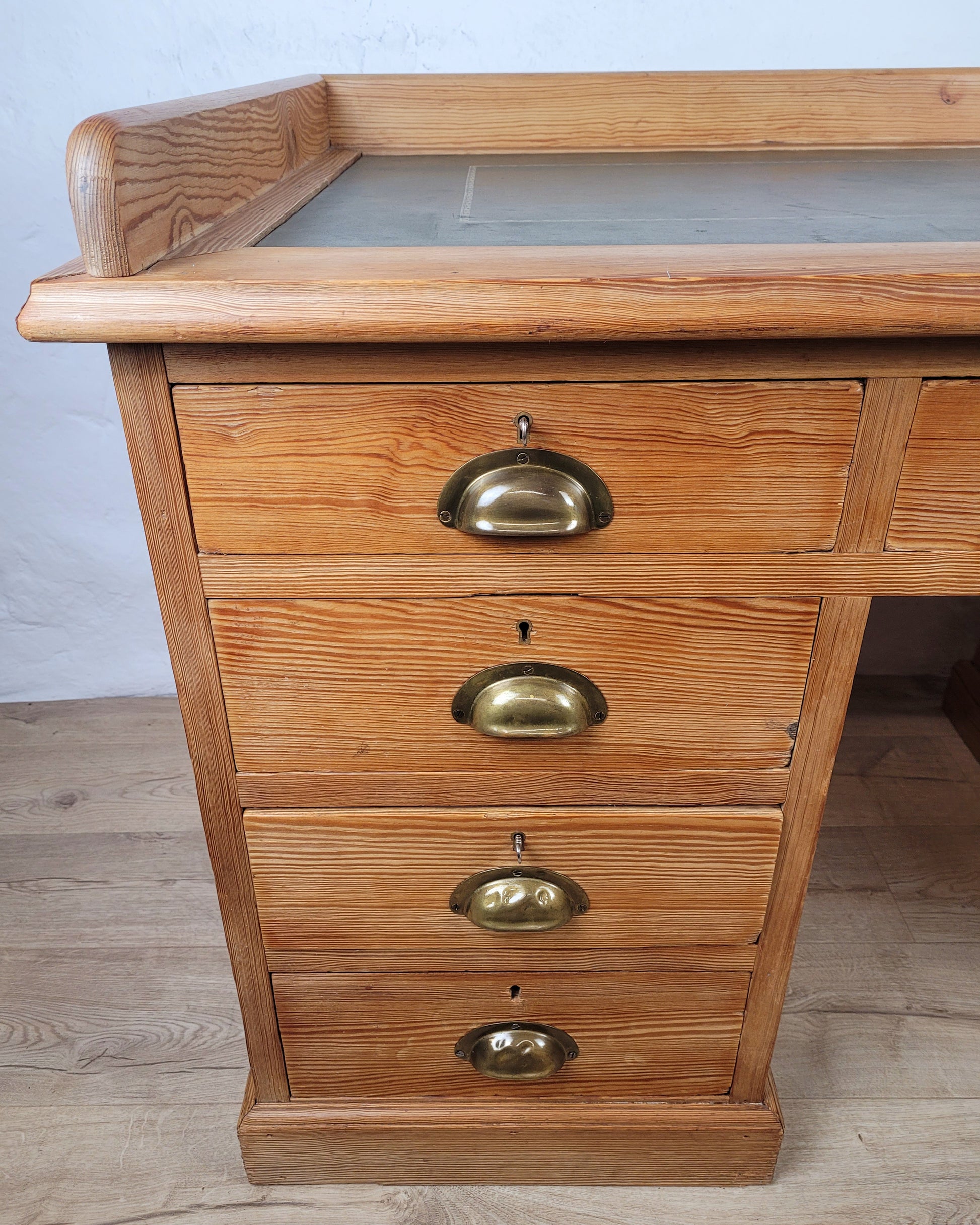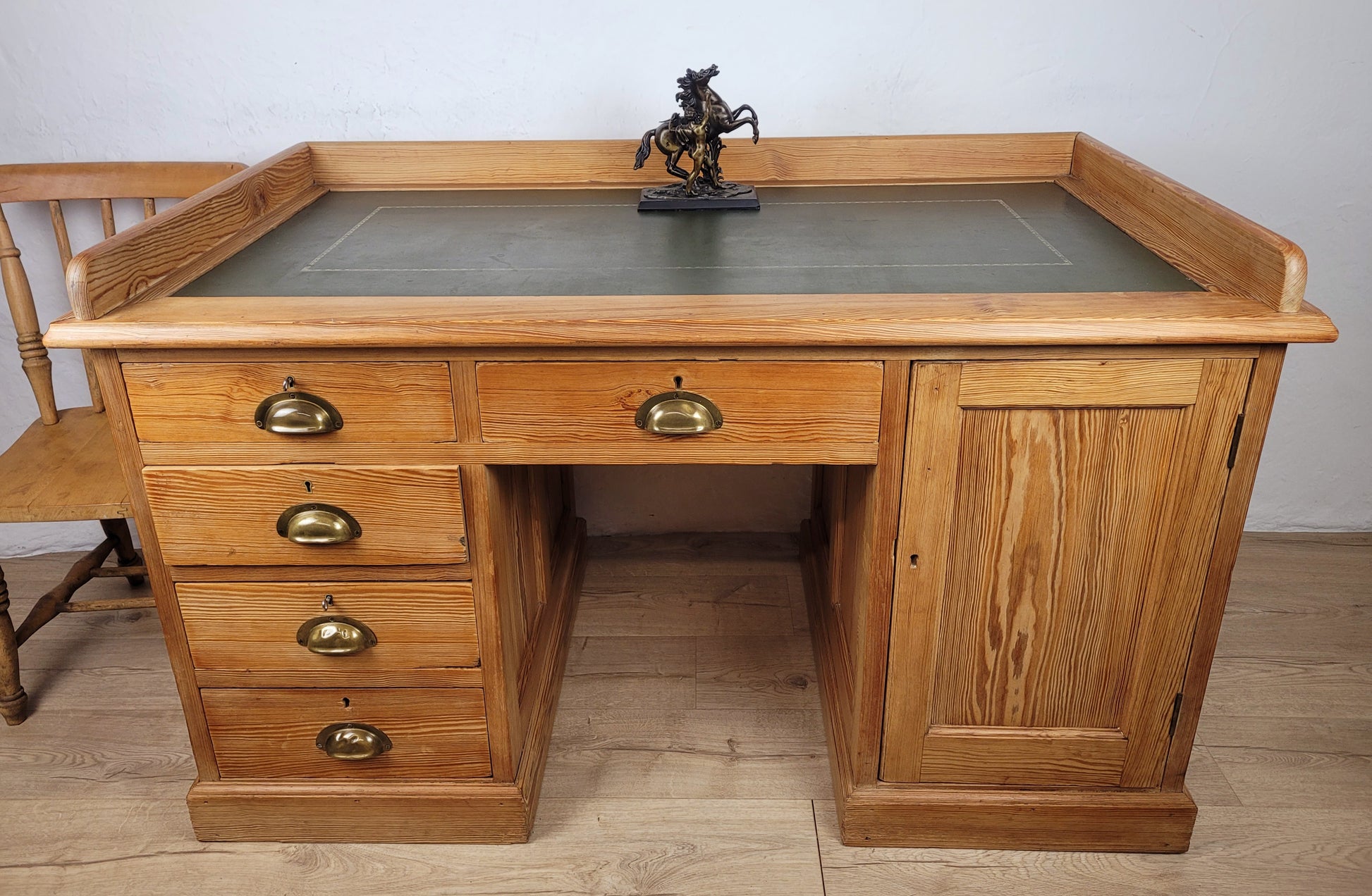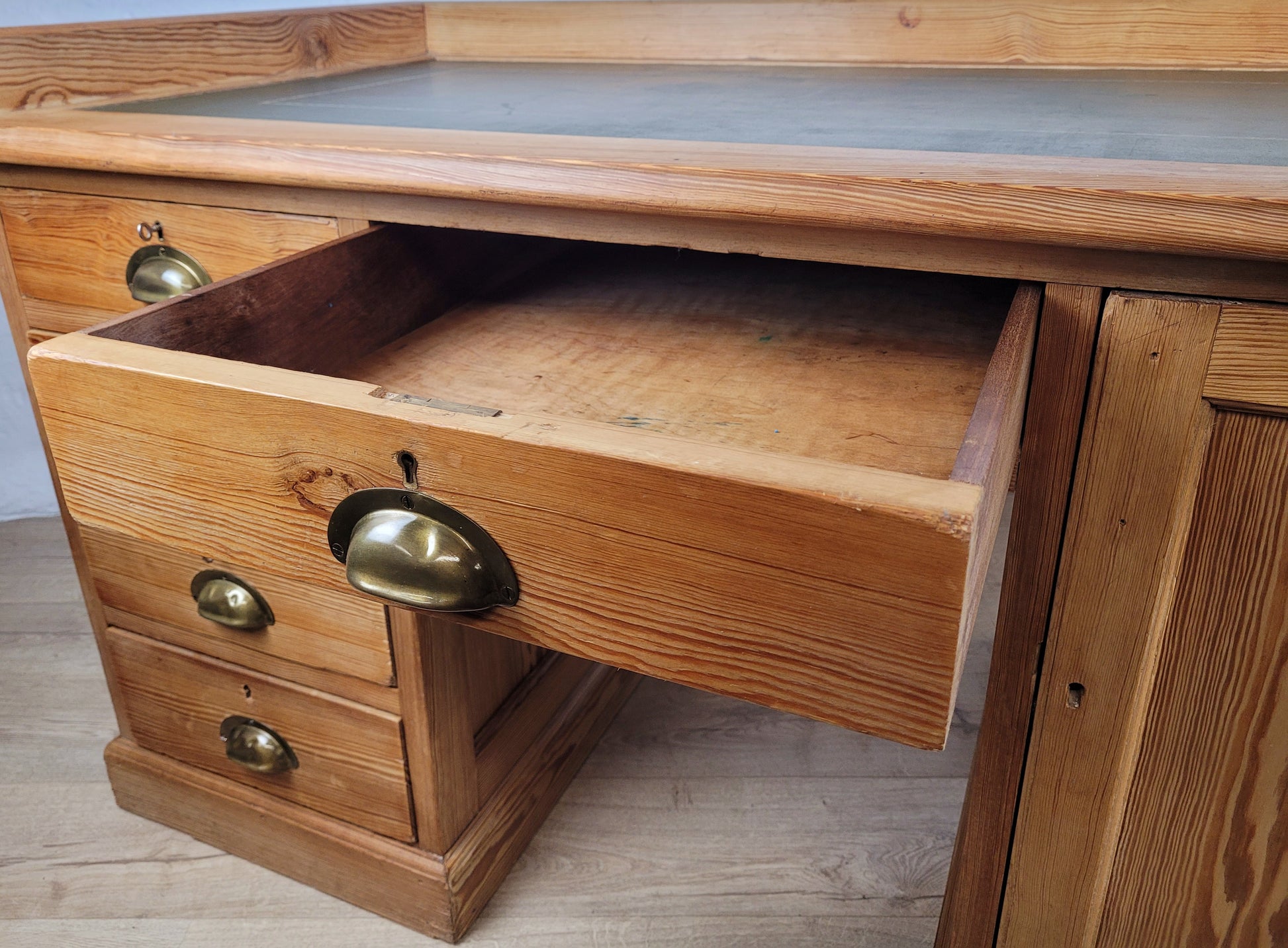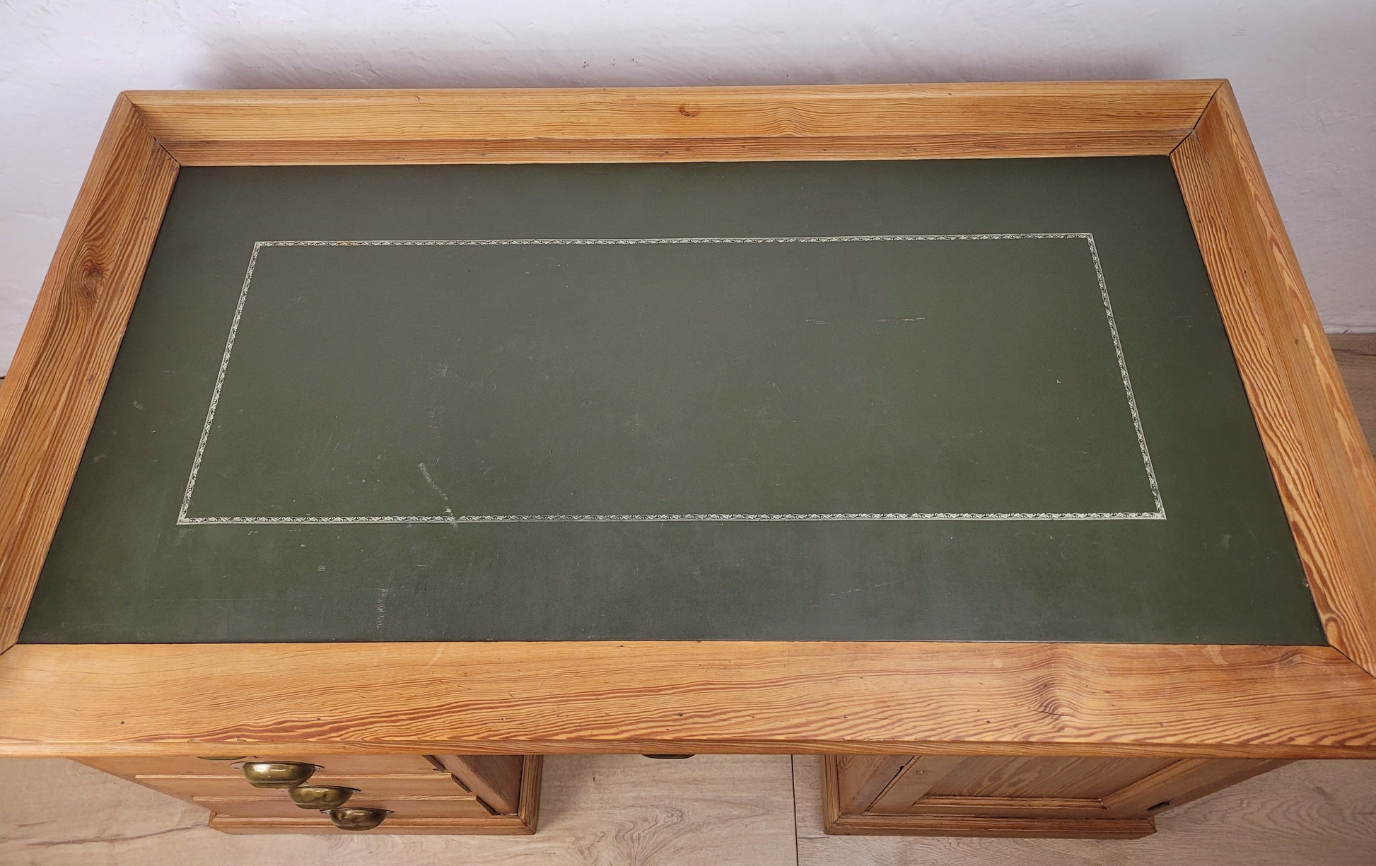 The desk has a large rectangular green leather desk top, with a floral finishing that surrounds the top. The desk top is finished with gorgeous tall pine boarders. The desktop and boarder can both be removed by the screwed metal brackets underneath, for transportation. (see photographs)