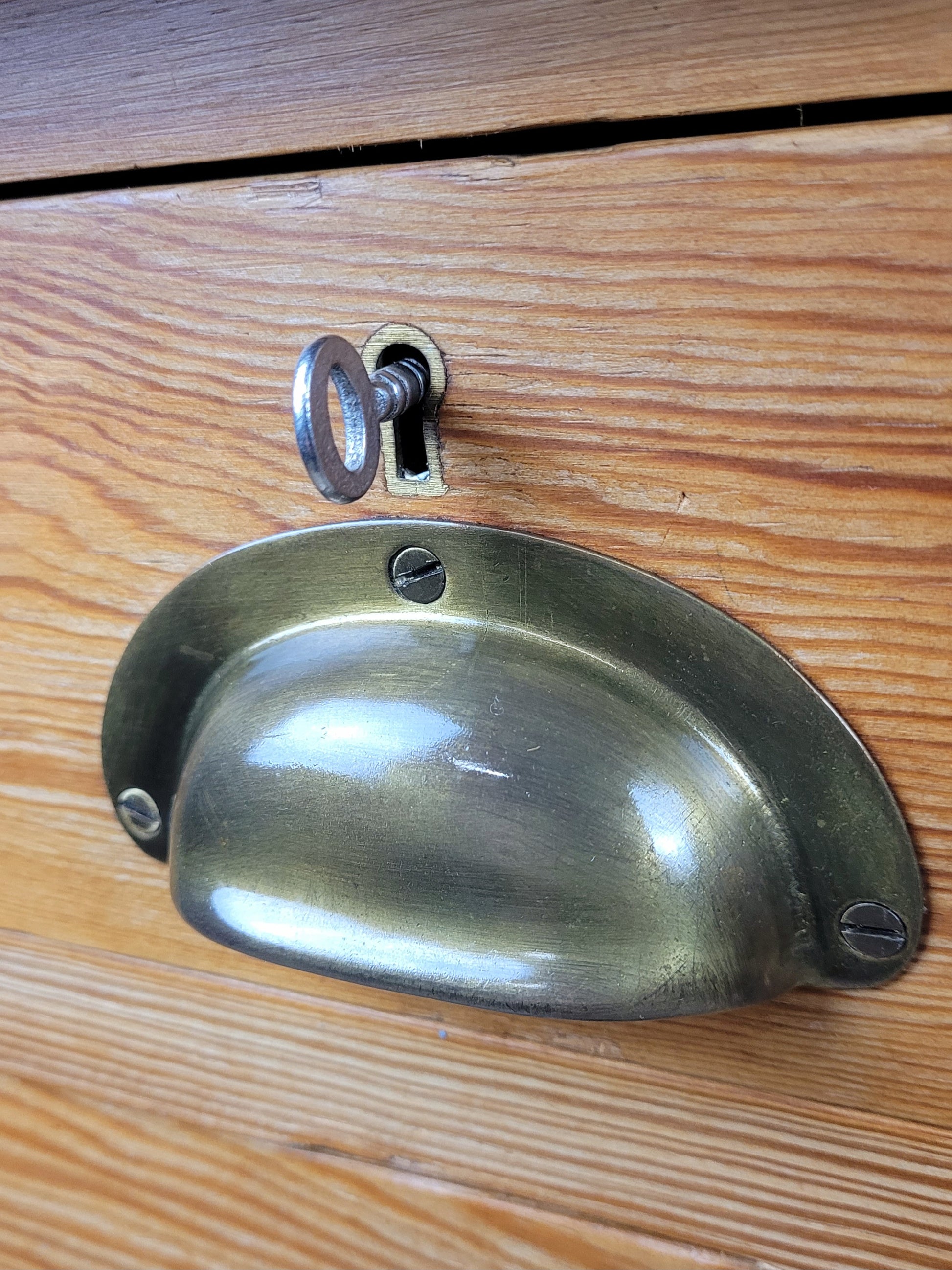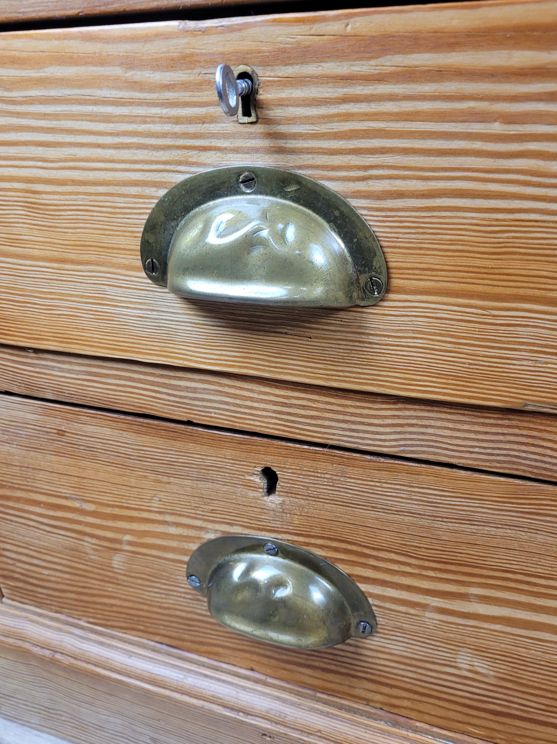 The drawers are finished with gorgeous brass domed handles, and two keys which keep 2 of the graduating drawers each locked.