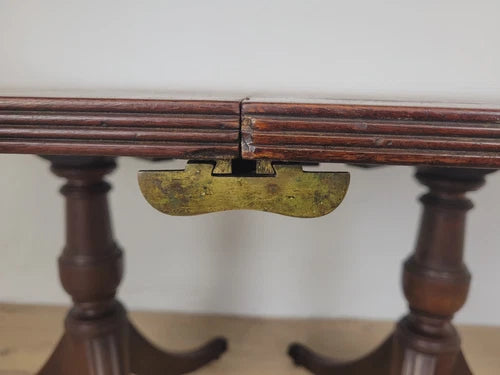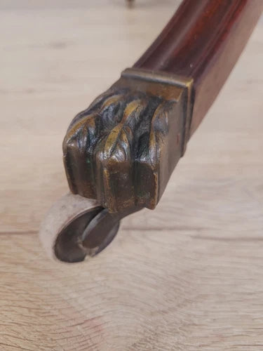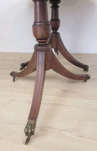 The two table halves lead down to solid turned plinth bases, leading down to elegantly carved tripod legs. The legs are all finished with metal lion paw castors, and excellent rolling feet.