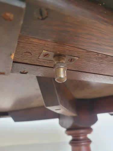 To extend the table one, or two additional mahogany inlaid leaves can be added. The table extensions fit into the table top and are secured with metal caps in holes, and with the metal brackets. To the underside of the table are two sliding long mahogany shaped planks, used to support the table leaves on the top.