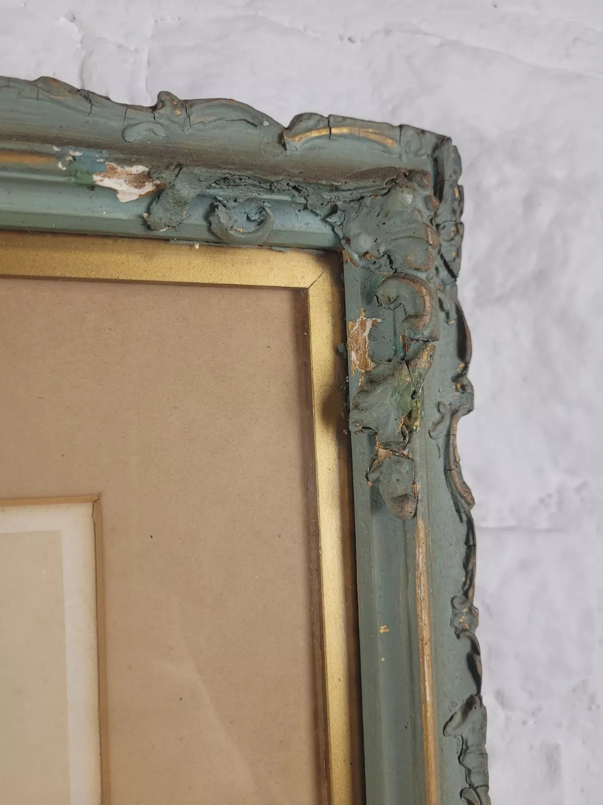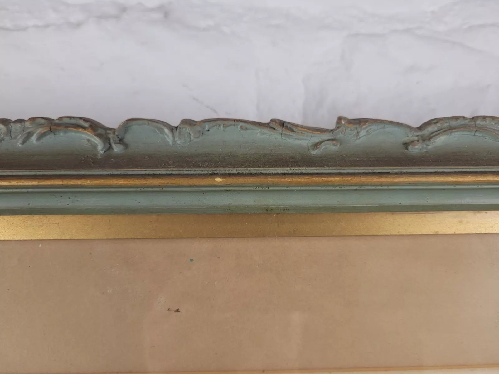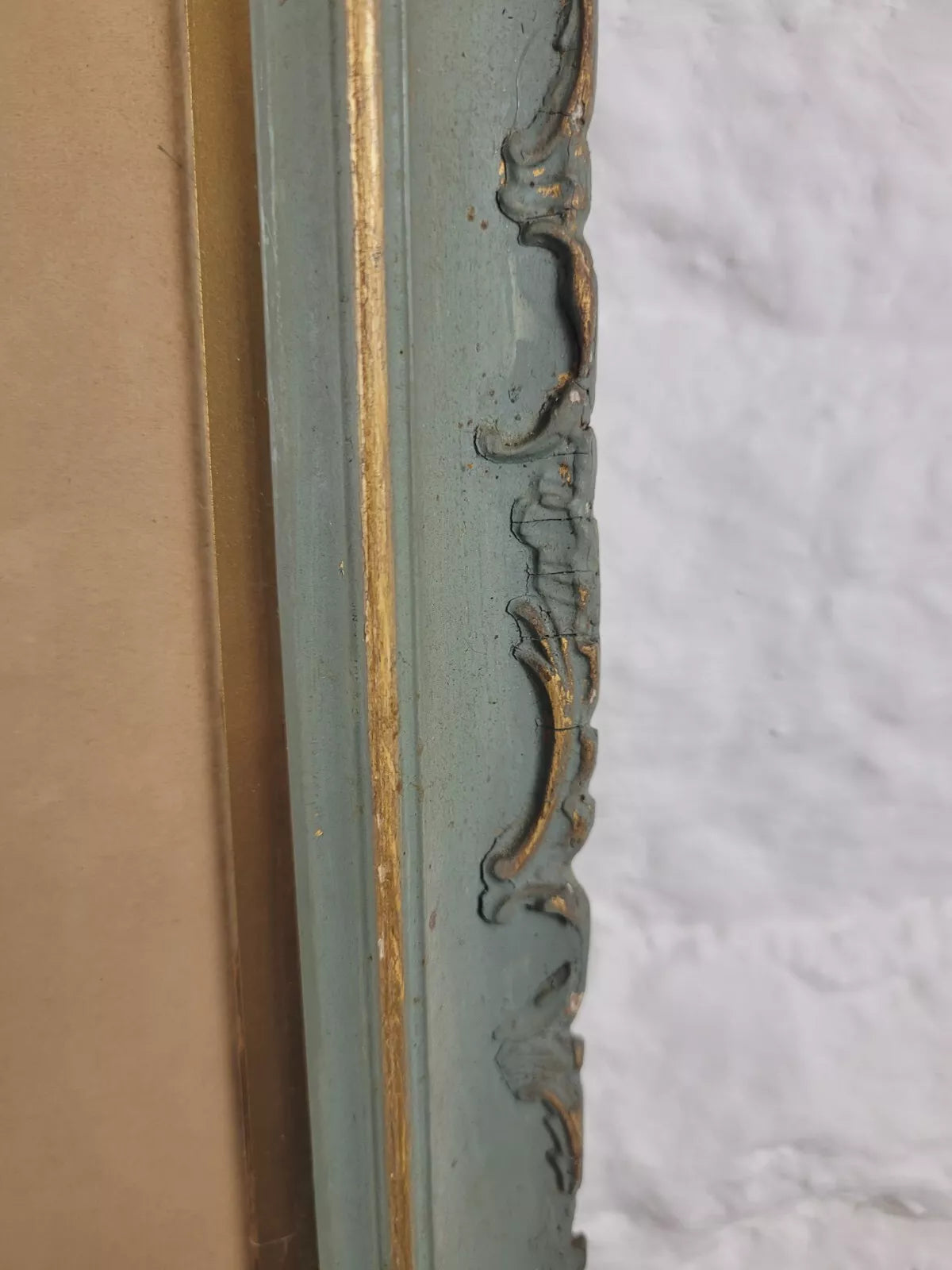 The picture has been glass framed with a hand painted light blue and gilt frame, finished with intricate floral detailing that reflect the gorgeous nature of this frame.