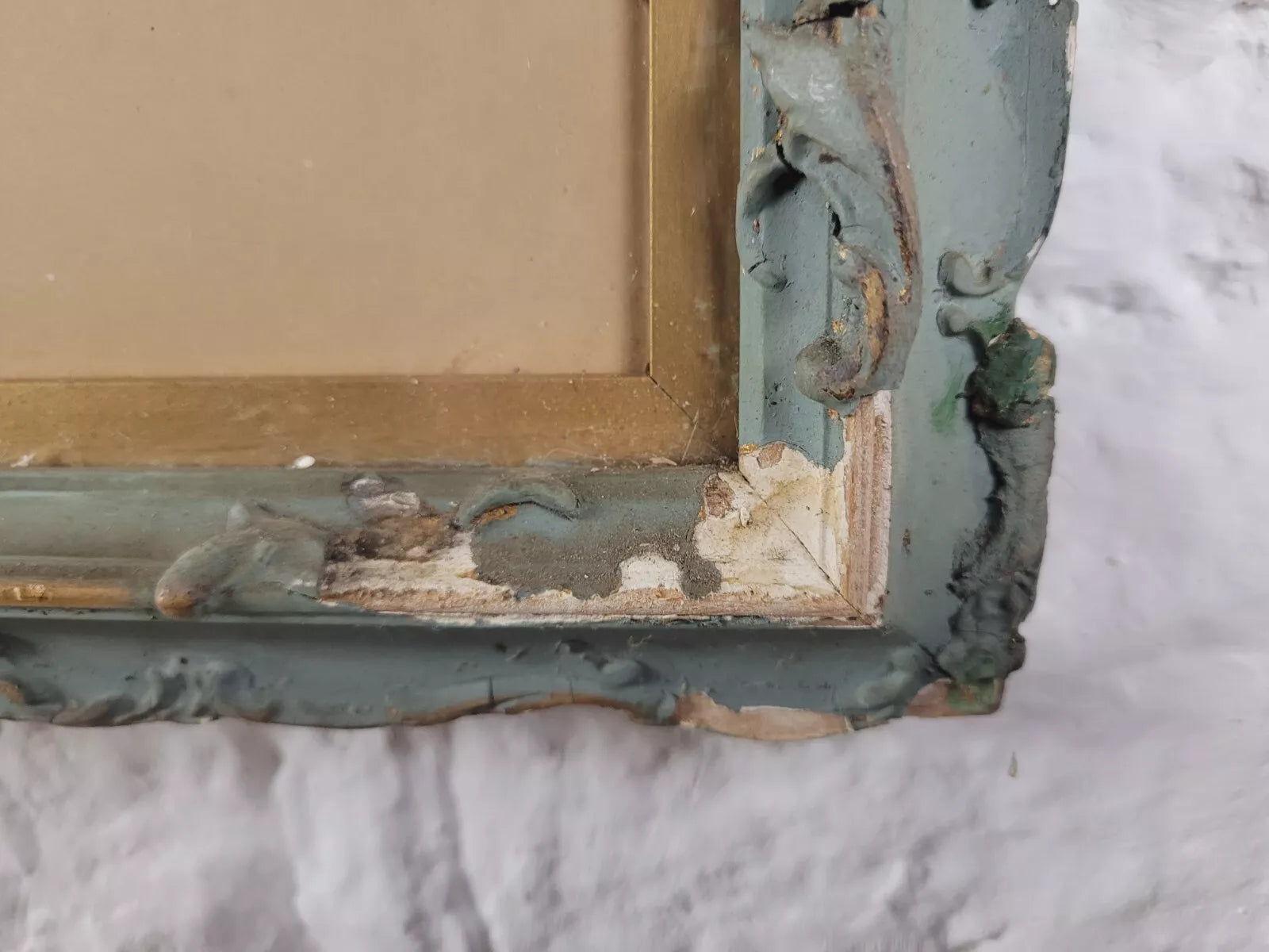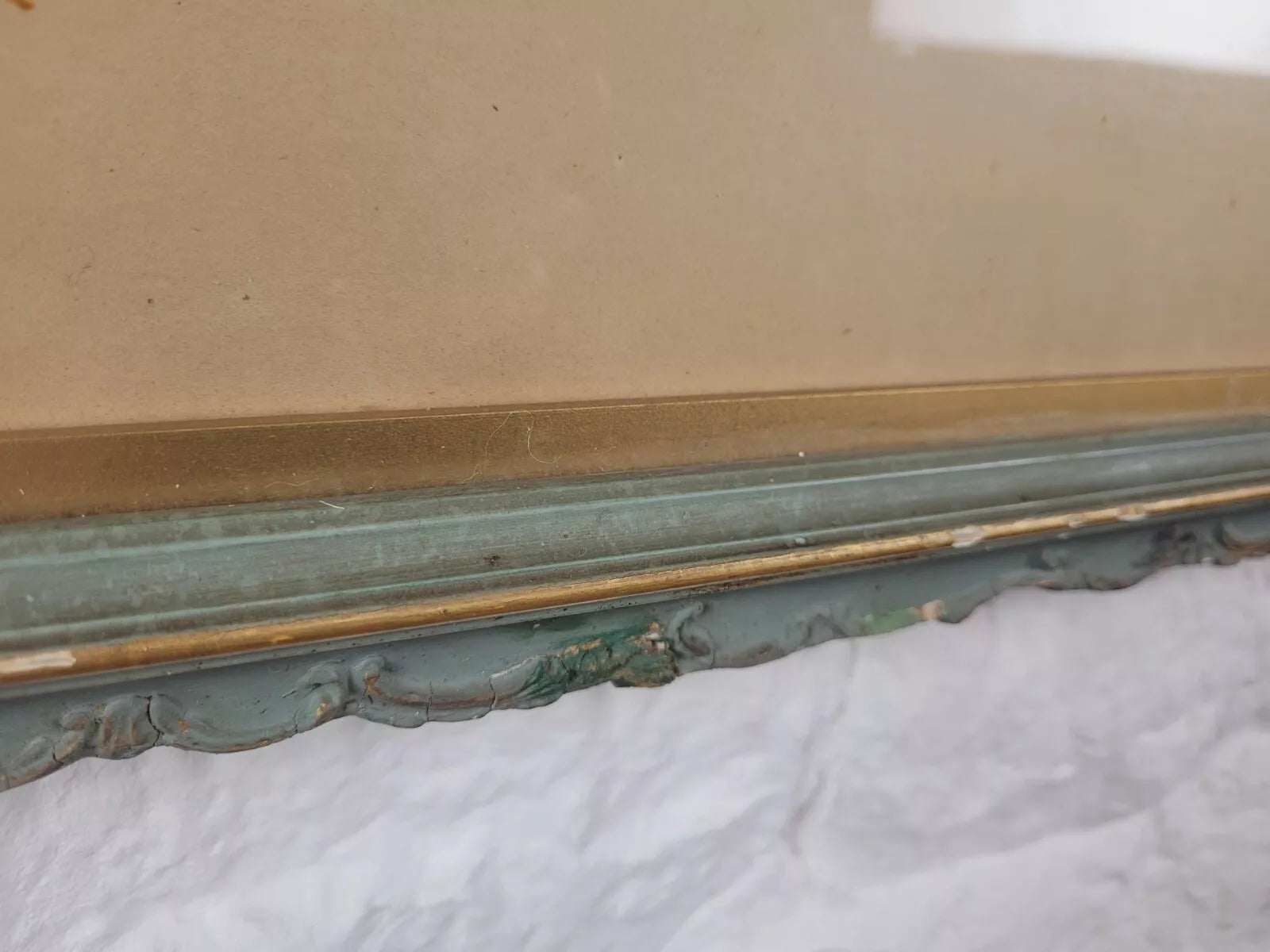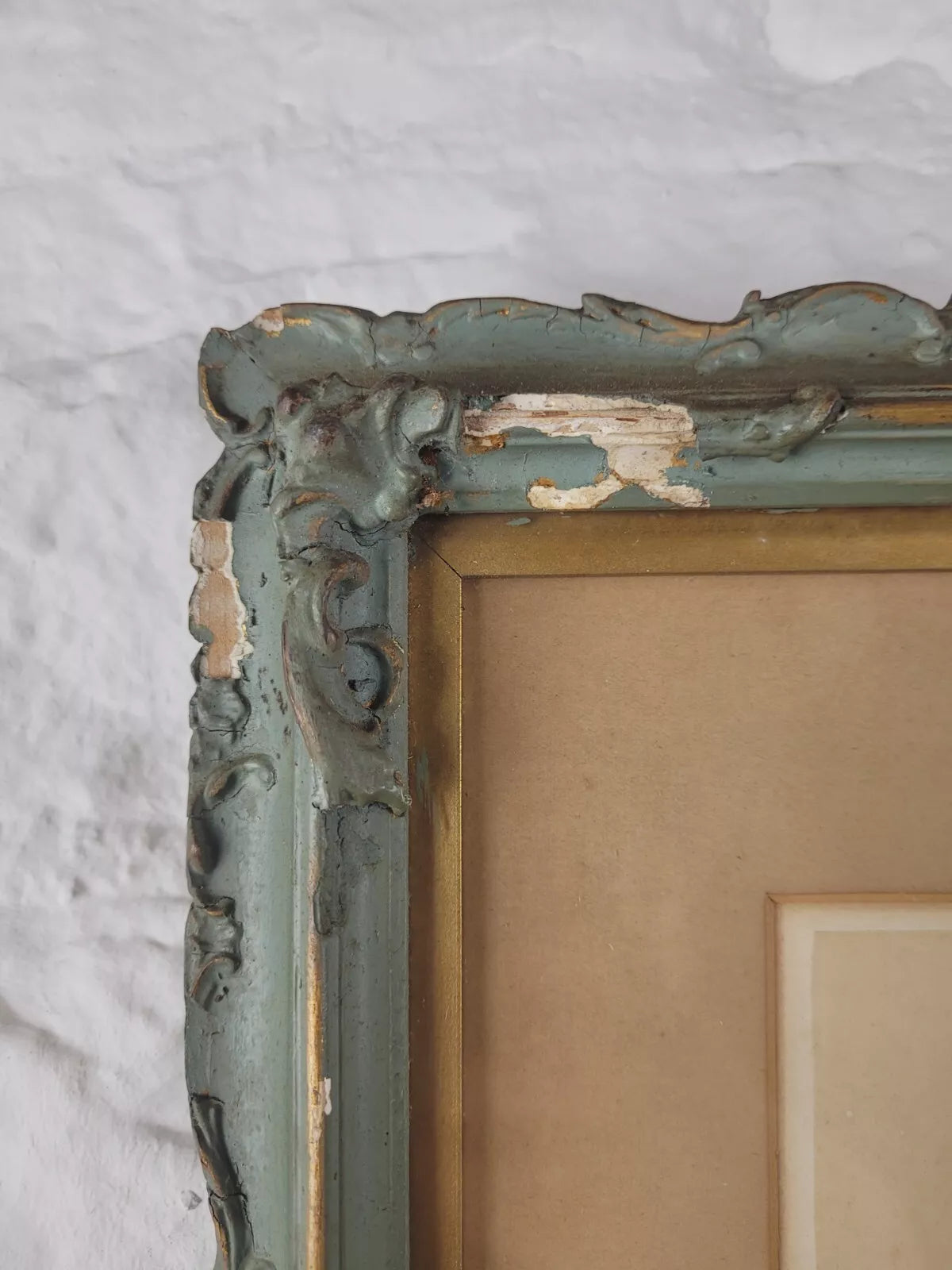 The picture has been glass framed with a hand painted light blue and gilt frame, finished with intricate floral detailing that reflect the gorgeous nature of this frame.