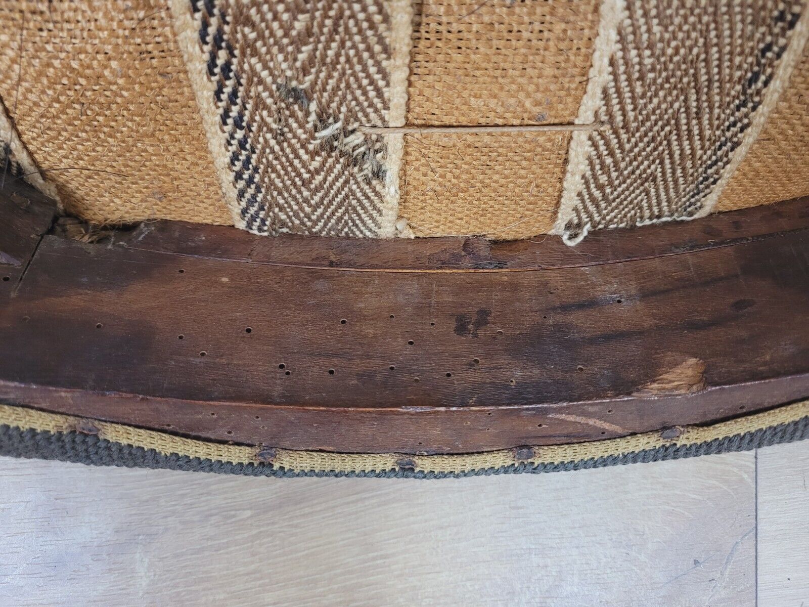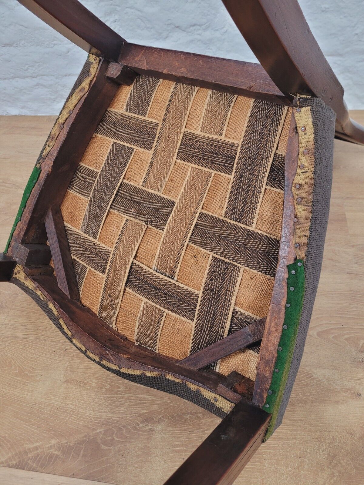 The upholstered seat is worn with holes, and has green fabric exposed to either side of the upholstered seat (see photographs).