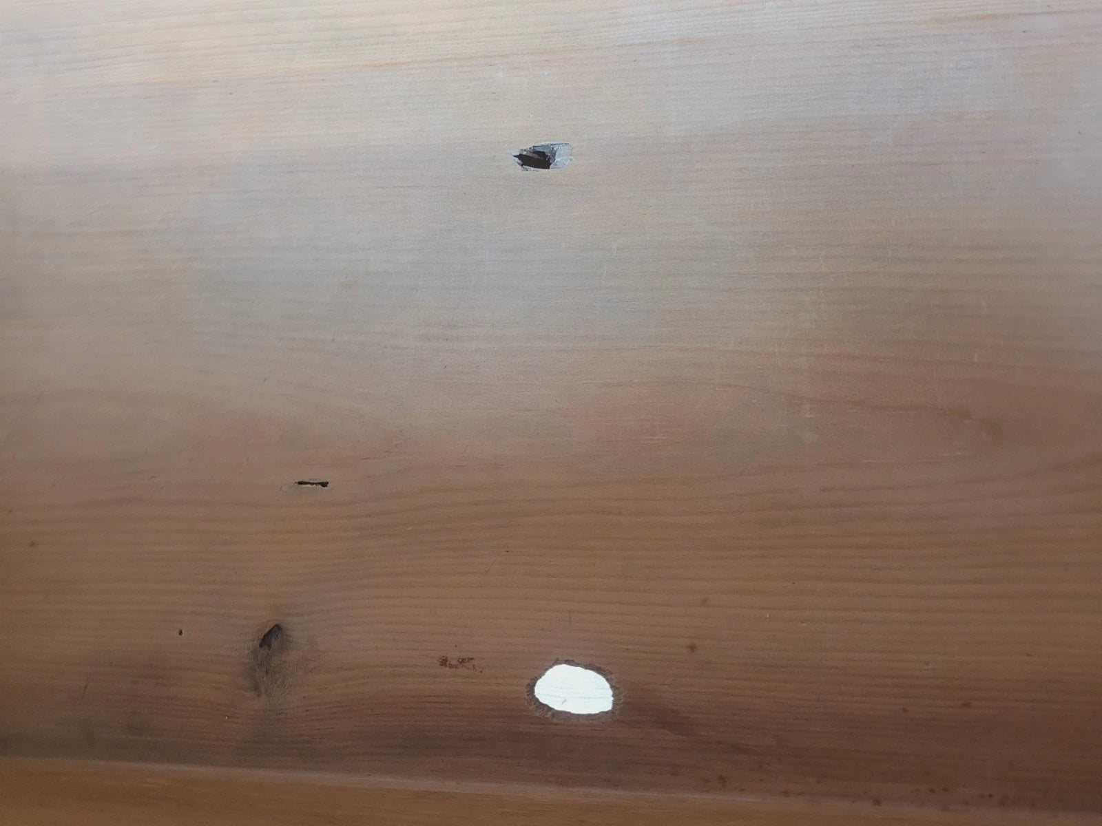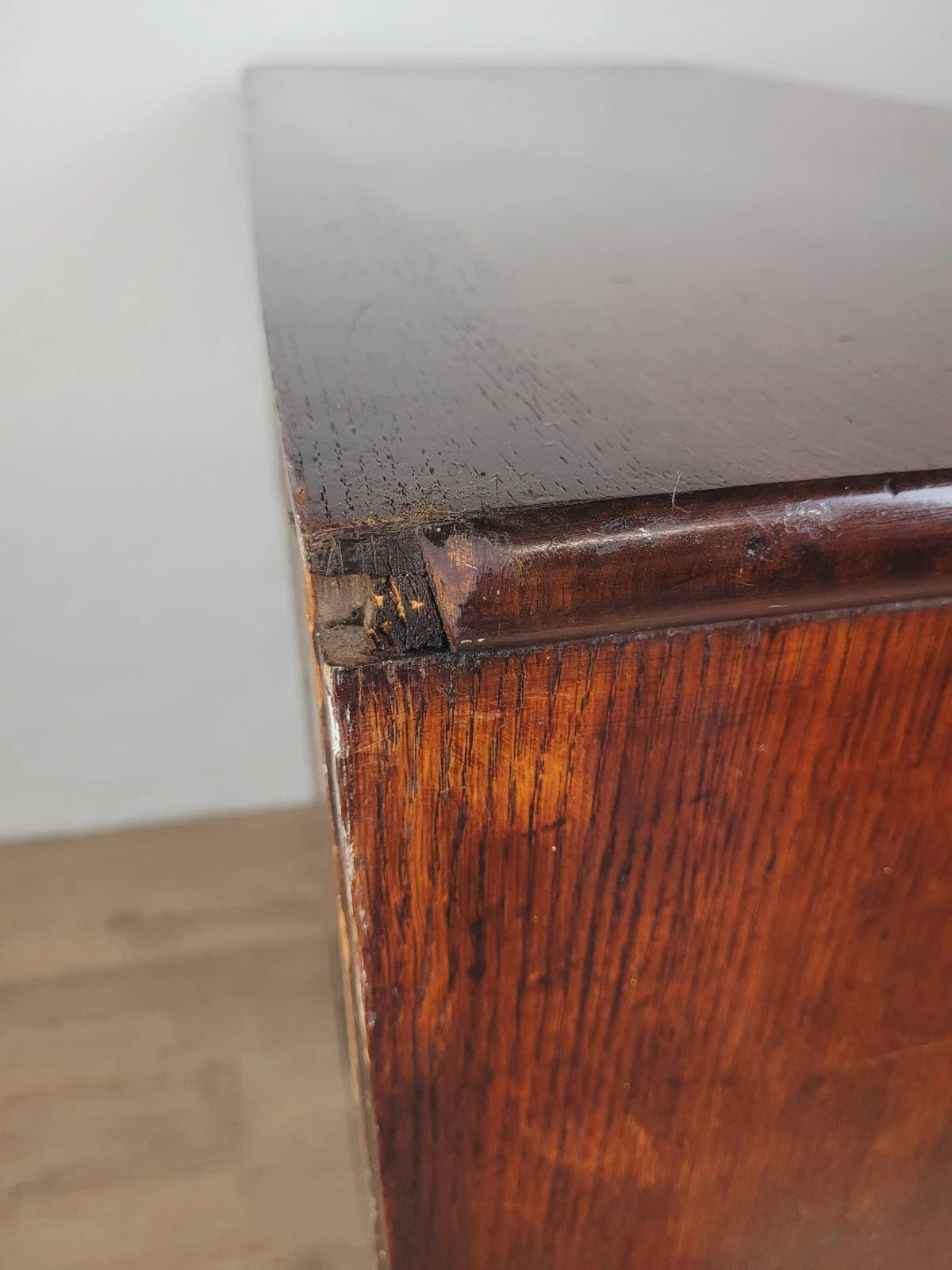 There is wood missing to the upper boarder of the chest to the back left corner, right corner and back right corner (see photographs).