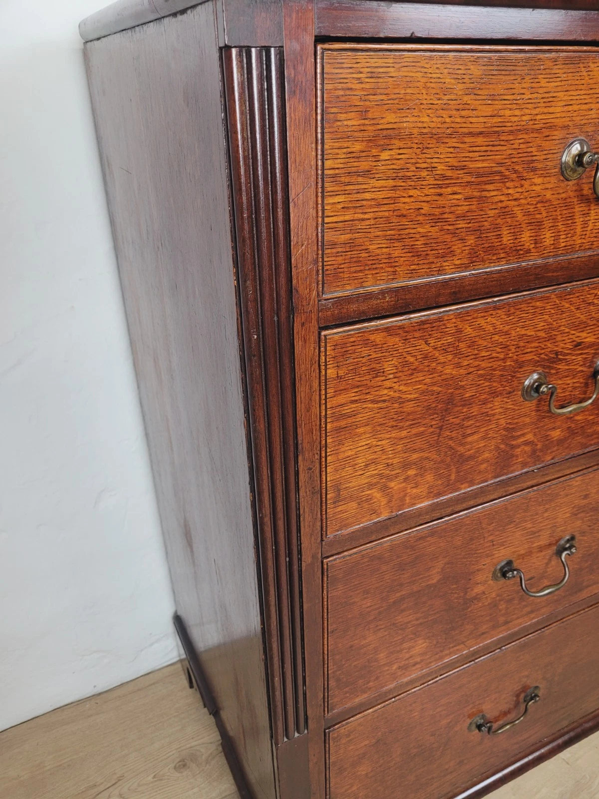 The chest front has an beautiful arrangement of two short over three large graduating drawers. Each drawer has striking matching brass drop handles, with a carved boarder to finish. The drawers have striking key holes, unfortunately there is no key, but this does not effect the functionality of the item at all.